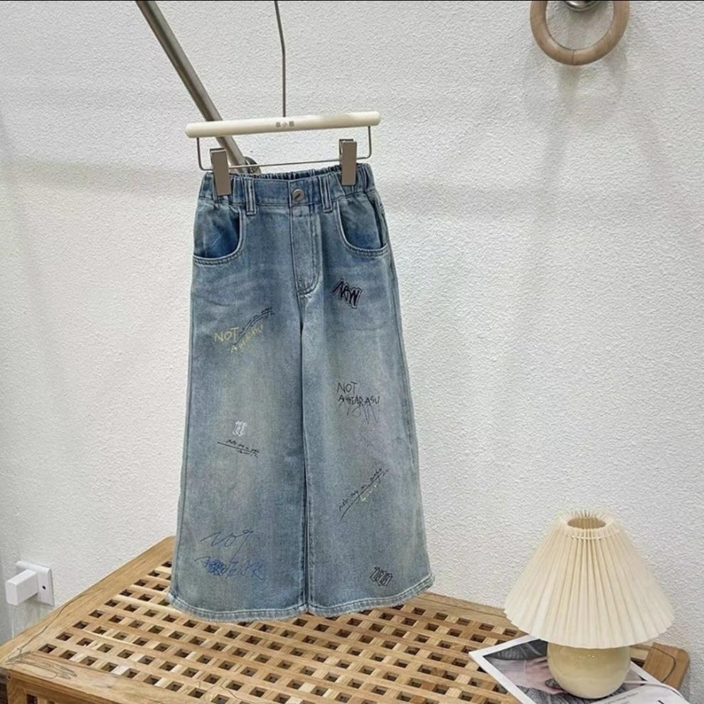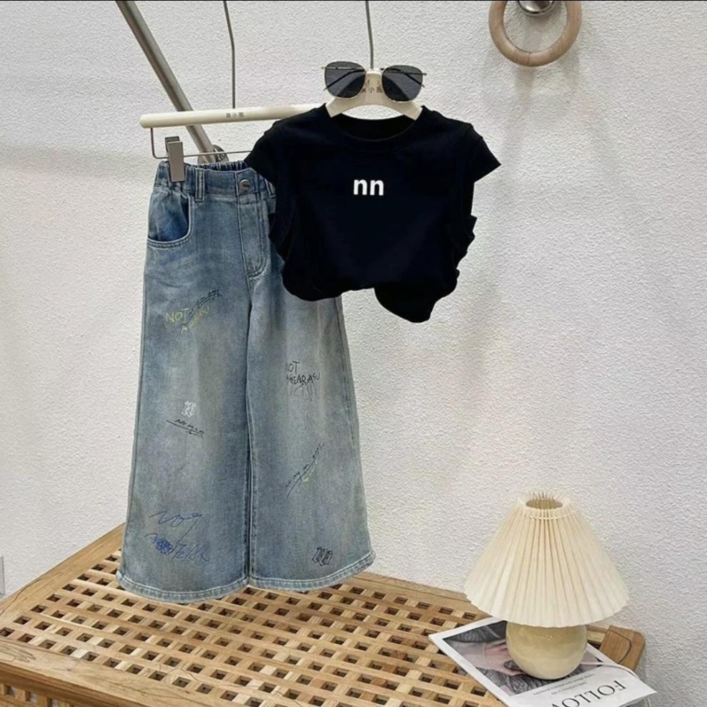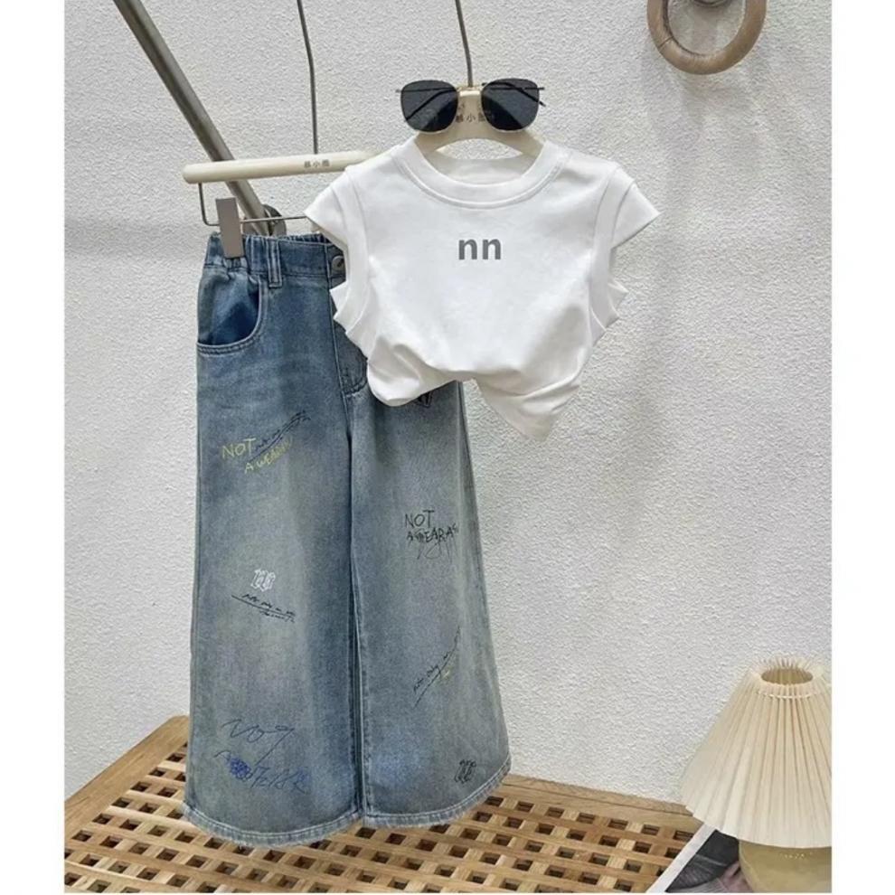 여자 여름 정장 2025 새로운 중대형 어린이 스타일 티셔츠 여름 낙서 청바지 투피스 여름 정장스토어 가기