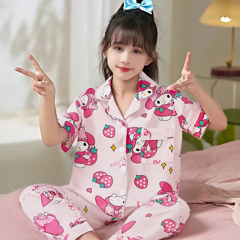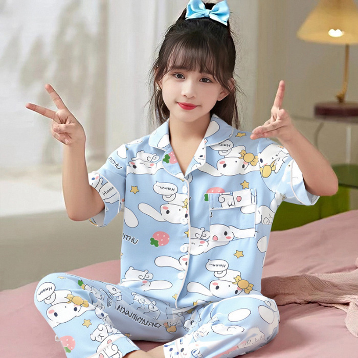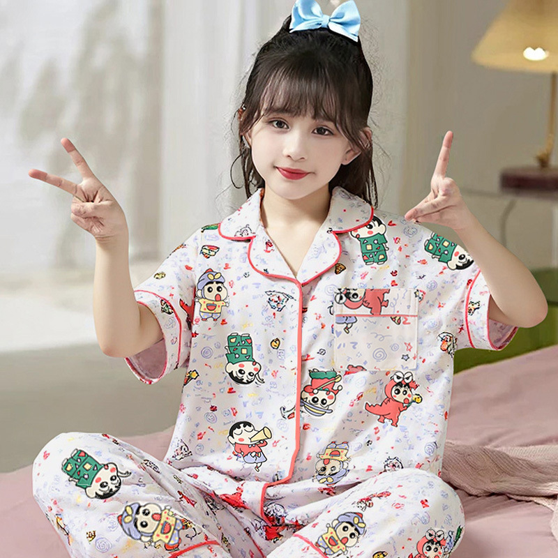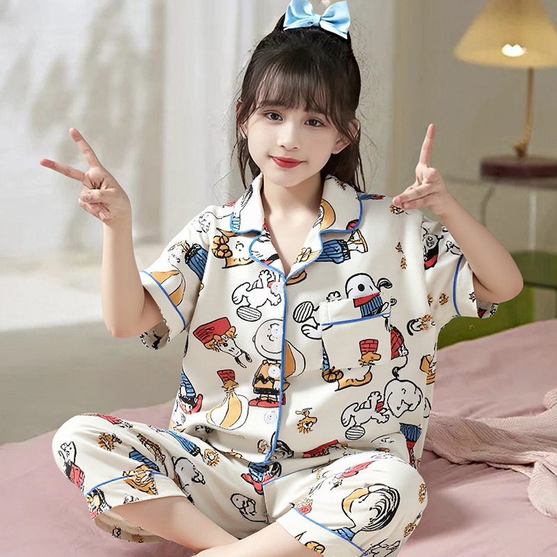 여름 어린이 반팔 바지 모조 면화 옷깃 만화 소년과 소녀 카디건 잠옷 세트 우유 실크 가정 의류스토어 가기
