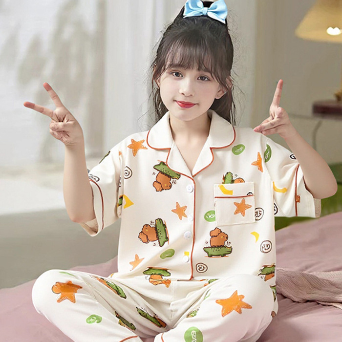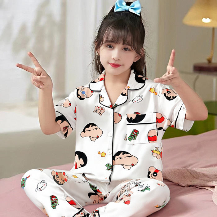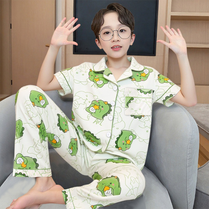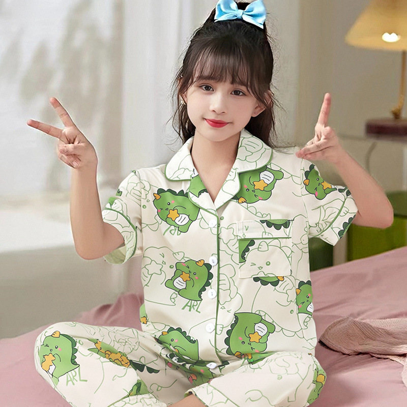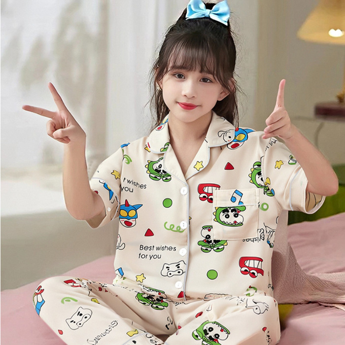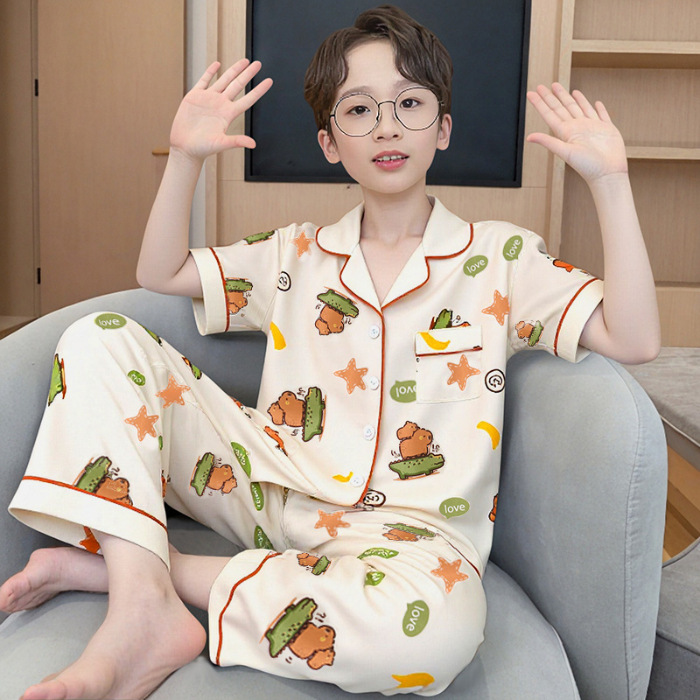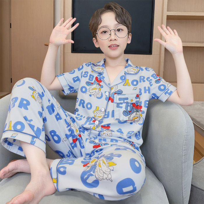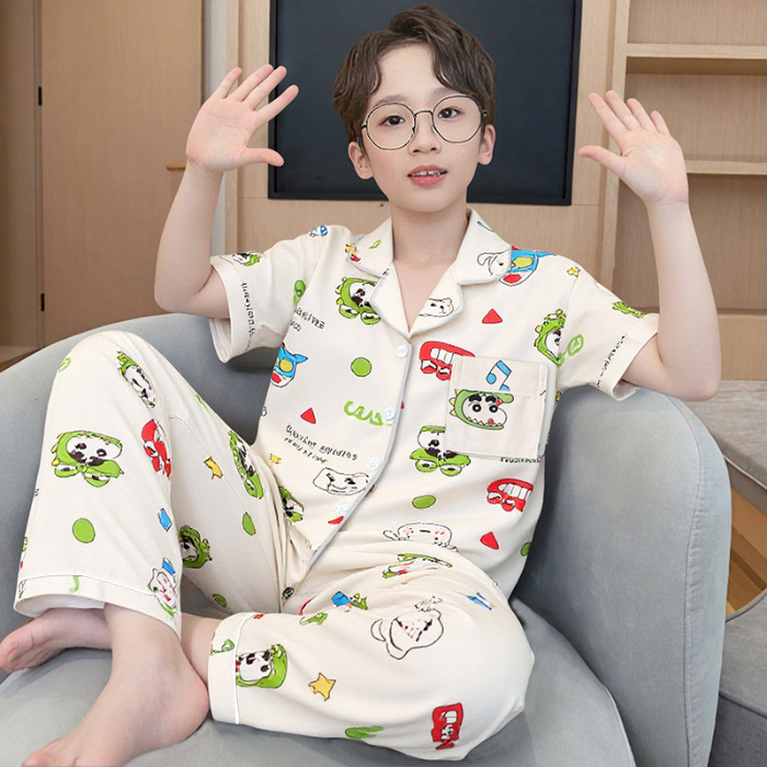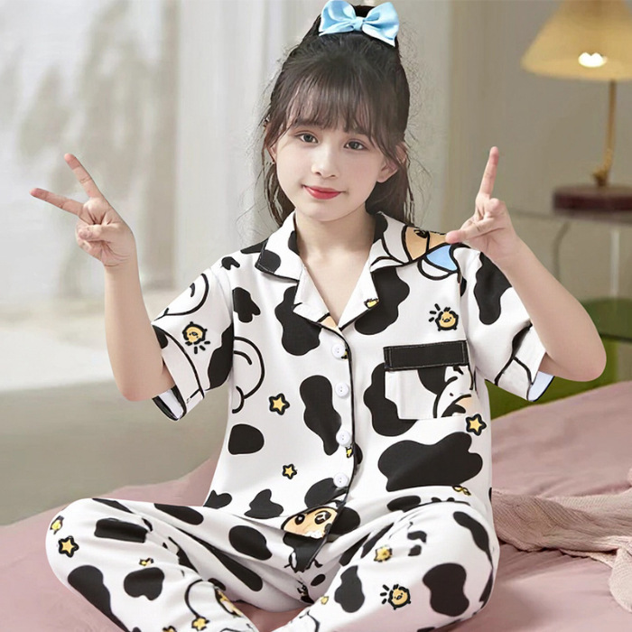 여름 어린이 반팔 바지 모조 면화 옷깃 만화 소년과 소녀 카디건 잠옷 세트 우유 실크 가정 의류