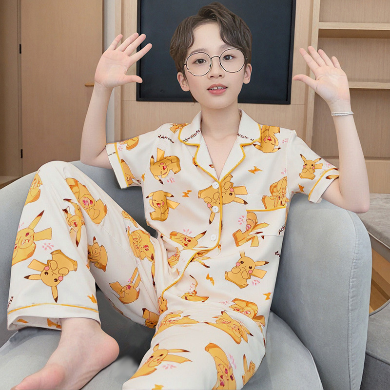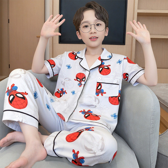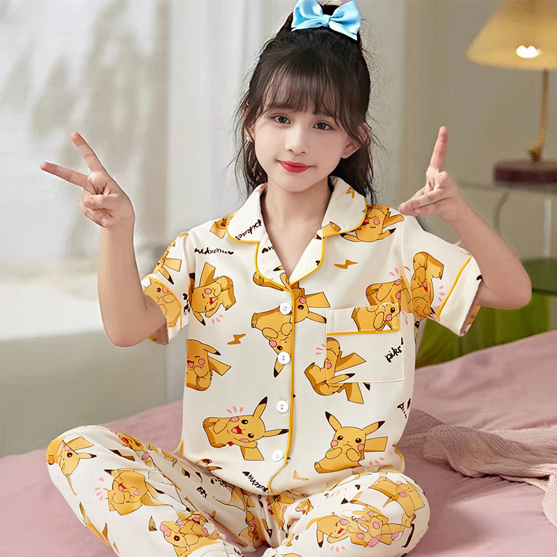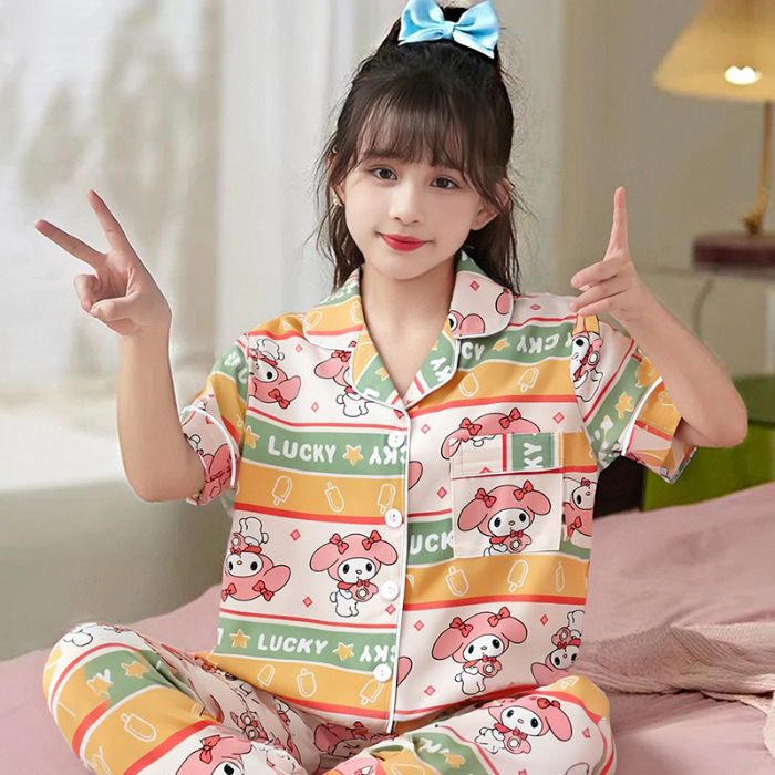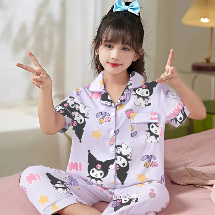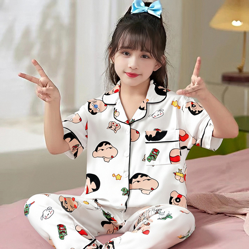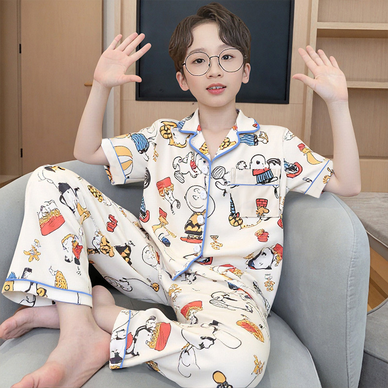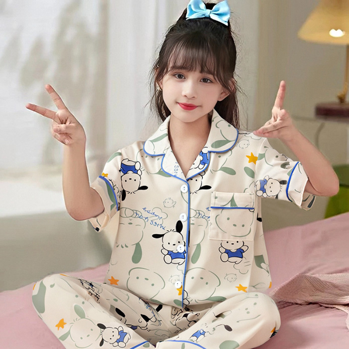 여름 어린이 반팔 바지 모조 면화 옷깃 만화 소년과 소녀 카디건 잠옷 세트 우유 실크 가정 의류