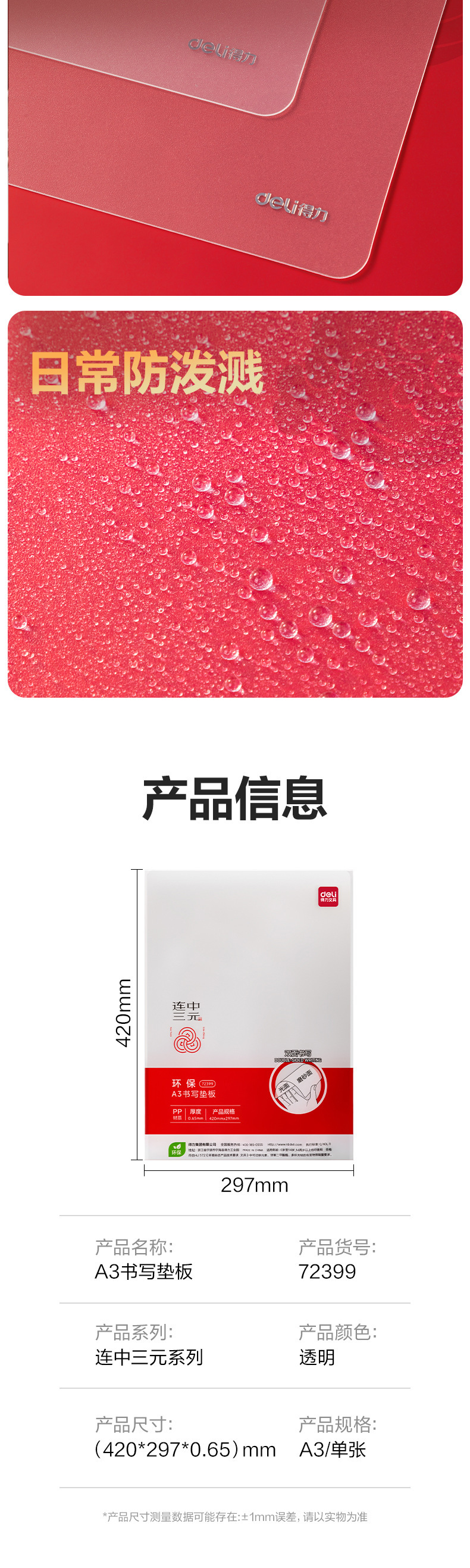 델리 하드 패드 A3 시험 패드 72399 시험지 데스크탑 복사 패드 학생 쓰기 패드 투명