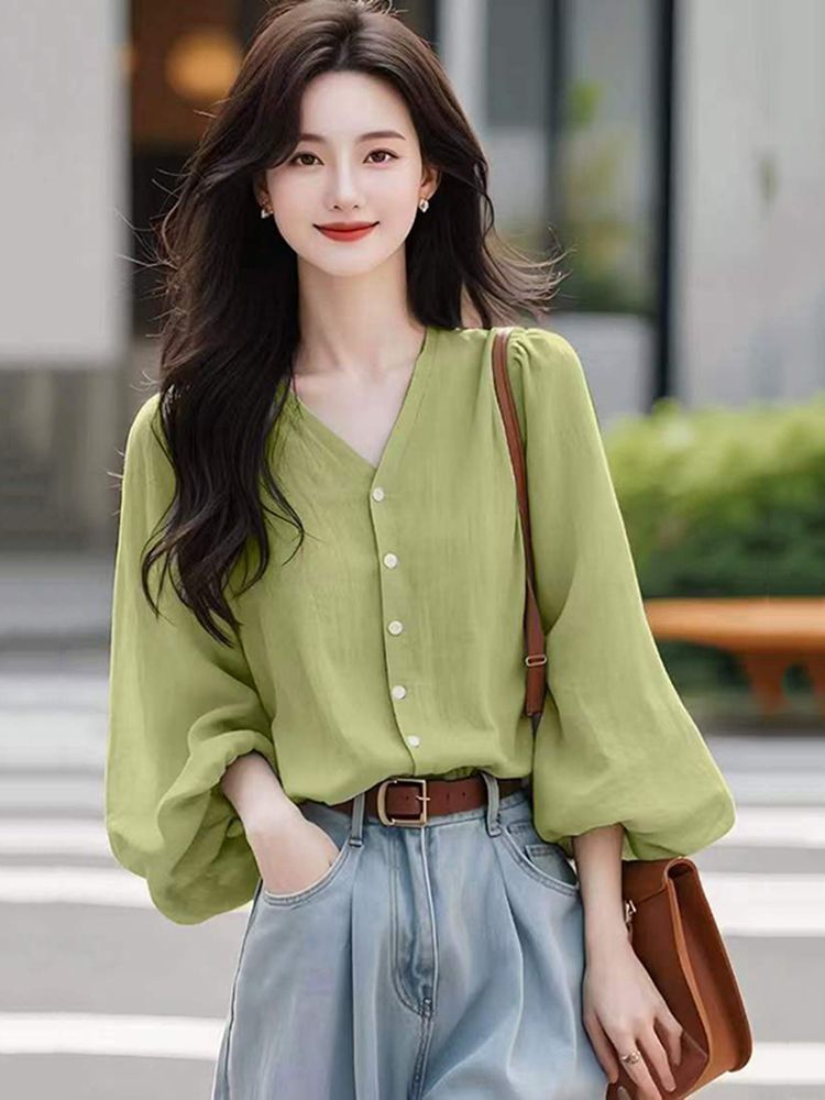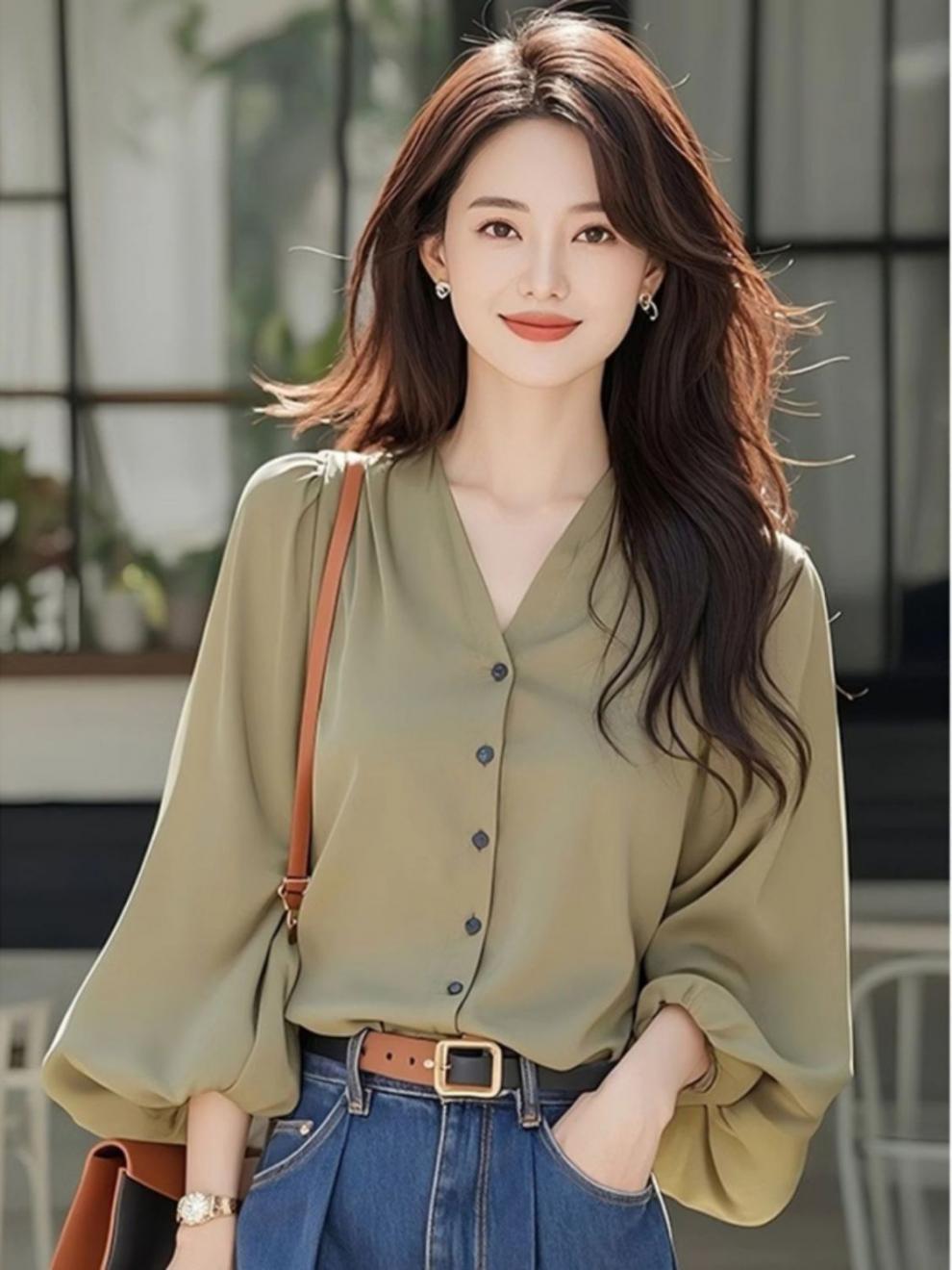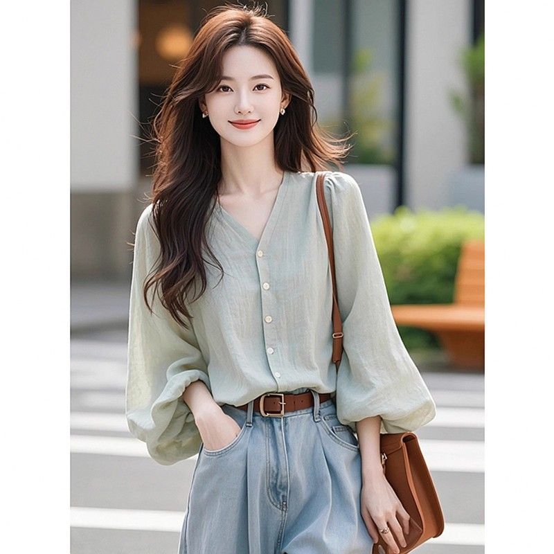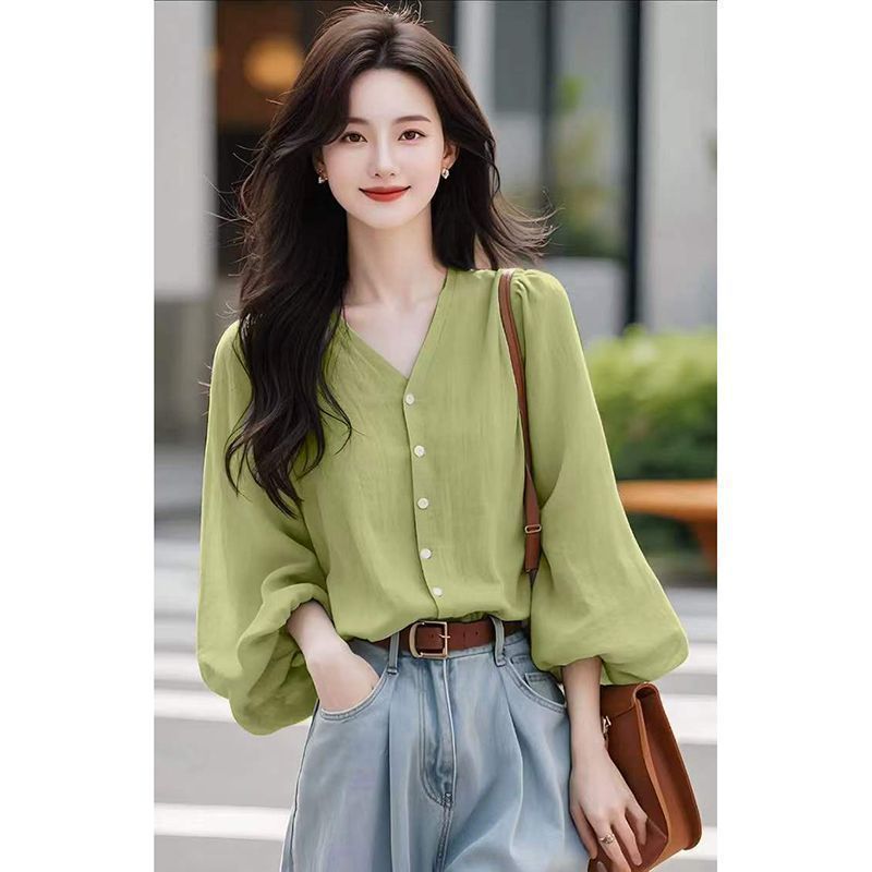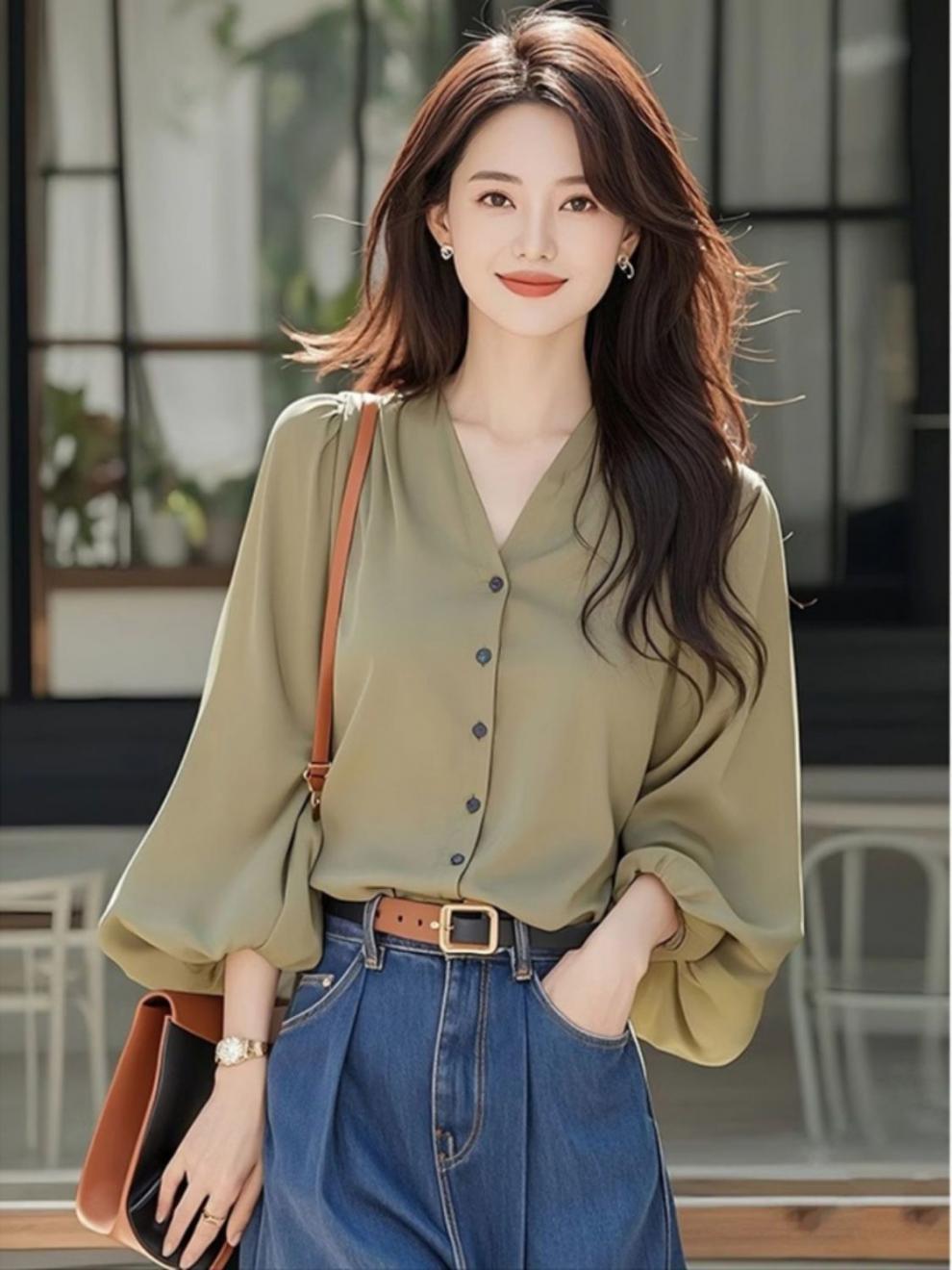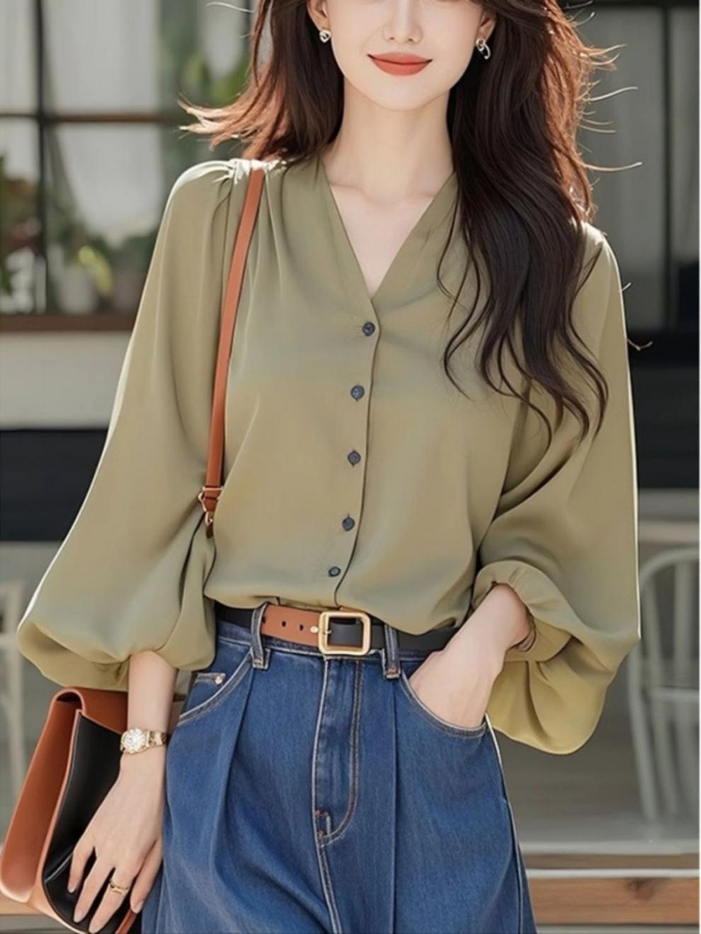 프랑스 스타일 우아한 긴 소매 셔츠 여성의 2025 초가을 새로운 독특한 아름다운 슈퍼 잘 생긴 V 넥 쉬폰 작은 탑스토어 가기