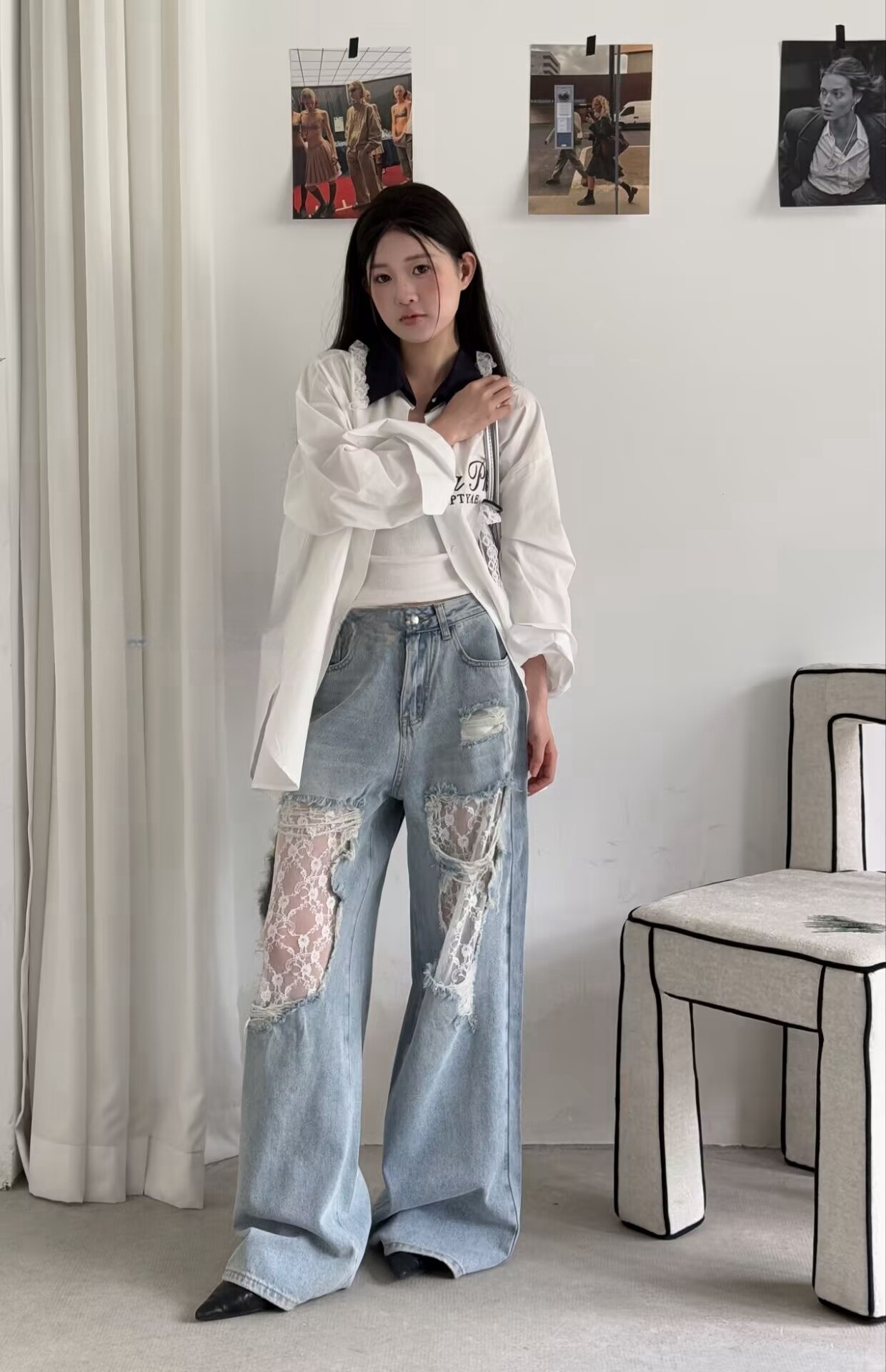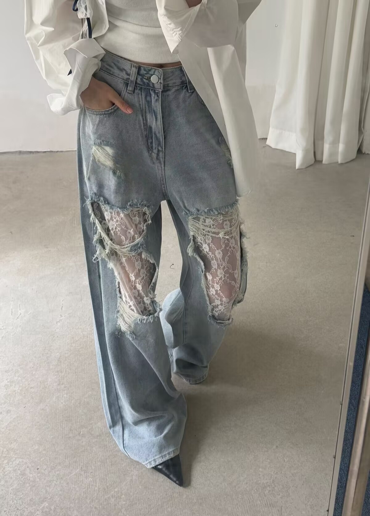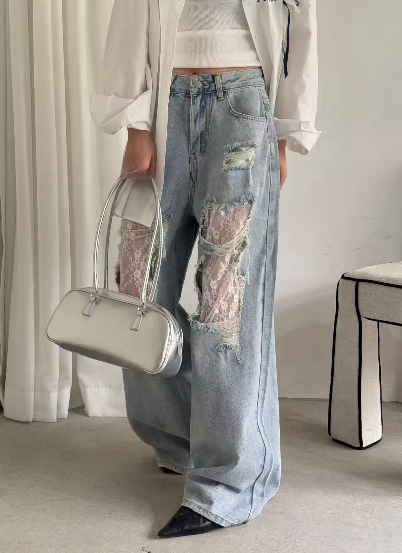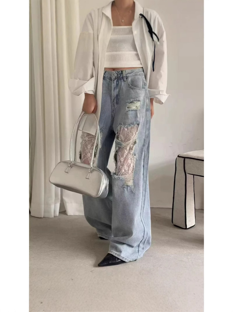 미국식 리핑 레이스 스티칭 모프 청바지 여성 핫 걸 하이 스트리트 디자인 레트로 느슨한 게으른 와이드 레그 바지