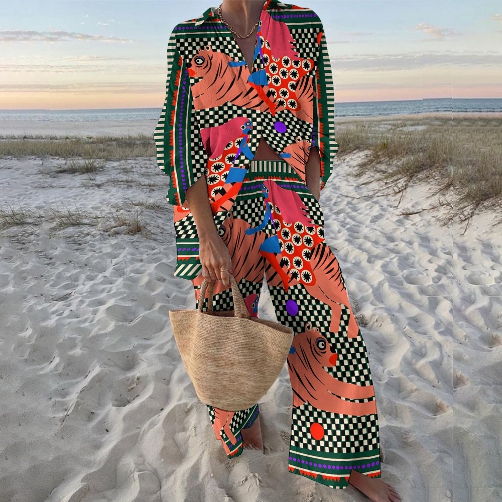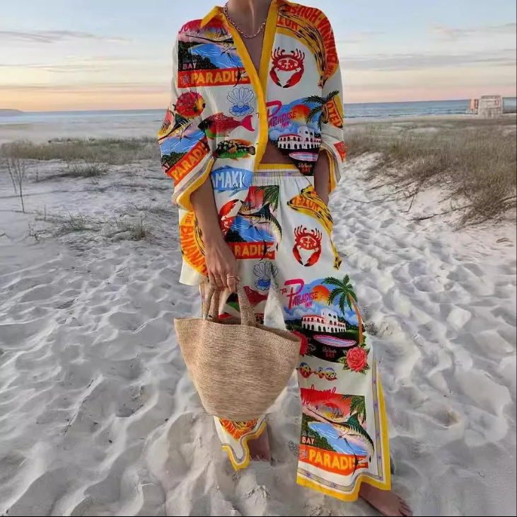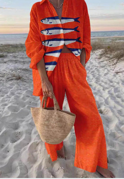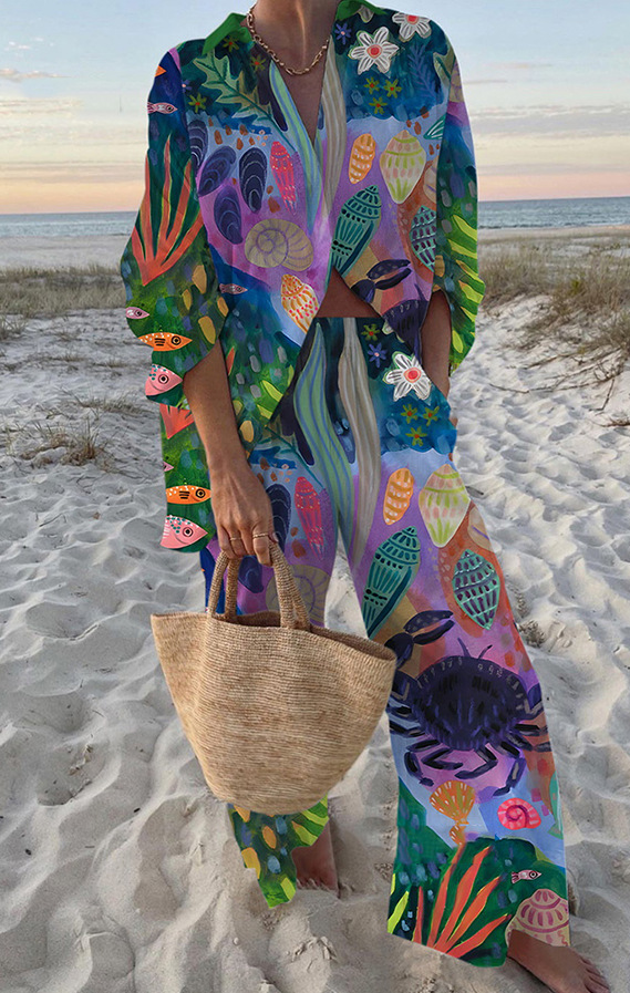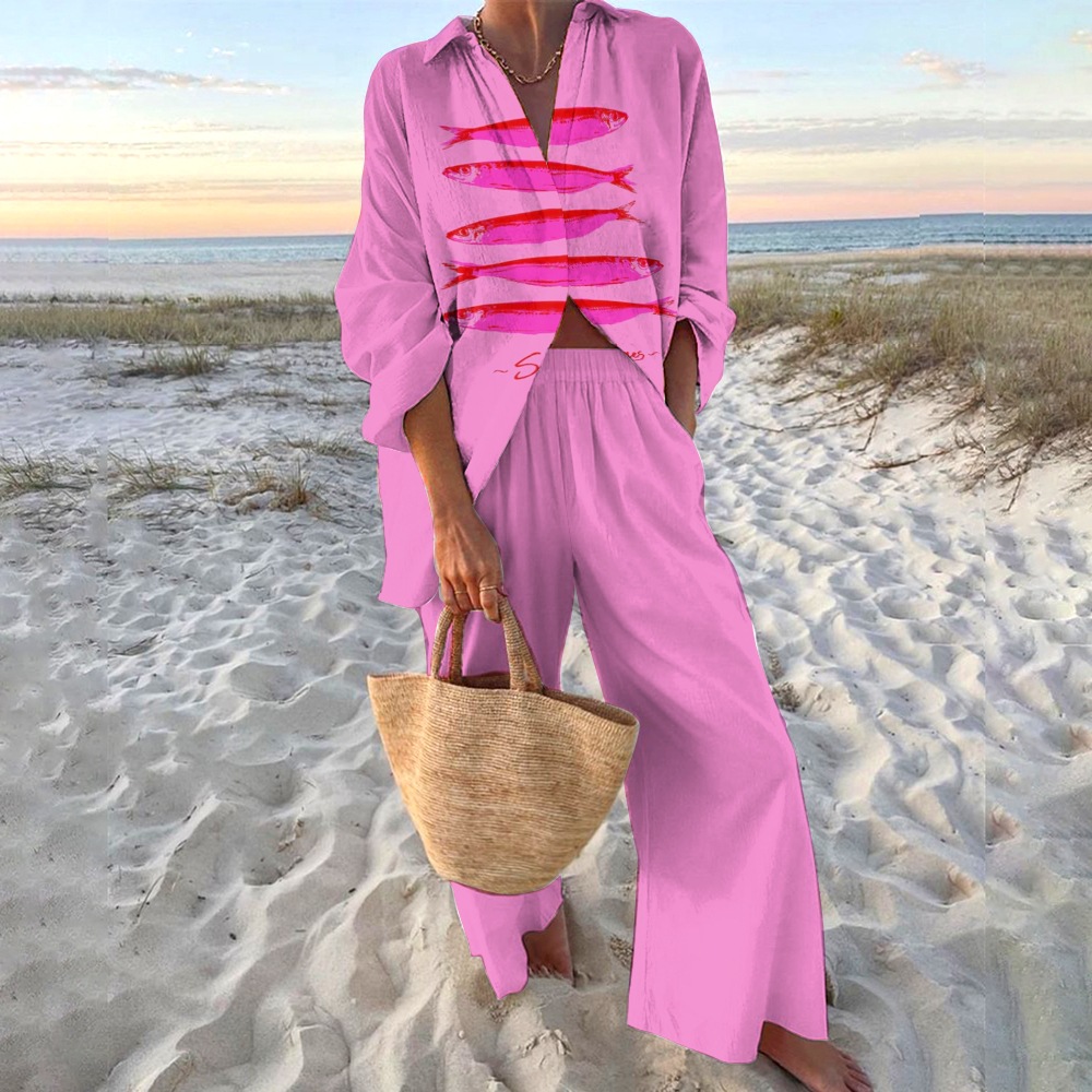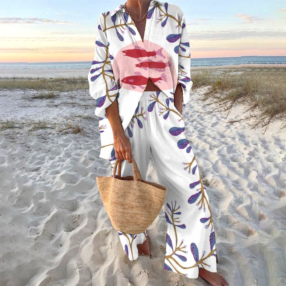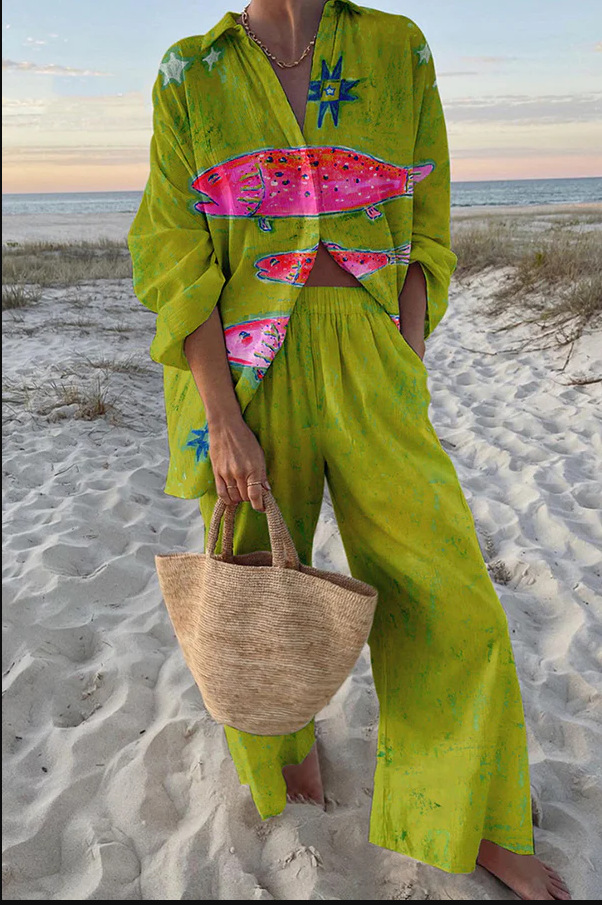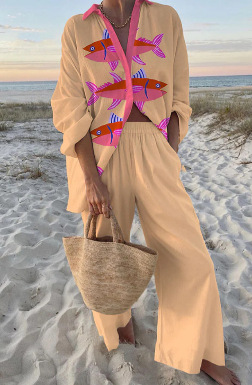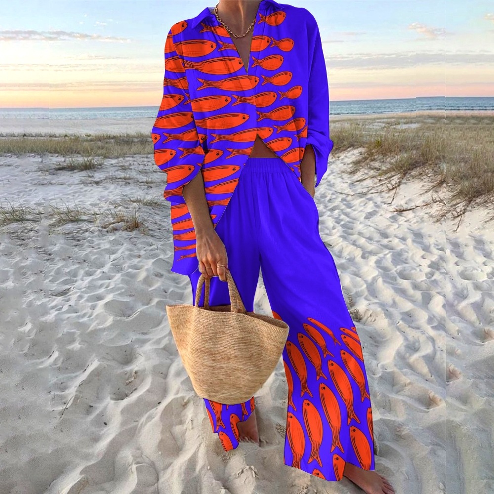 유럽과 미국의 새로운 창조적 인 물고기 패턴 레저 세트 느슨한 스포츠 넓은 다리 바지 해양 요소 레저 세트