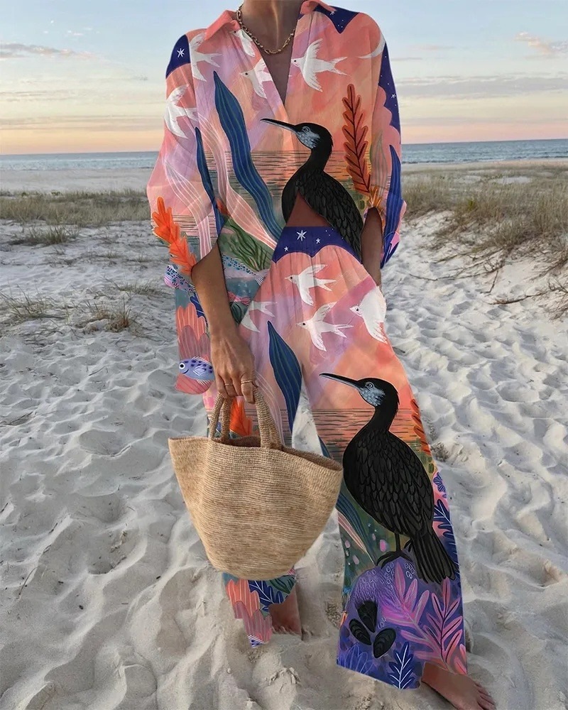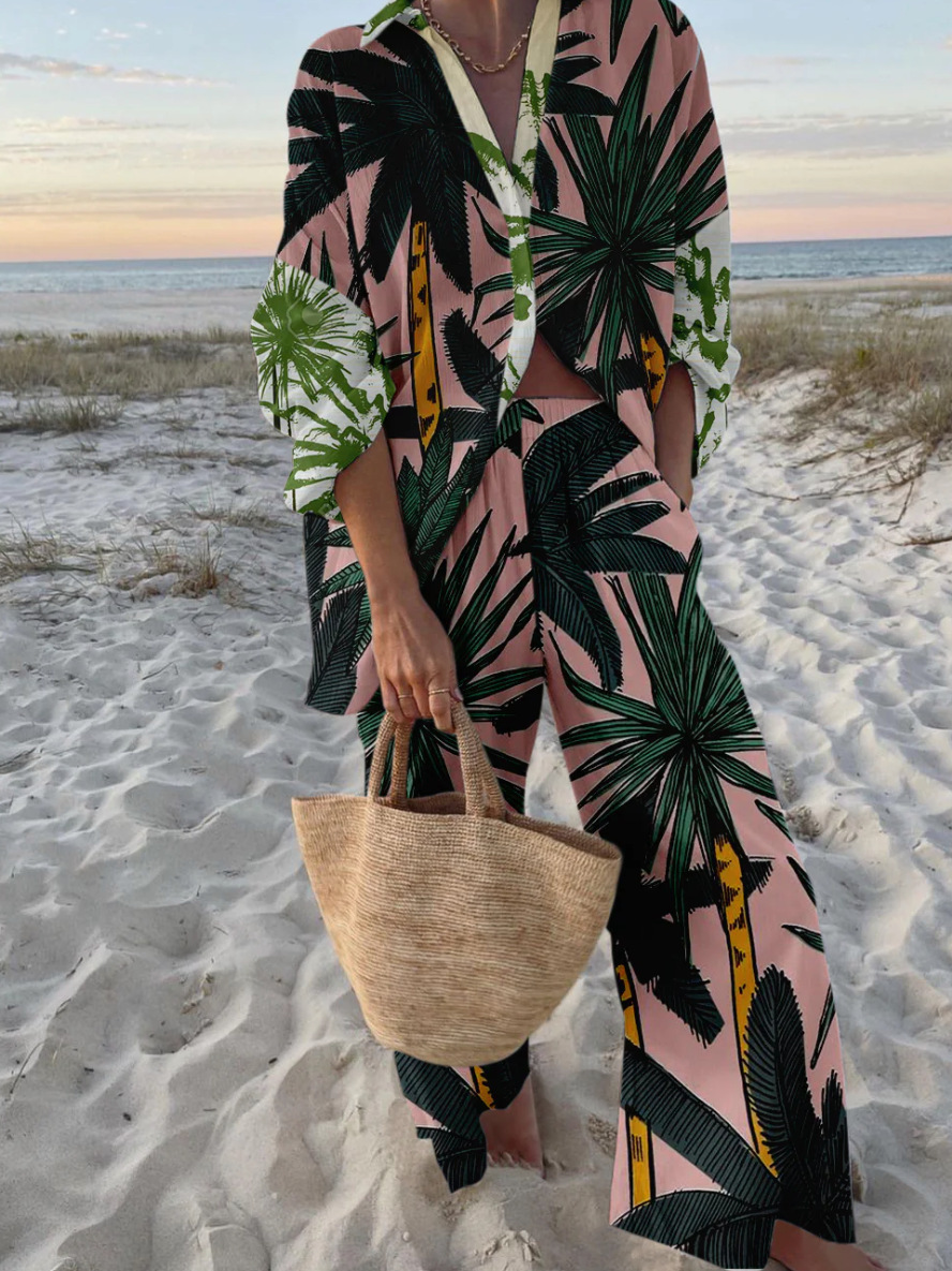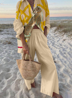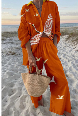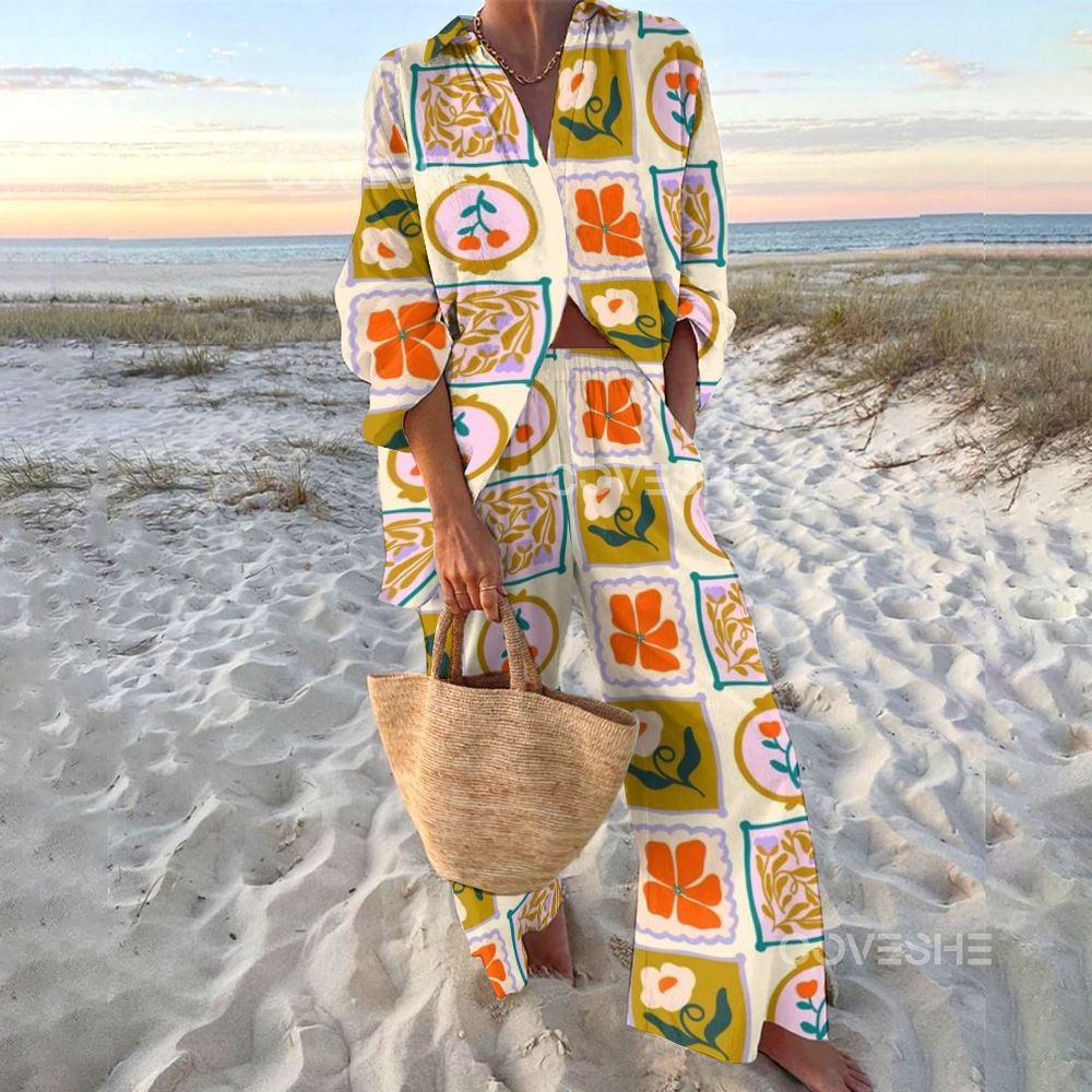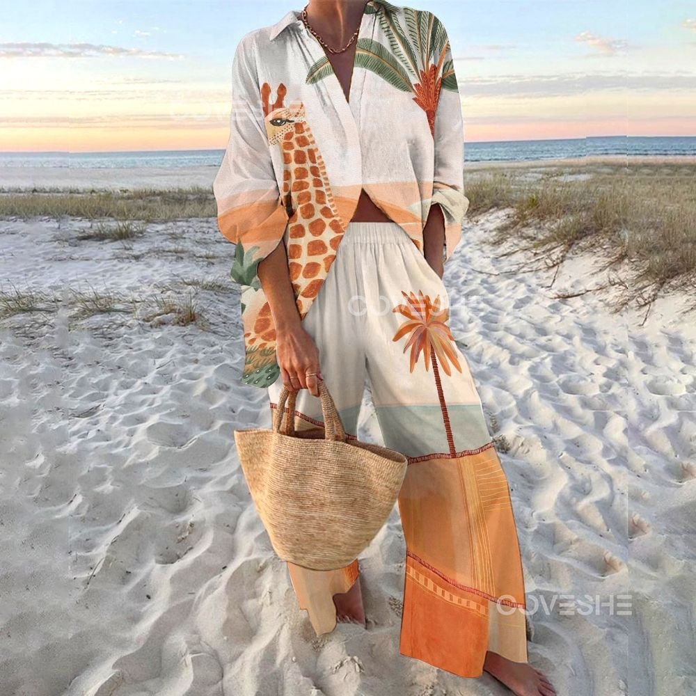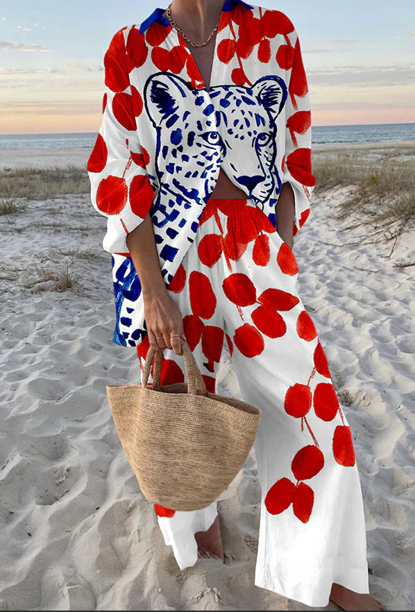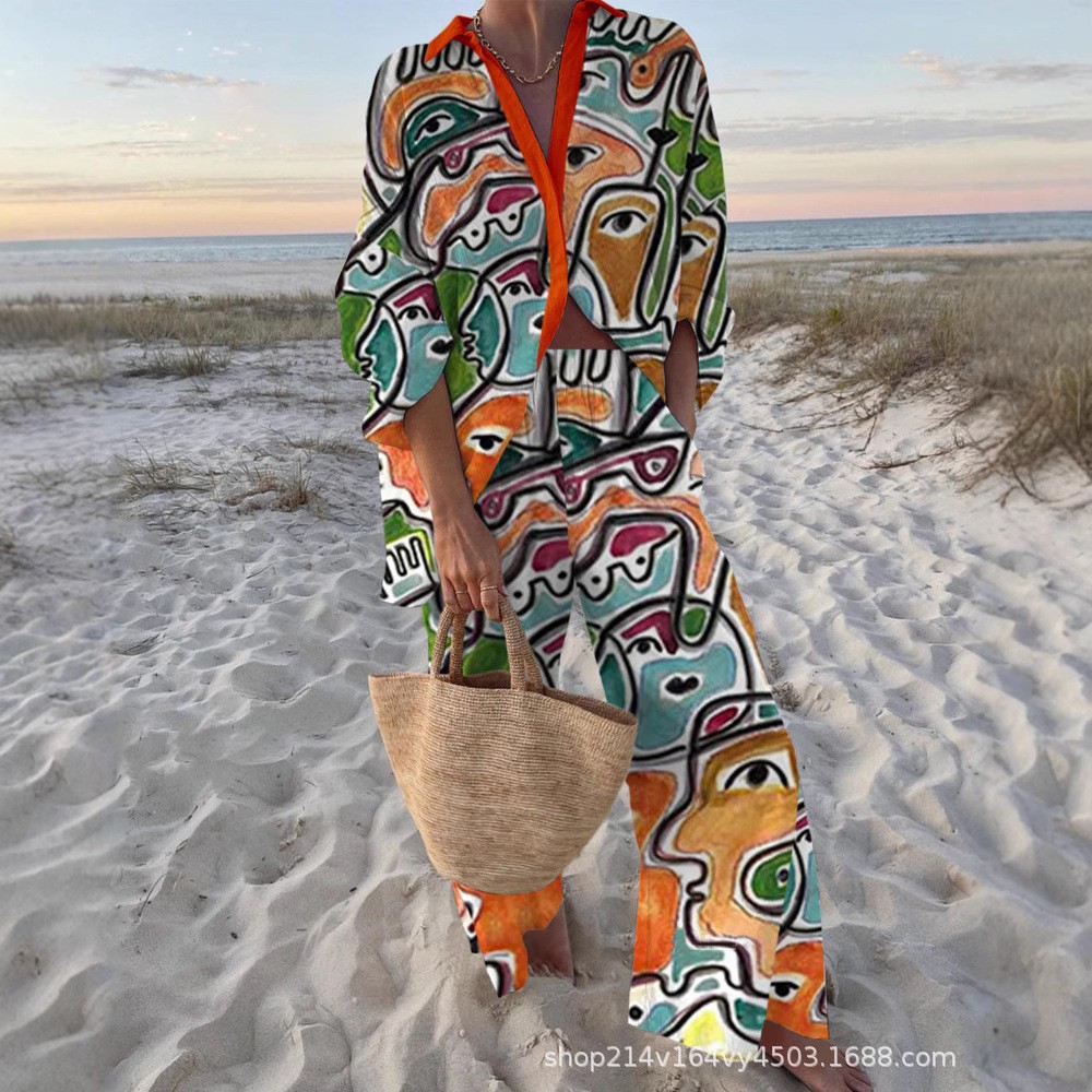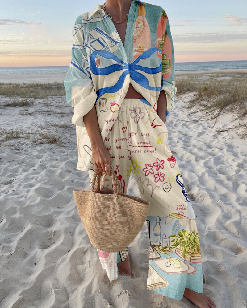 유럽과 미국의 새로운 창조적 인 물고기 패턴 레저 세트 느슨한 스포츠 넓은 다리 바지 해양 요소 레저 세트