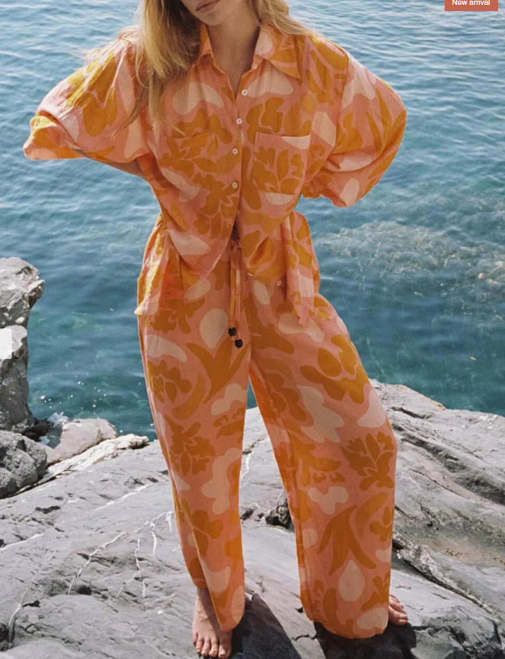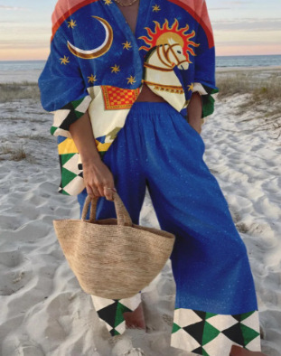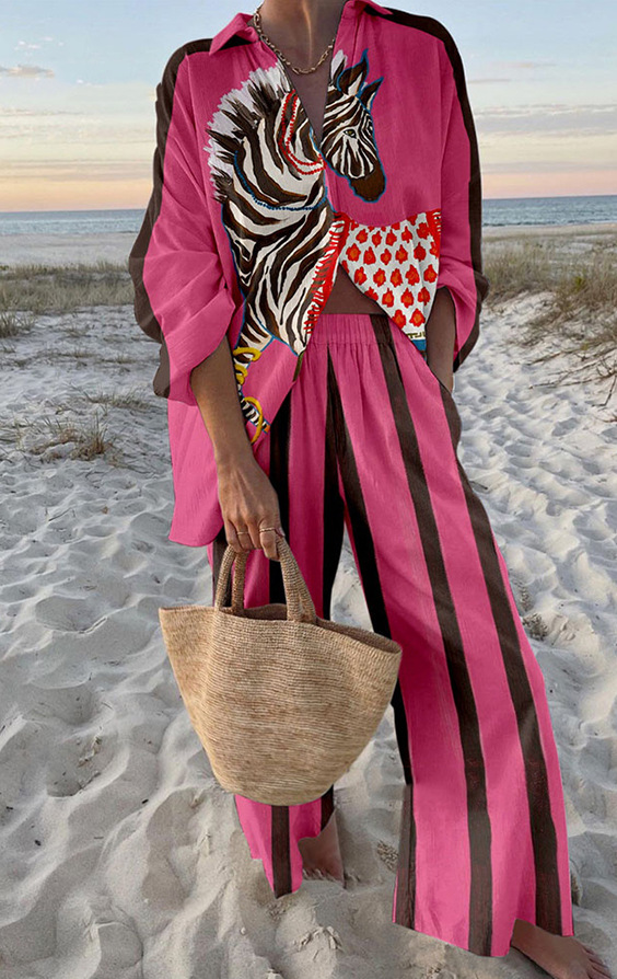 유럽과 미국의 새로운 창조적 인 물고기 패턴 레저 세트 느슨한 스포츠 넓은 다리 바지 해양 요소 레저 세트스토어 가기