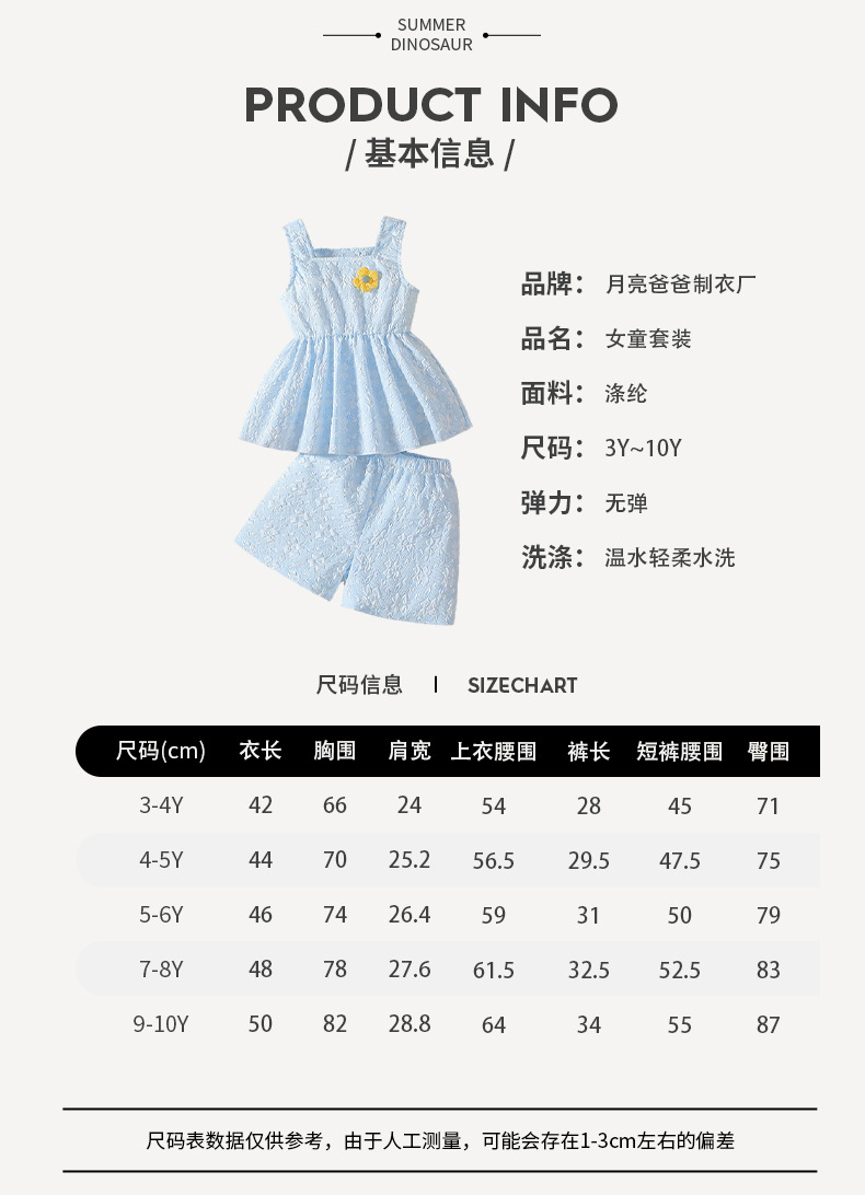 소녀의 여름 조끼 세트 한국식 꽃 자수 프린트 러플 헴 스카이 블루 어린이 투피스 세트
