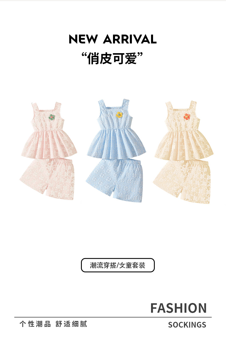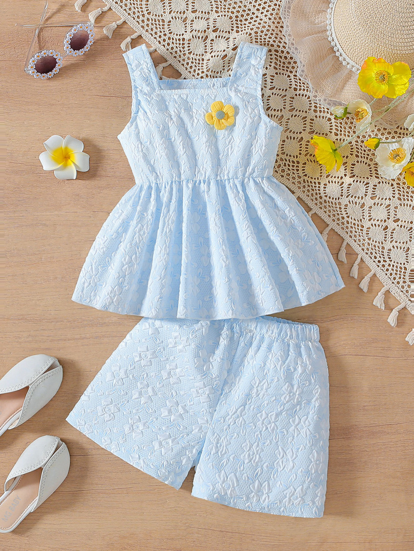 소녀의 여름 조끼 세트 한국식 꽃 자수 프린트 러플 헴 스카이 블루 어린이 투피스 세트스토어 가기