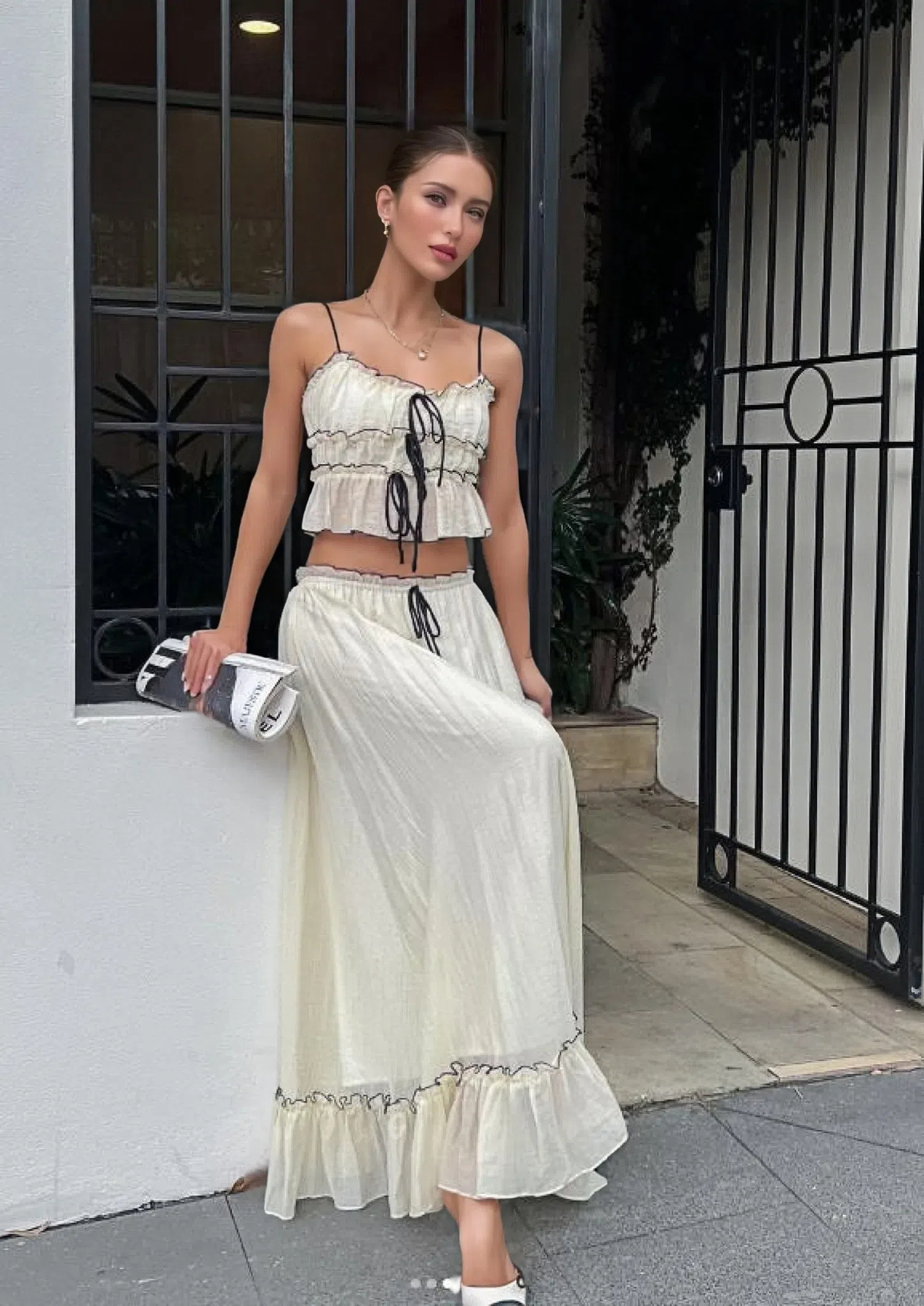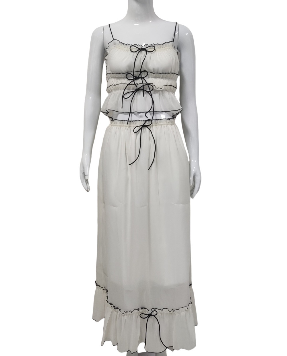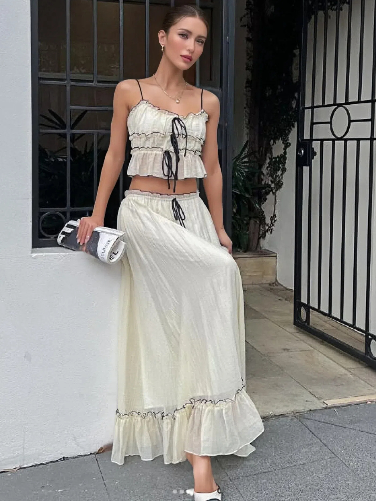 法式气质性感辣妹风木耳边吊带背心女夏季拼接系带小众百搭两件套休闲裙套装