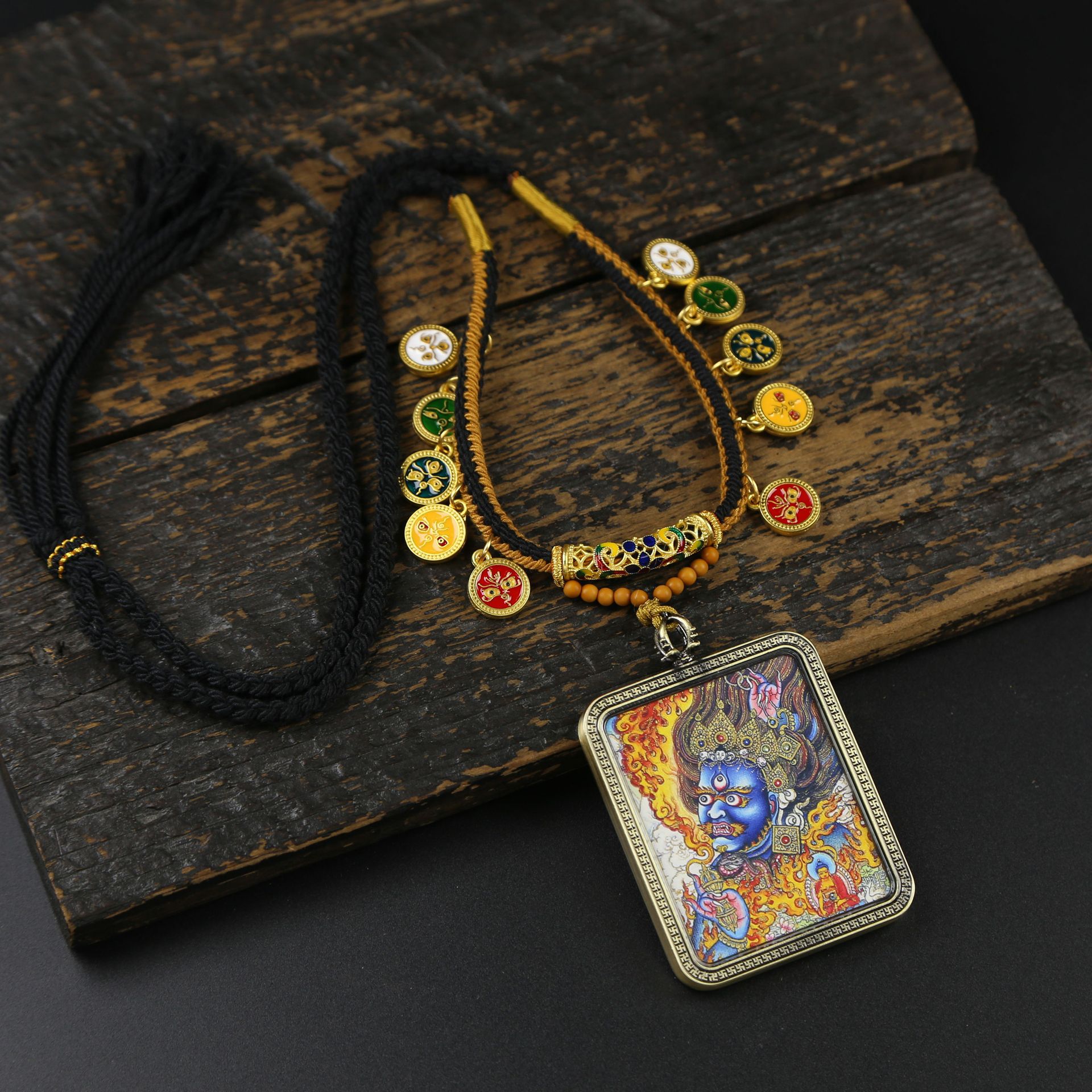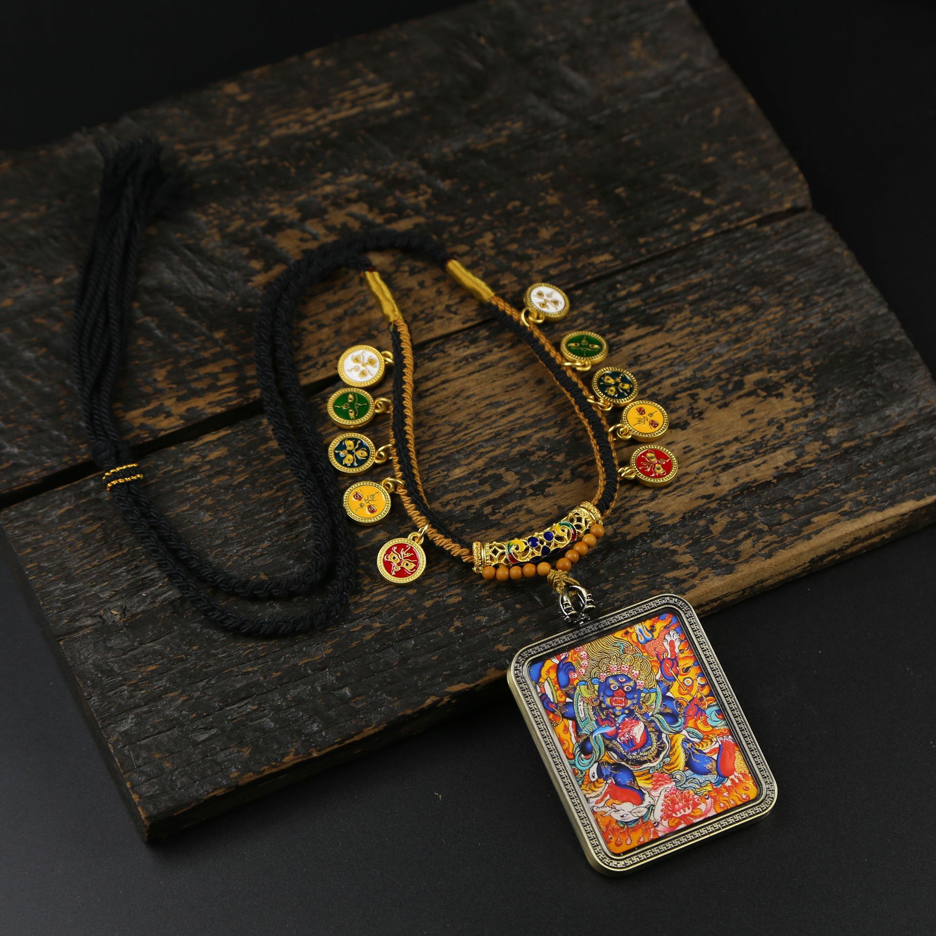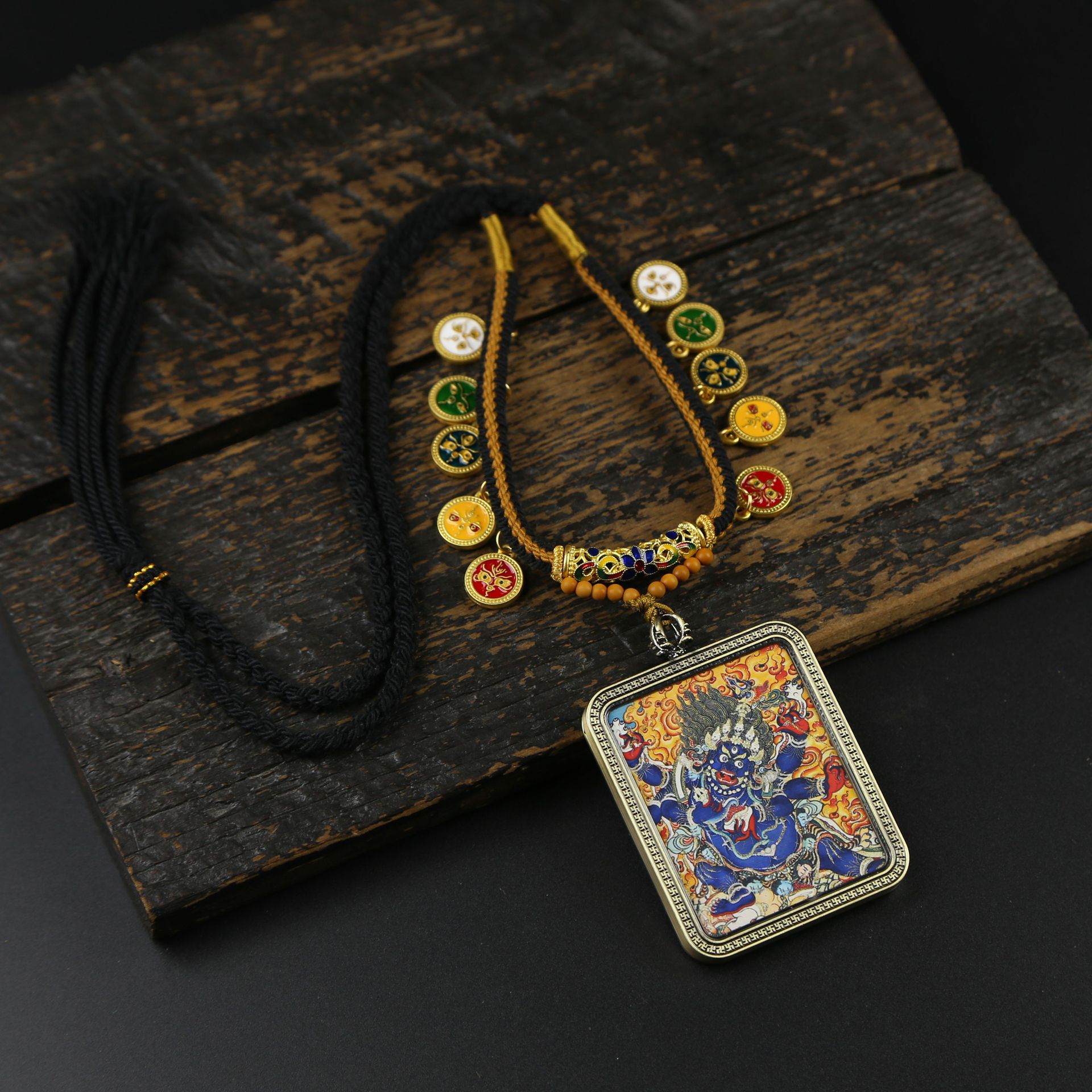 티베트 스타일의 손으로 그린 골드 페인팅 코어 블랙 맘 큰 블랙 스카이 탕카 펜던트 청동 합금 프레임 기내 부처님 카드 펜던트스토어 가기