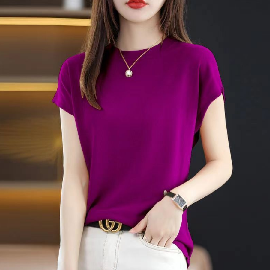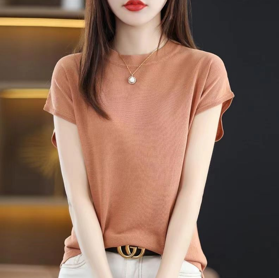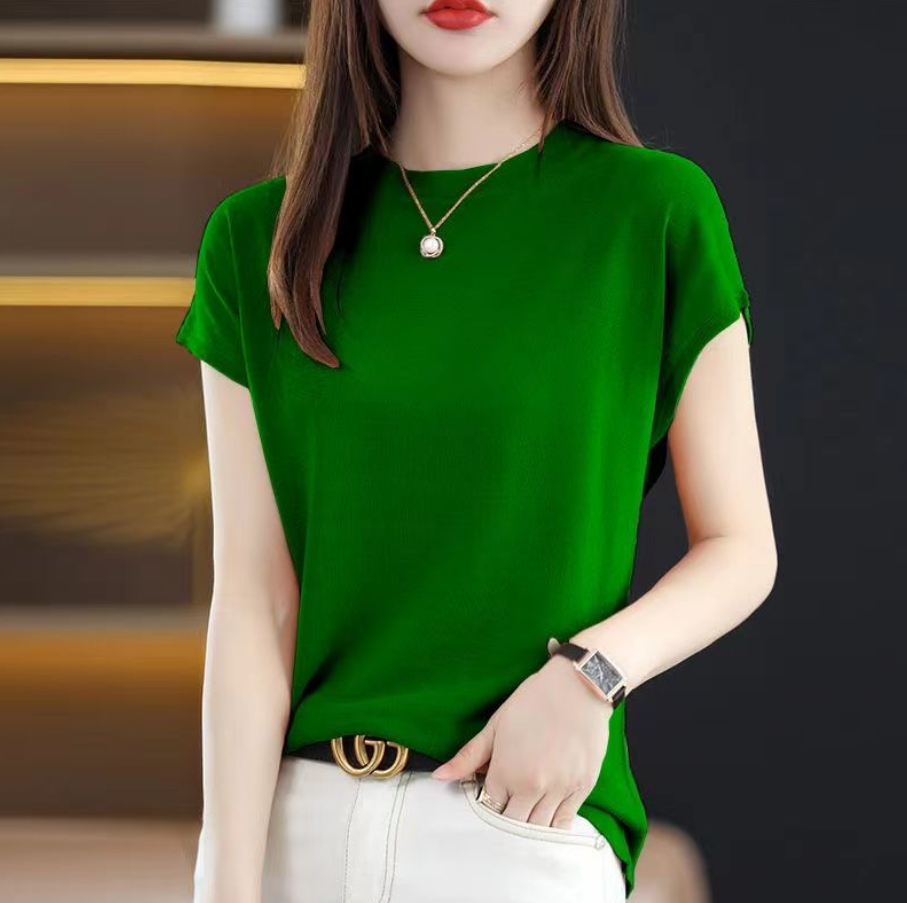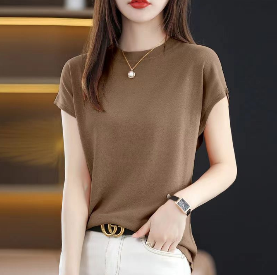 프랑스 솔리드 컬러 아이스 실크 니트 조끼 최고 여성 2025 년 여름 새로운 우아한 느슨한 반팔 티셔츠베이스 셔츠