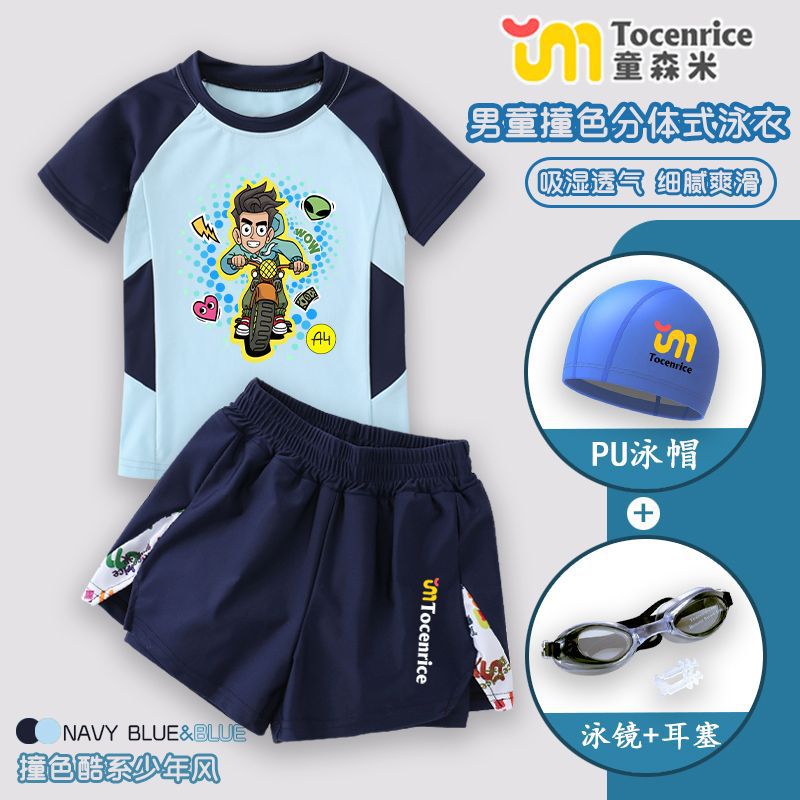 • 네이비 블루 스플릿 수영복 (수영 고글 + PU 수영 모자 + 귀마개)
