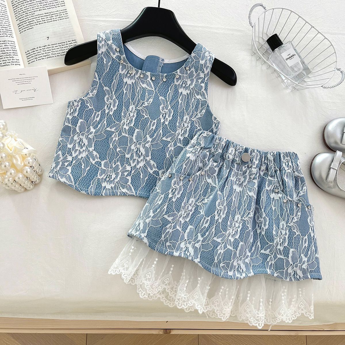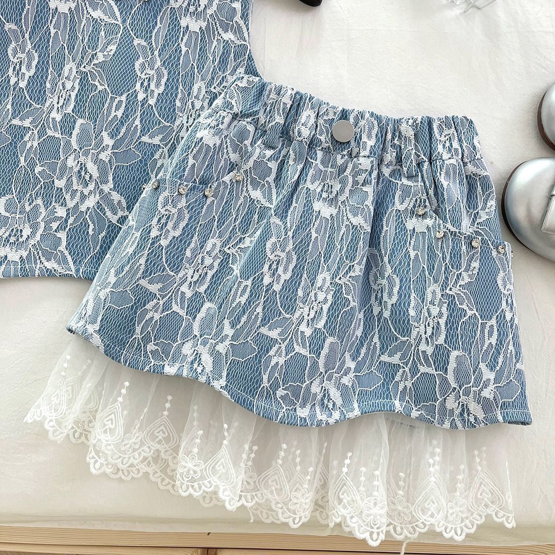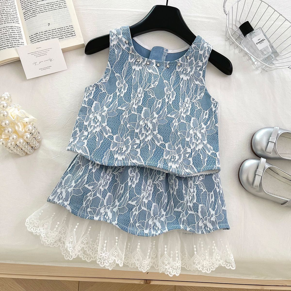 새로운 2025 여름 한국 스타일 소녀의 레이스 데님 민소매 세트 아기의 치마 폭발성 데님 투피스 세트