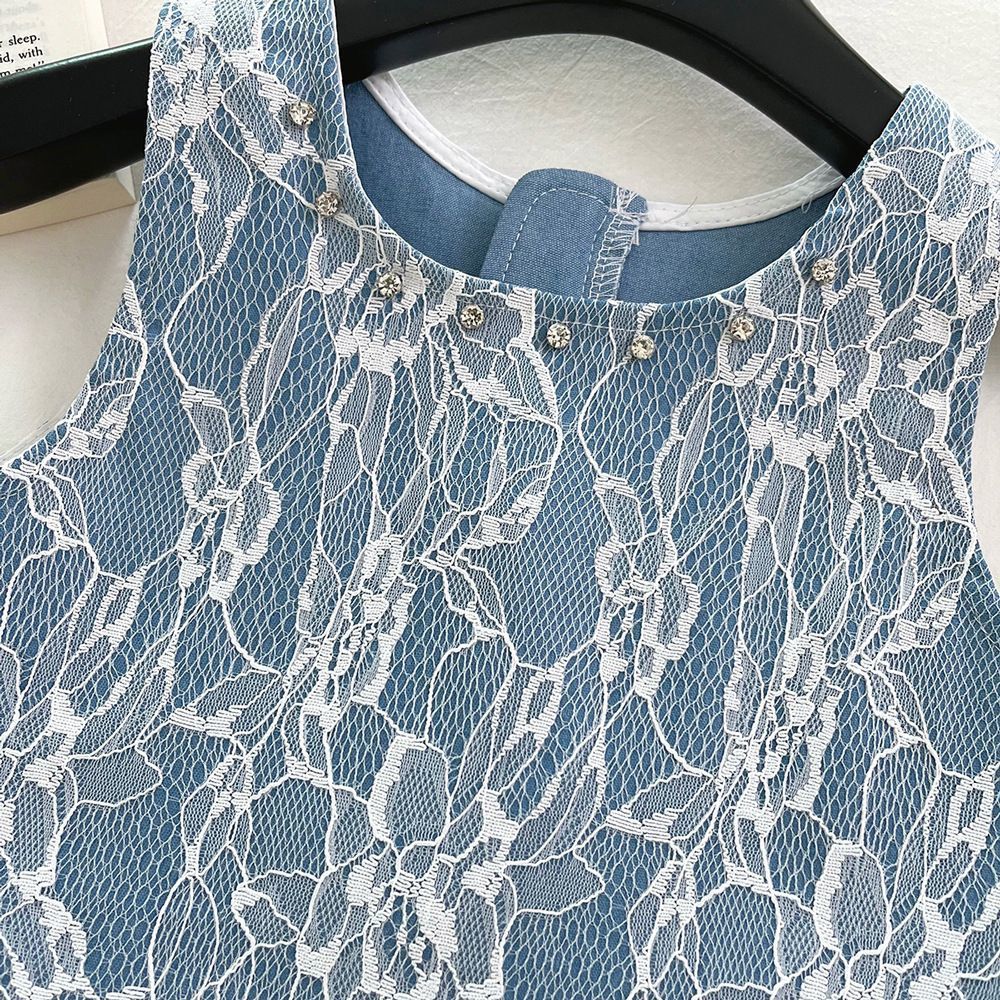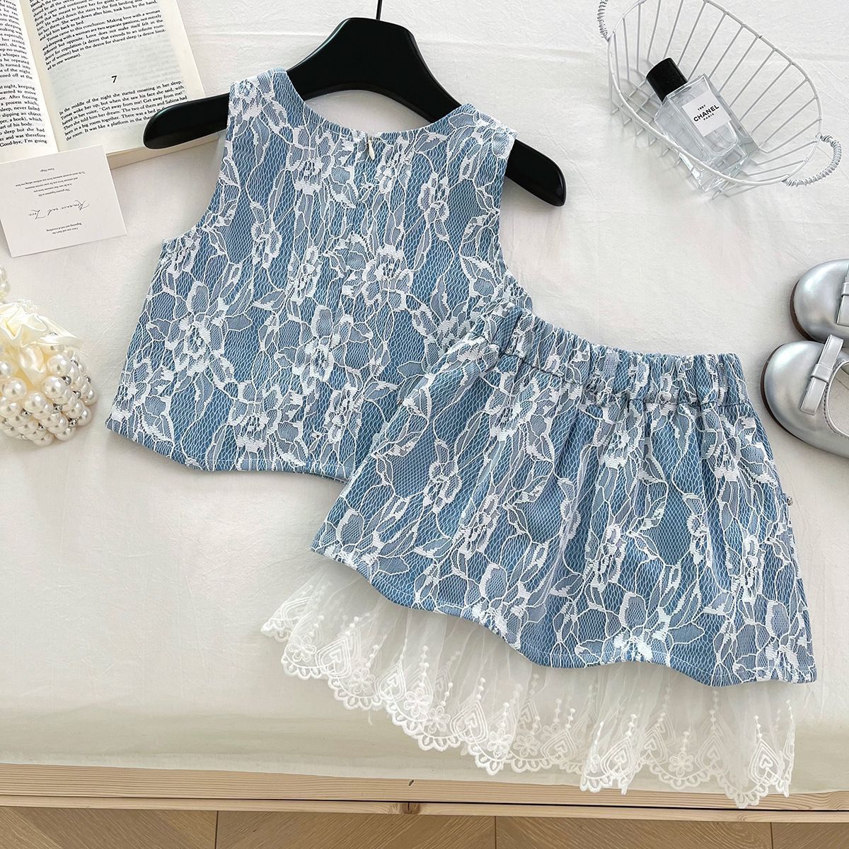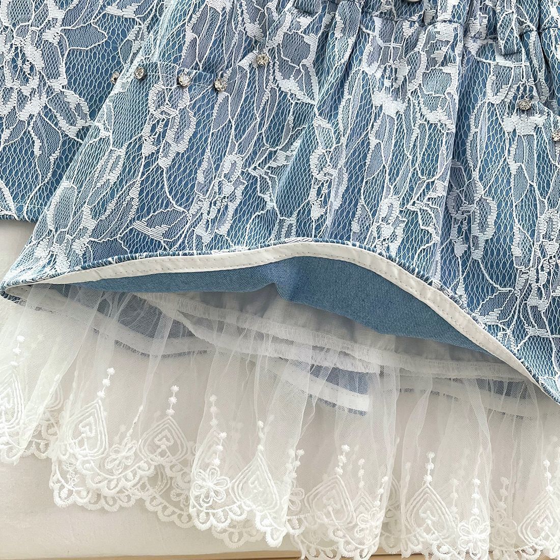 새로운 2025 여름 한국 스타일 소녀의 레이스 데님 민소매 세트 아기의 치마 폭발성 데님 투피스 세트