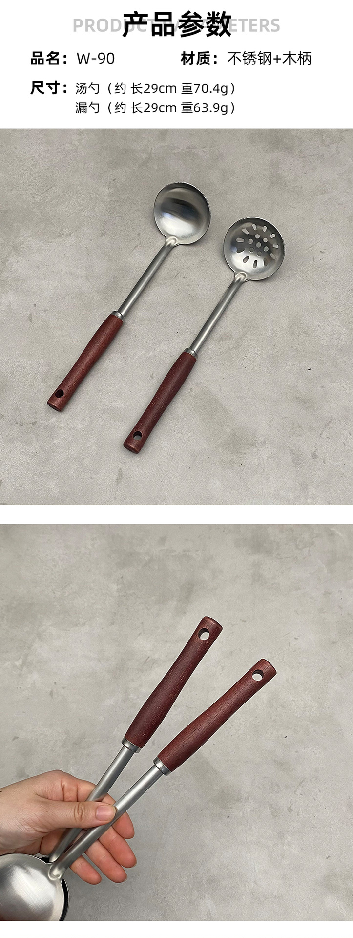 스테인리스 주방용품 냄비 주걱 가정용 나무 손잡이 숟가락 주걱 거름망 큰 국자 전골 숟가락 실용적인 주방 식기 세트스토어 가기