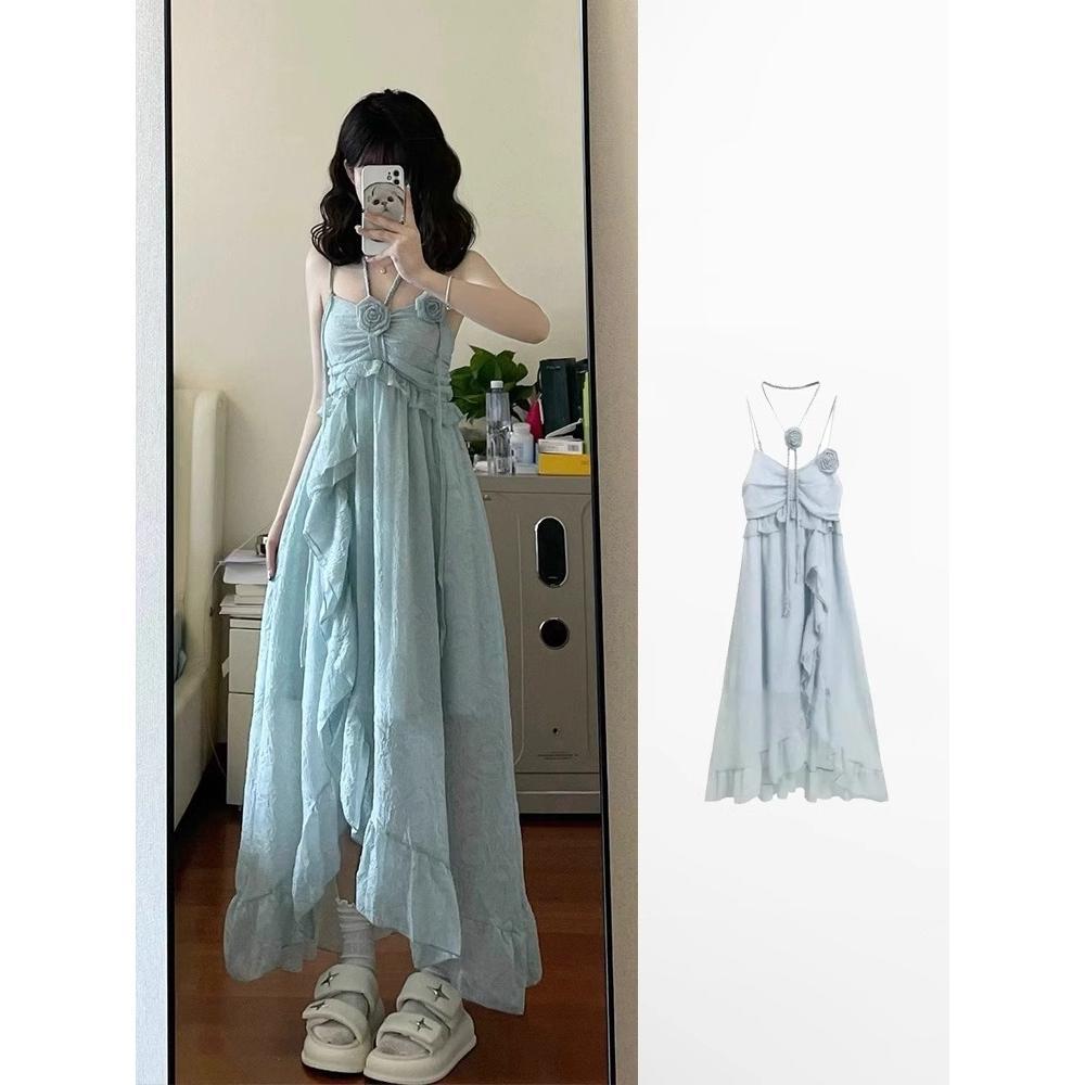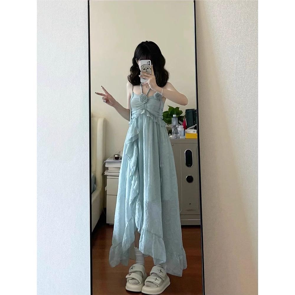 차 브레이크 프랑스 스타일 해변 해변 블루 슬링 원피스 여성 여름 하이 엔드 우아한 허리 긴 스커트스토어 가기