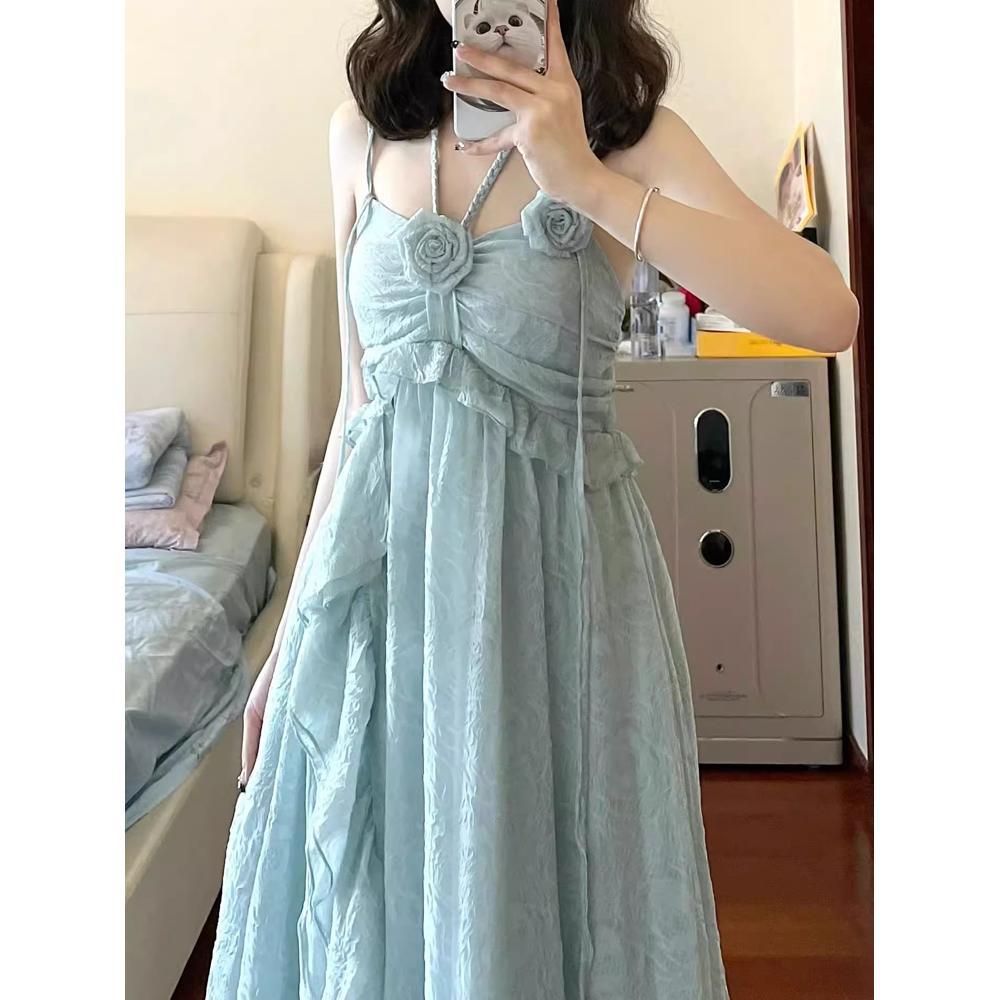 차 브레이크 프랑스 스타일 해변 해변 블루 슬링 원피스 여성 여름 하이 엔드 우아한 허리 긴 스커트