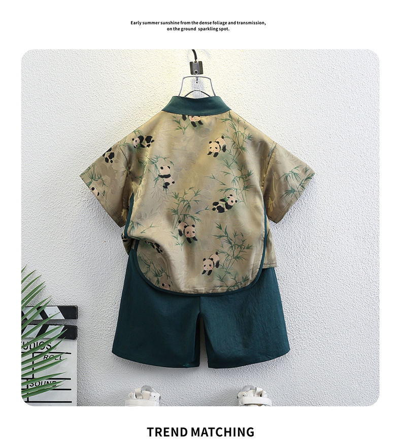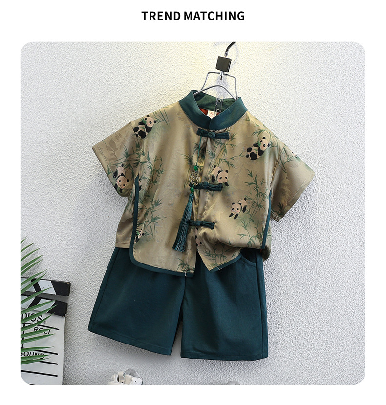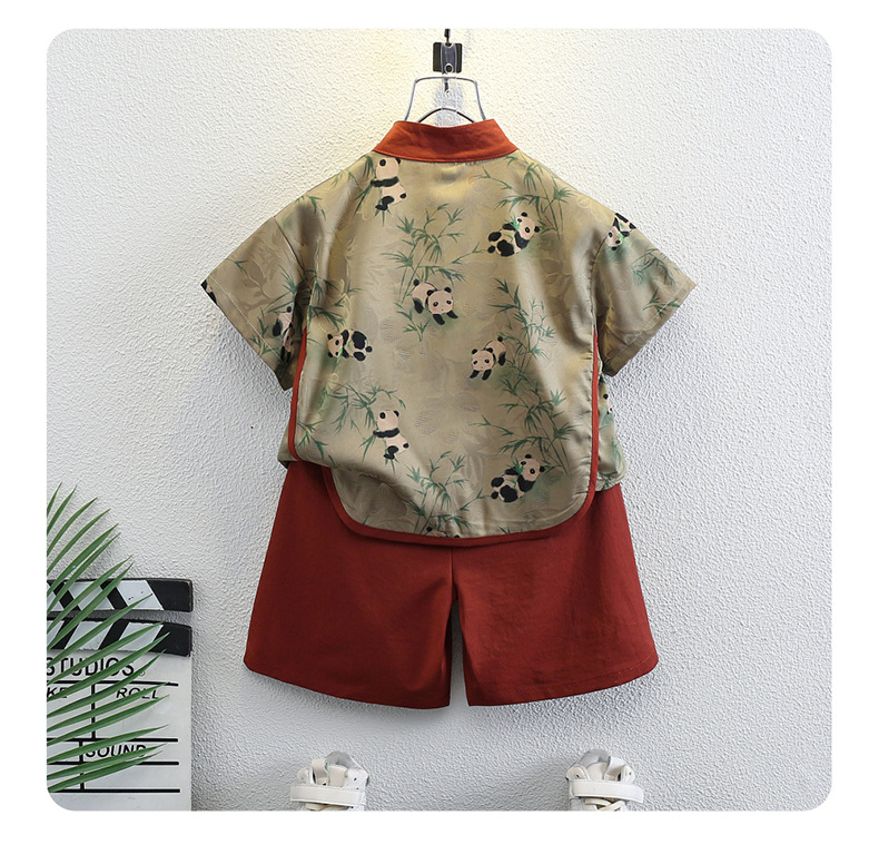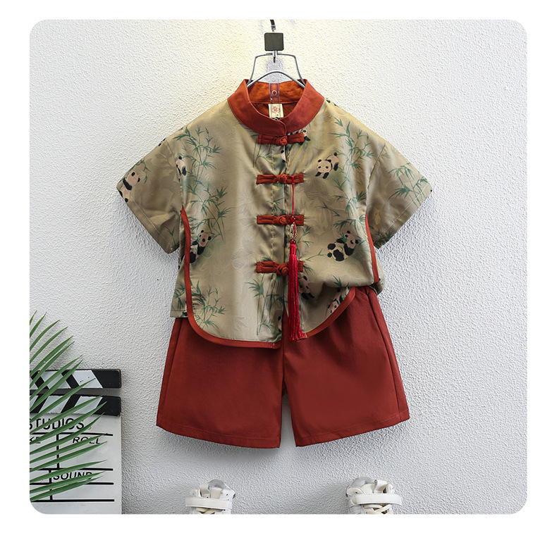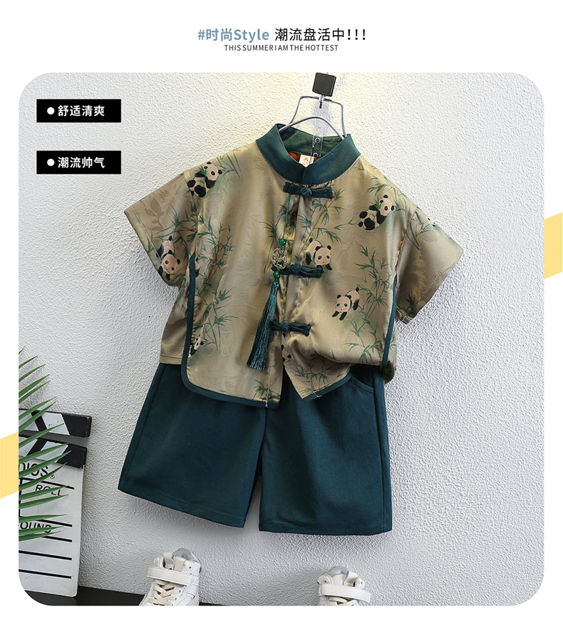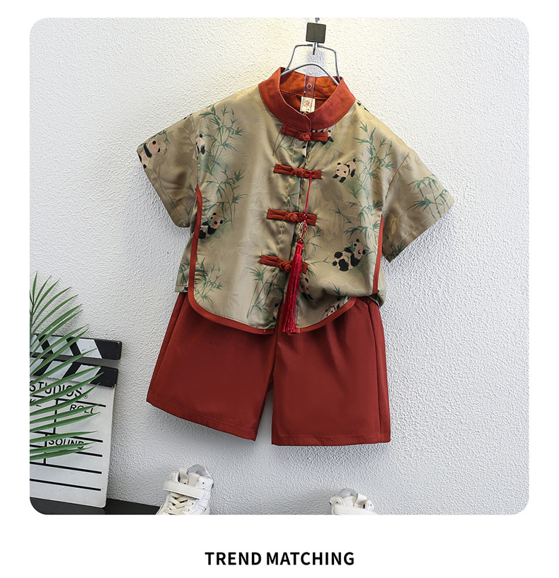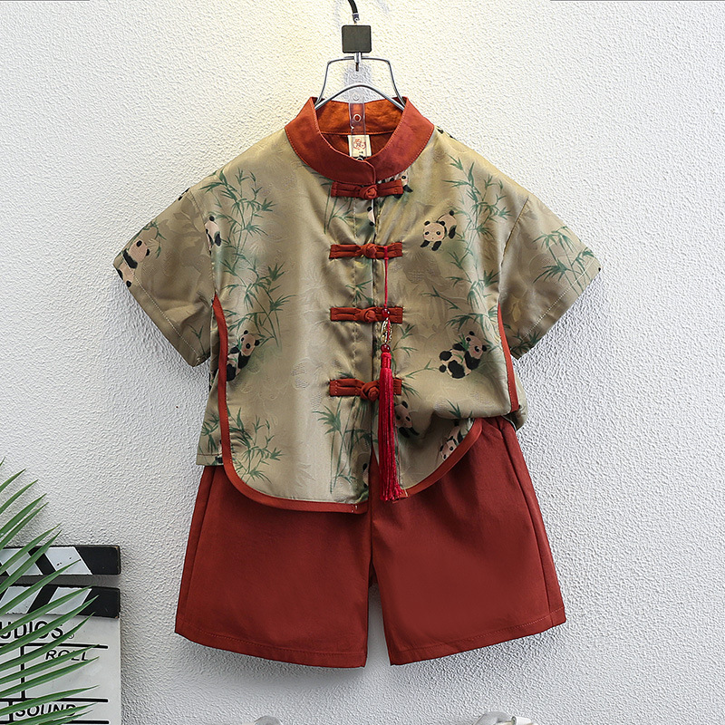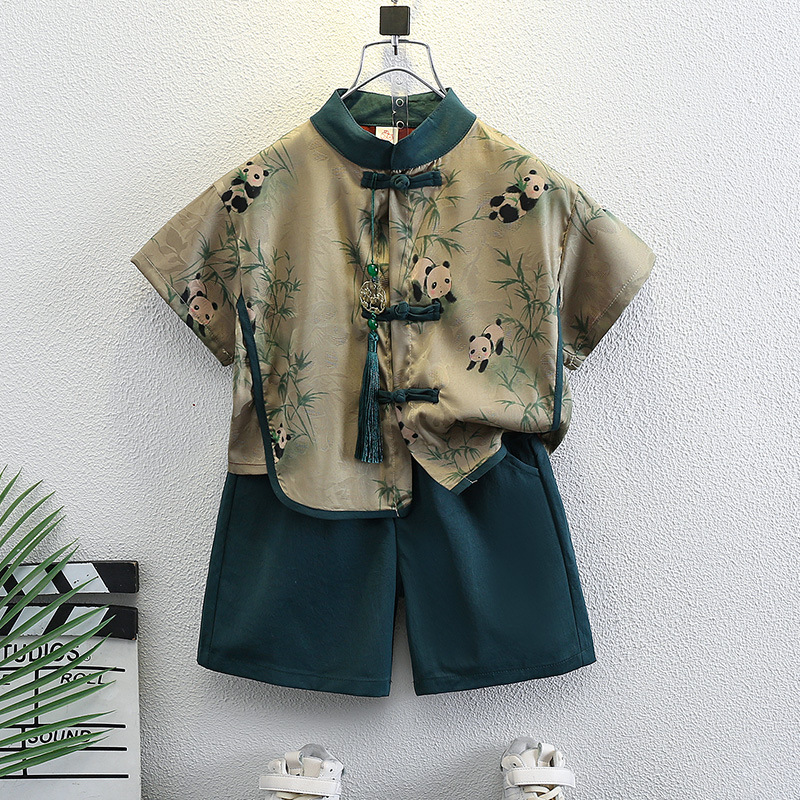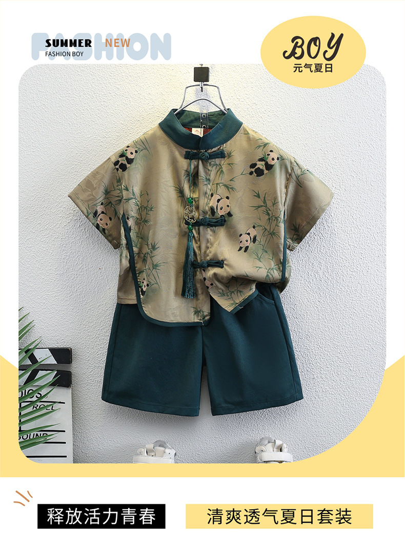 소년의 새로운 중국 스타일 국가 스타일 세트 2025 새로운 어린이 탕 세트 한푸 여름 반팔 탑 바지 투피스 세트