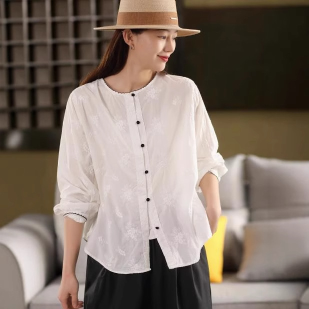 2025 봄 예술적 면화 셔츠 달콤한 레이스 칼라 싱글 브레스트 긴팔 셔츠 우아한 카디건 탑