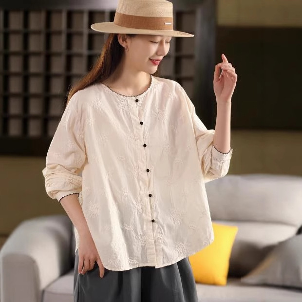 2025 봄 예술적 면화 셔츠 달콤한 레이스 칼라 싱글 브레스트 긴팔 셔츠 우아한 카디건 탑스토어 가기