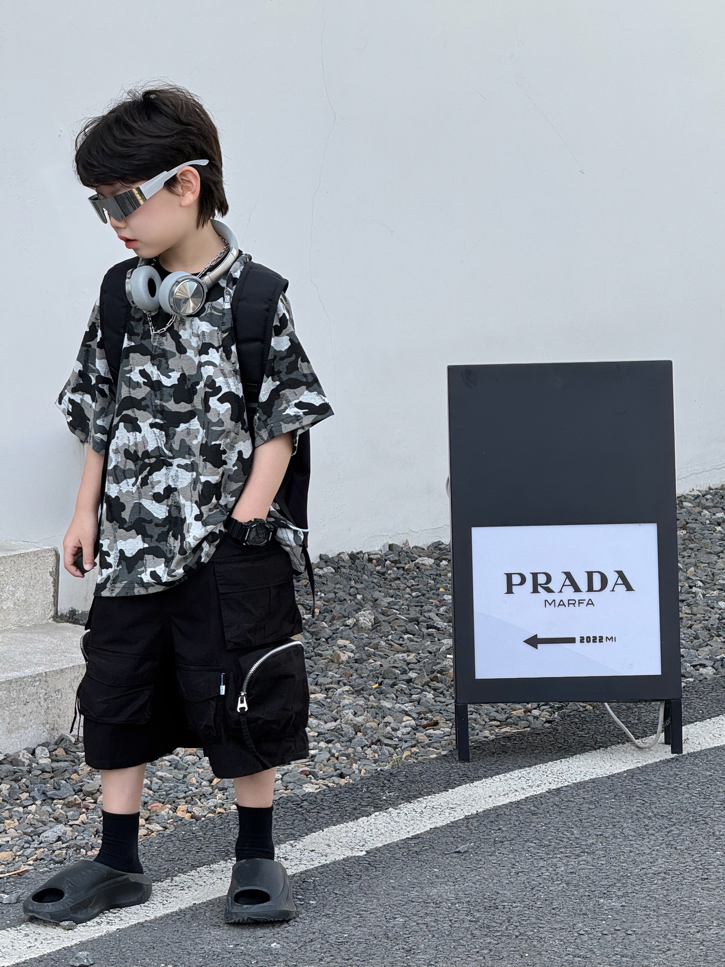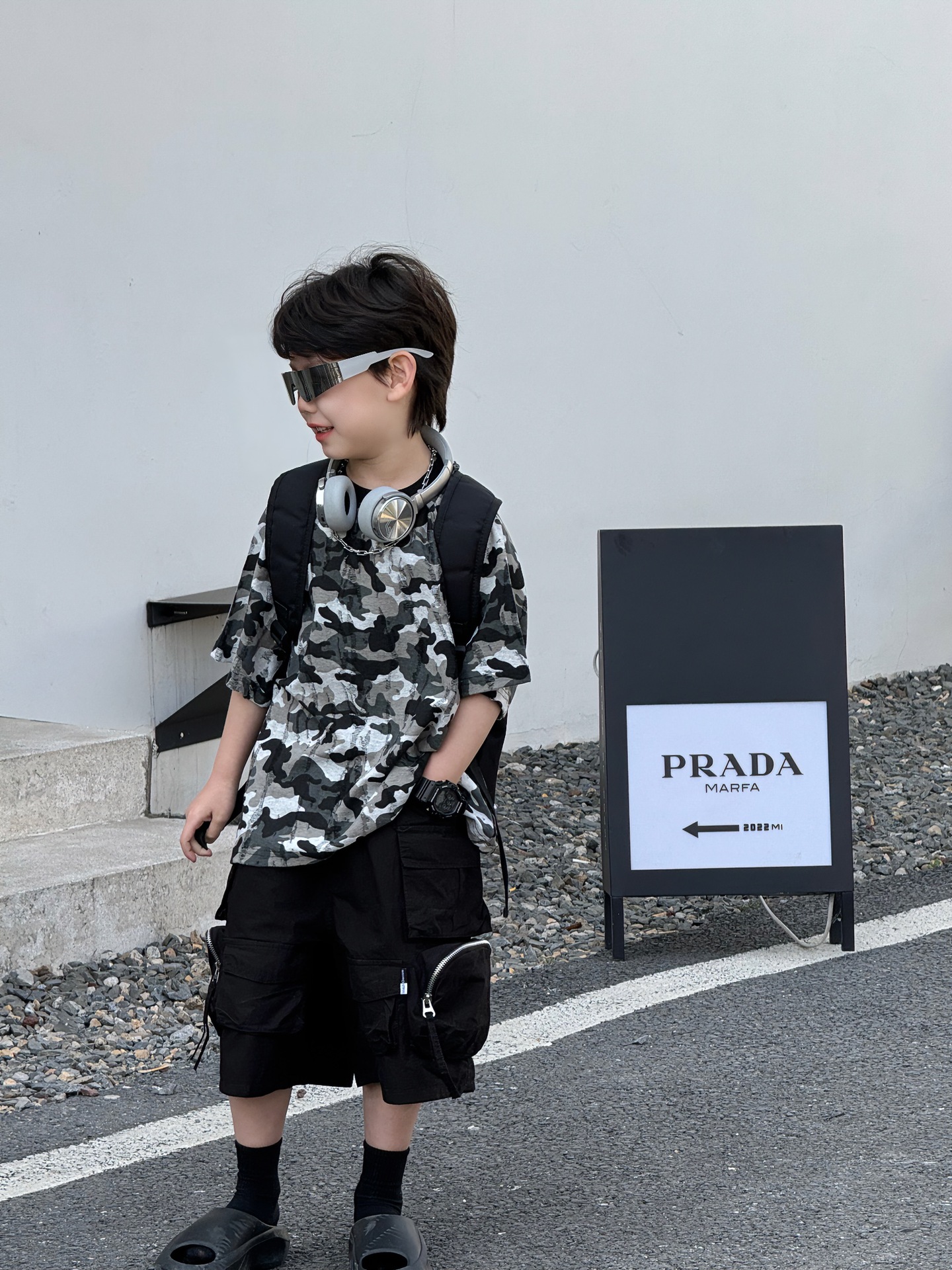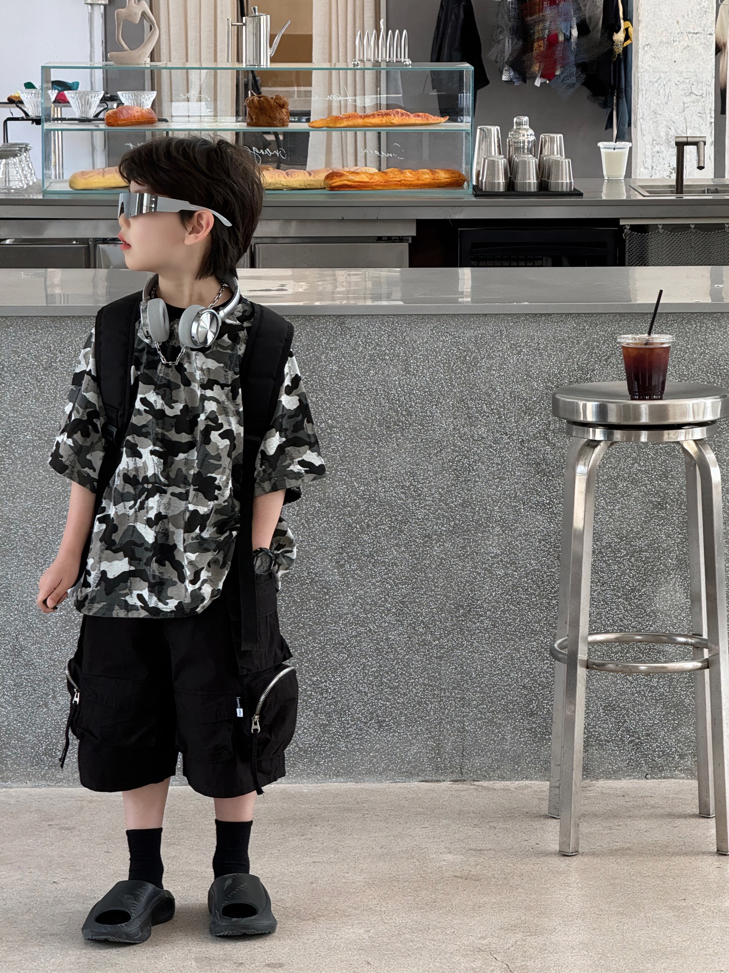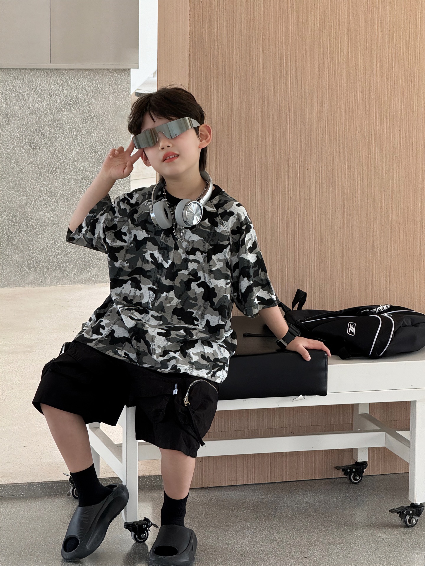 티루 2025 여름 새로운 한국 스타일 소년의 푹신한 잘 생긴 위장 미국 풀오버 티셔츠 어린이 짧은 소매 트렌디 탑