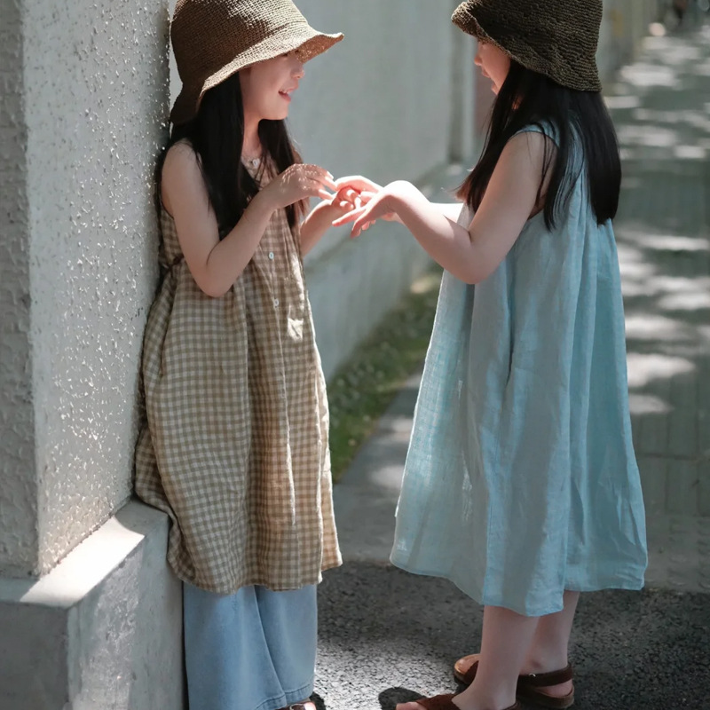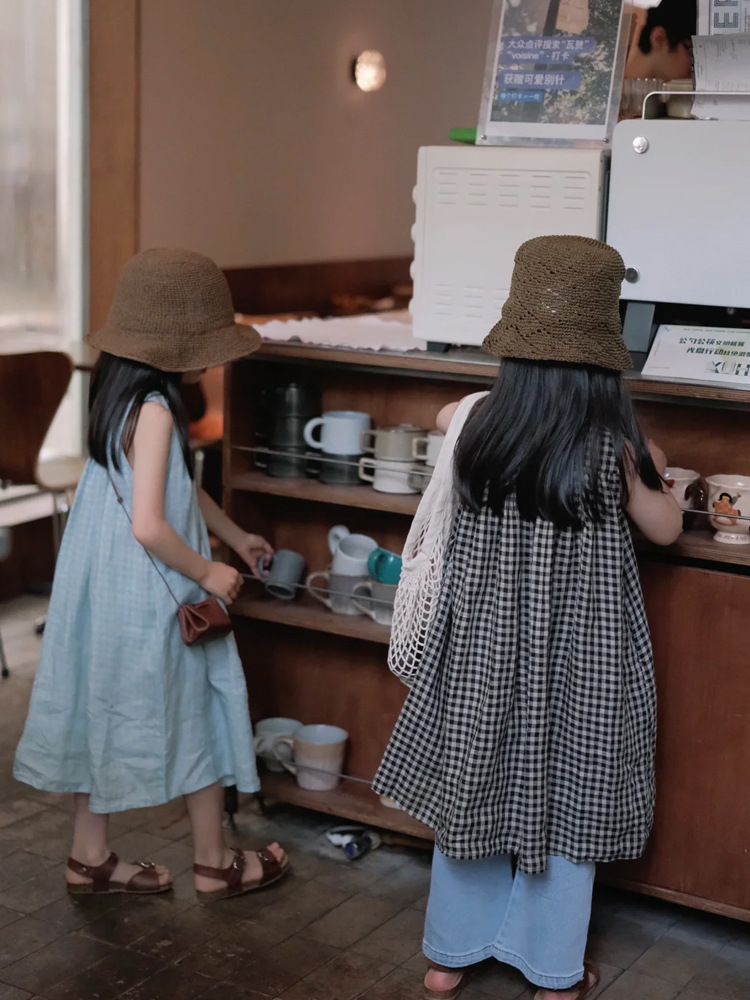 한국 시스터즈 걸스 원피스 2025 년 새 여름 어린이 캐주얼 루스 레트로 격자 무늬 원피스 면화스토어 가기