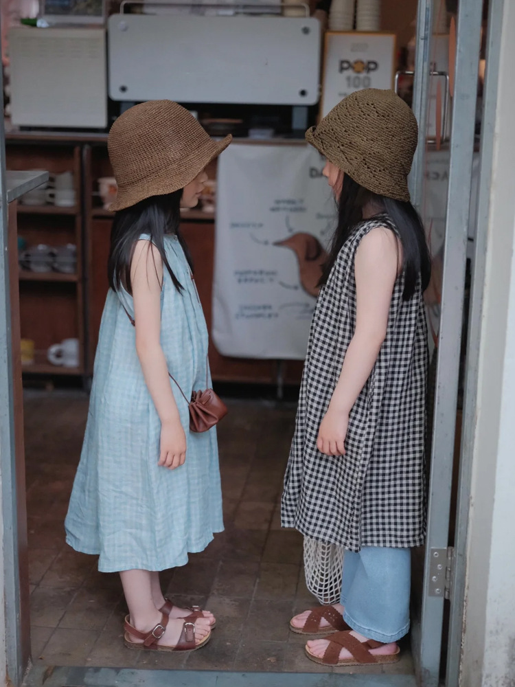 한국 시스터즈 걸스 원피스 2025 년 새 여름 어린이 캐주얼 루스 레트로 격자 무늬 원피스 면화