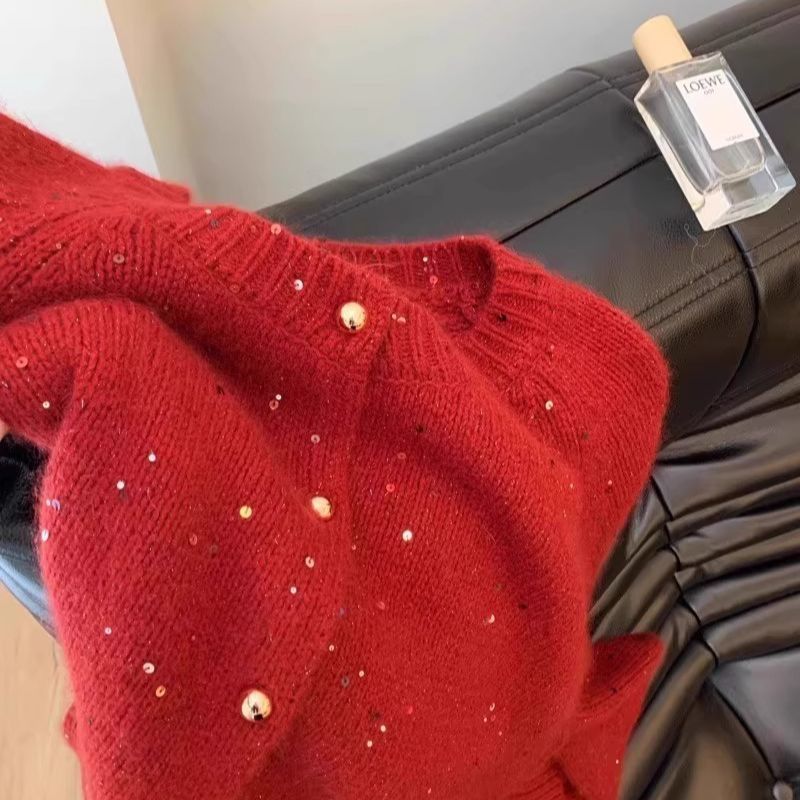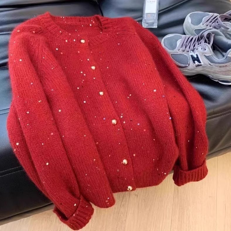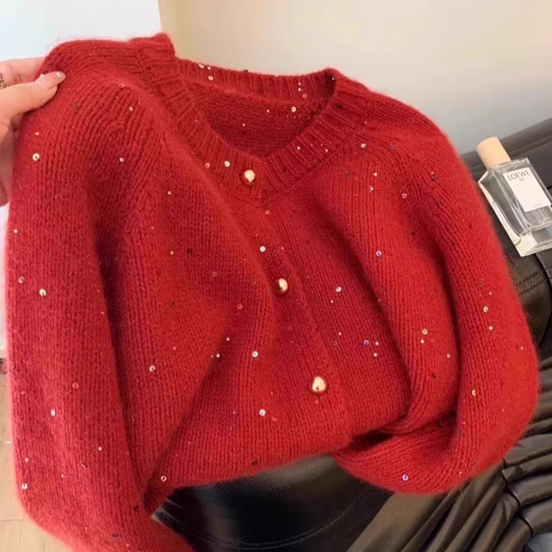 여성을위한 빨간색 새해 스팽글 스웨터 코트 봄 시즌 한국어 버전 디자인 새해 동물 년 니트 카디건 탑
