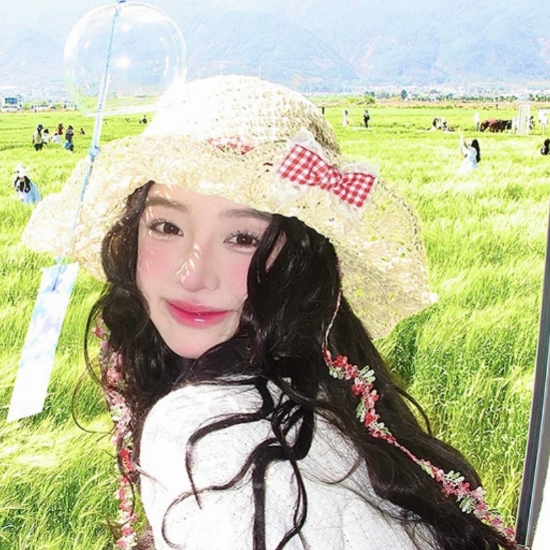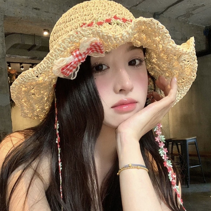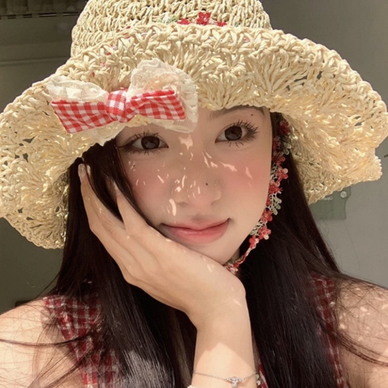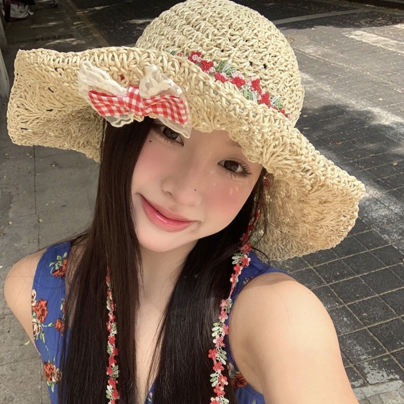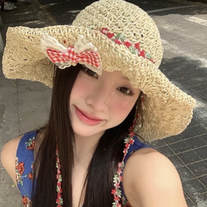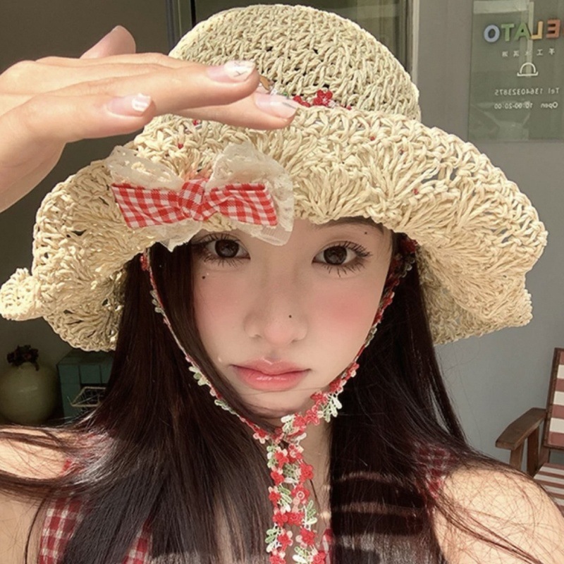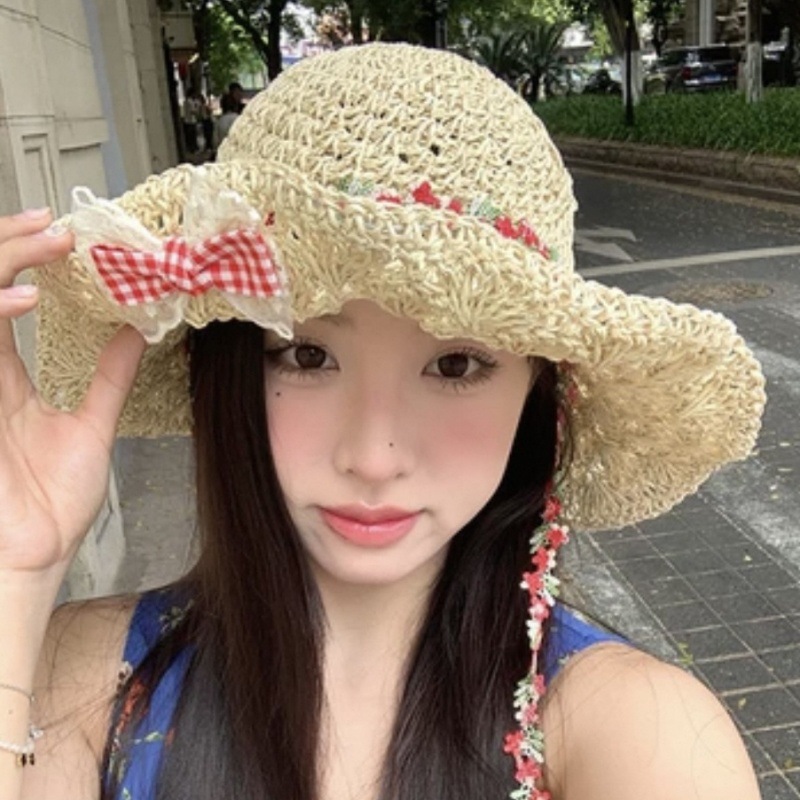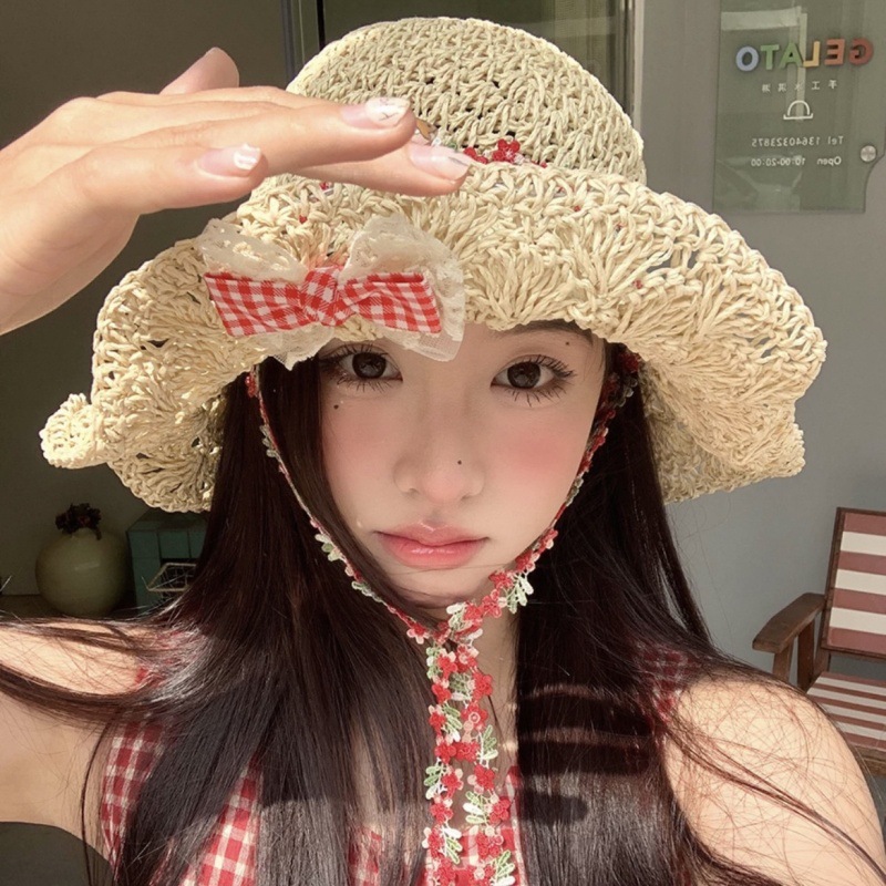 격자 무늬 활 짚 모자 선 스크린 어부 모자 분지 모자 해변 그물 붉은 사진 꽃 소품 UV스토어 가기