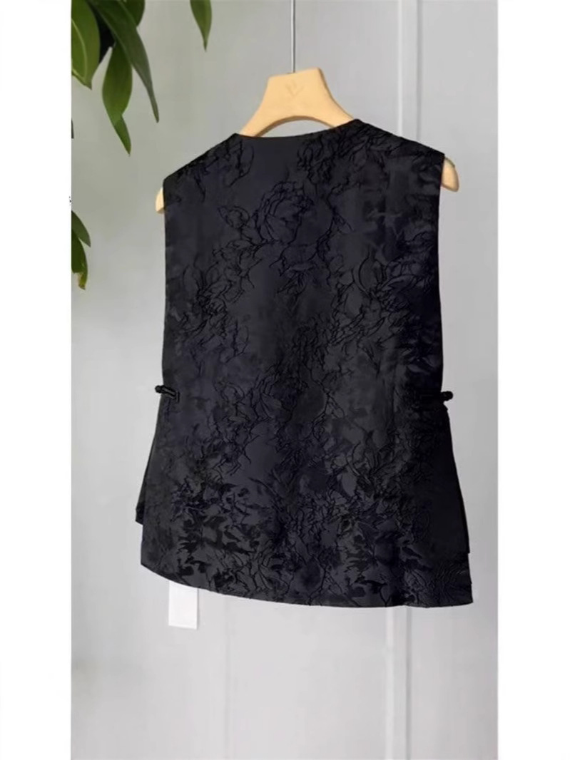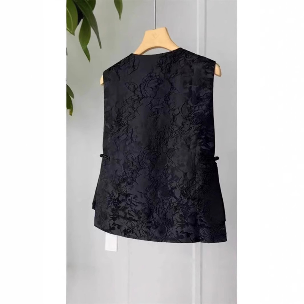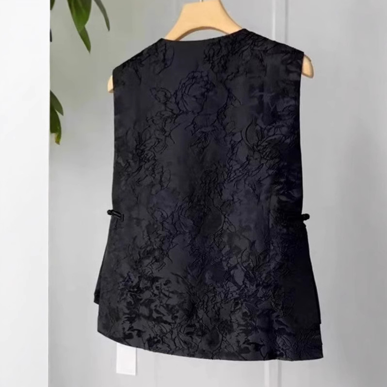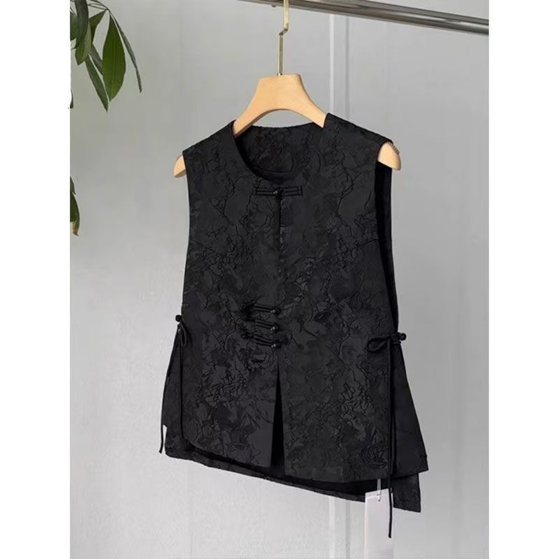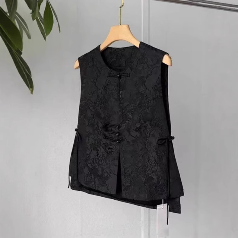 Guofeng 하이 엔드 블랙 자카드 조끼 여자 여름 레트로 새로운 중국 스타일 버튼 라운드 넥 웨이스트 코트 탑