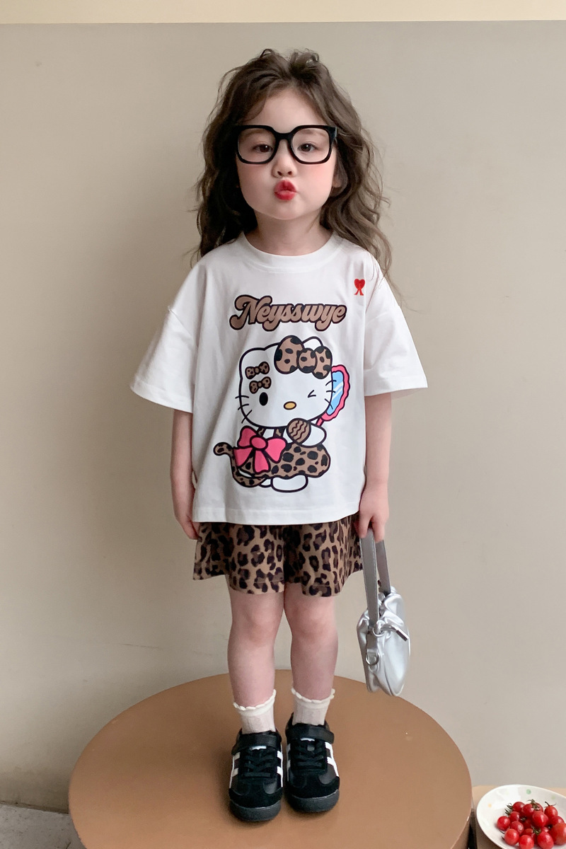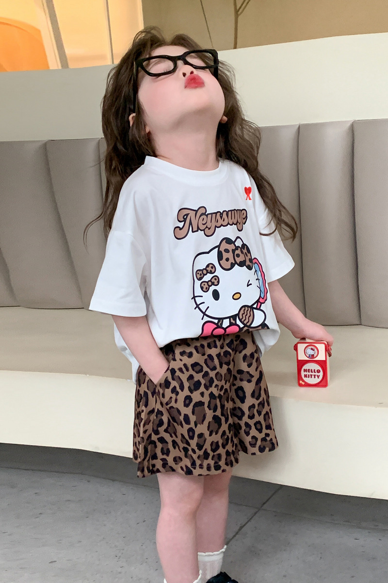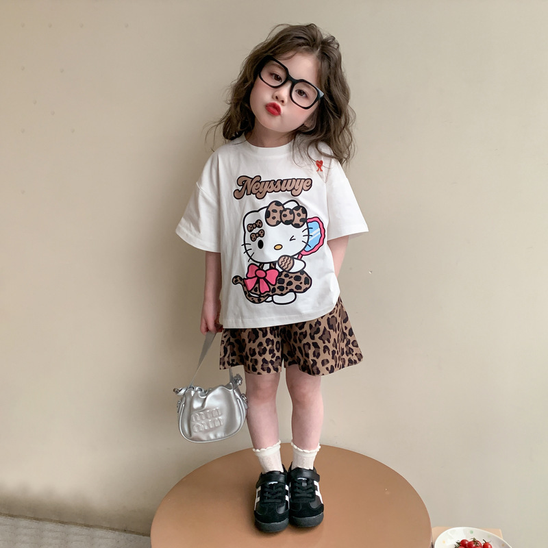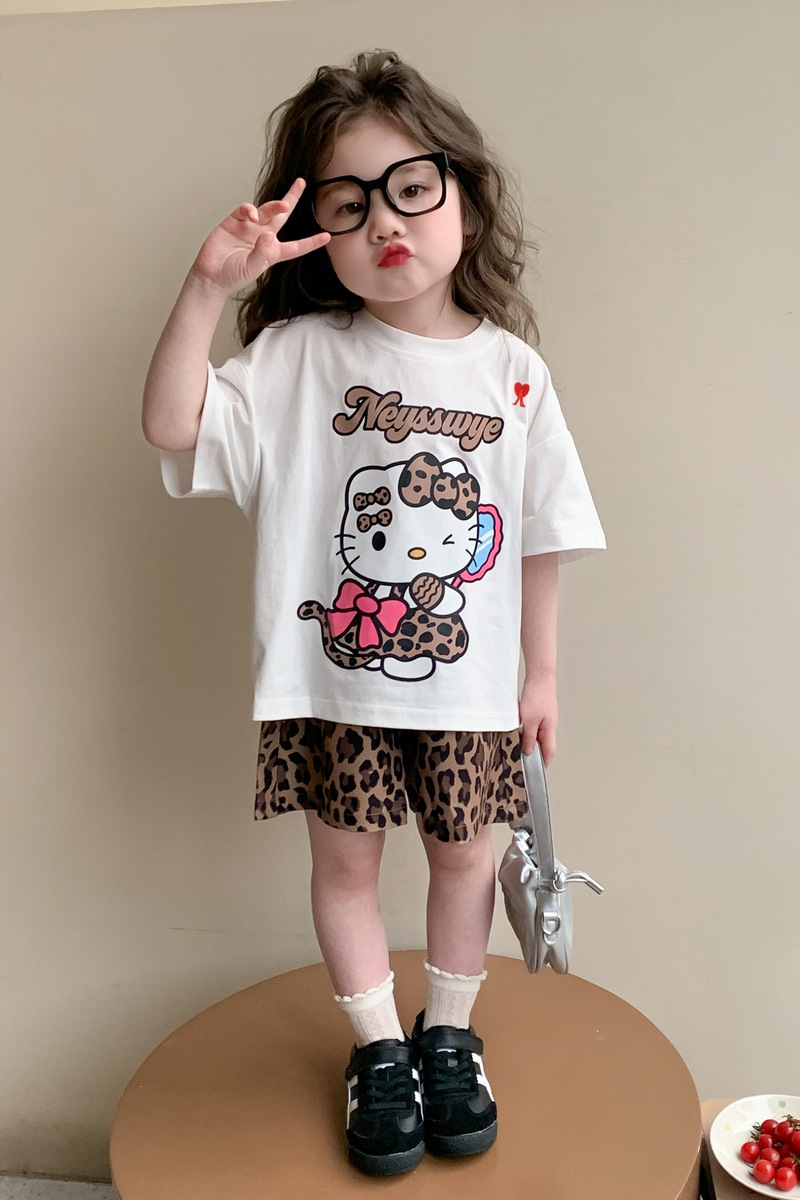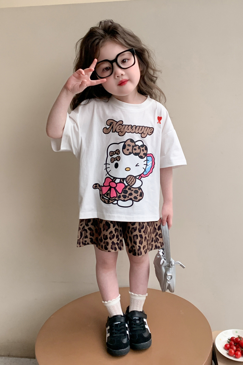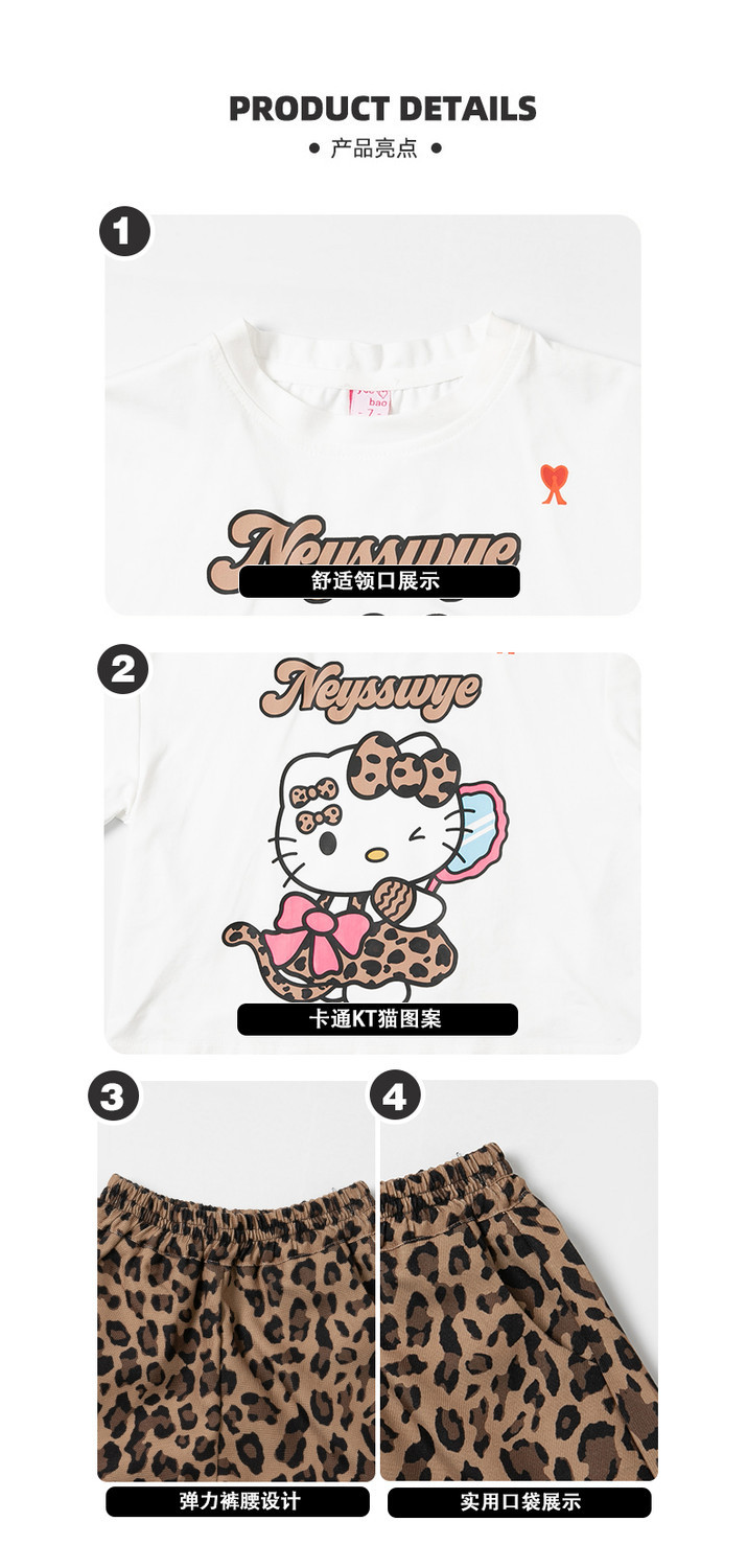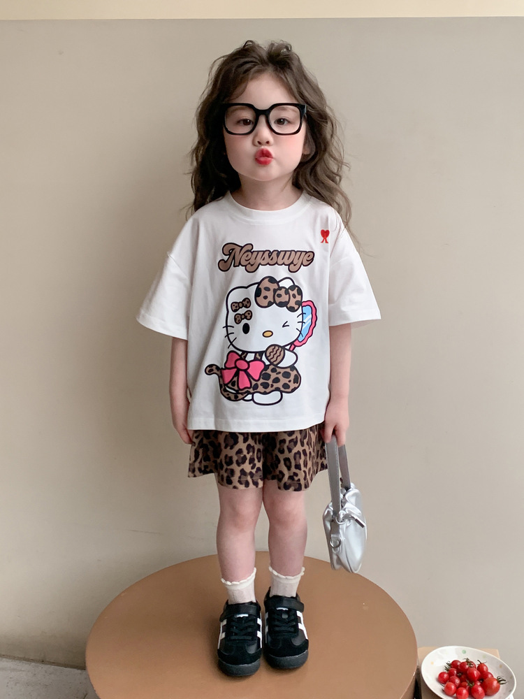 2025夏季新款女中小童洋气百搭豹纹短裤kt猫印花短袖套装