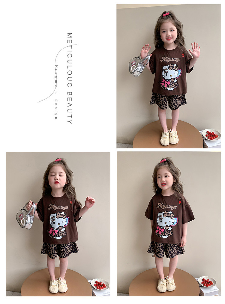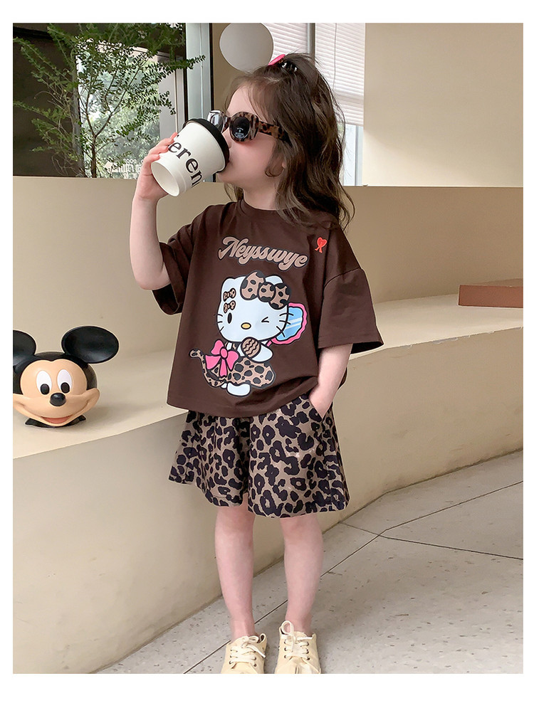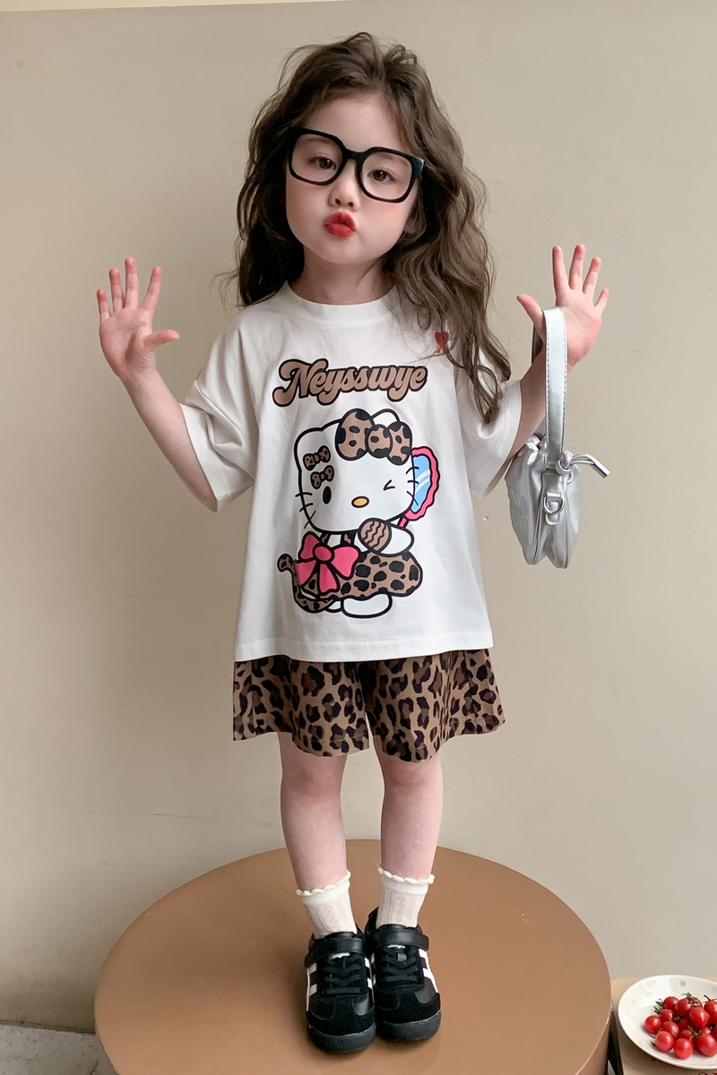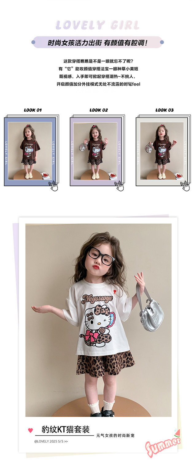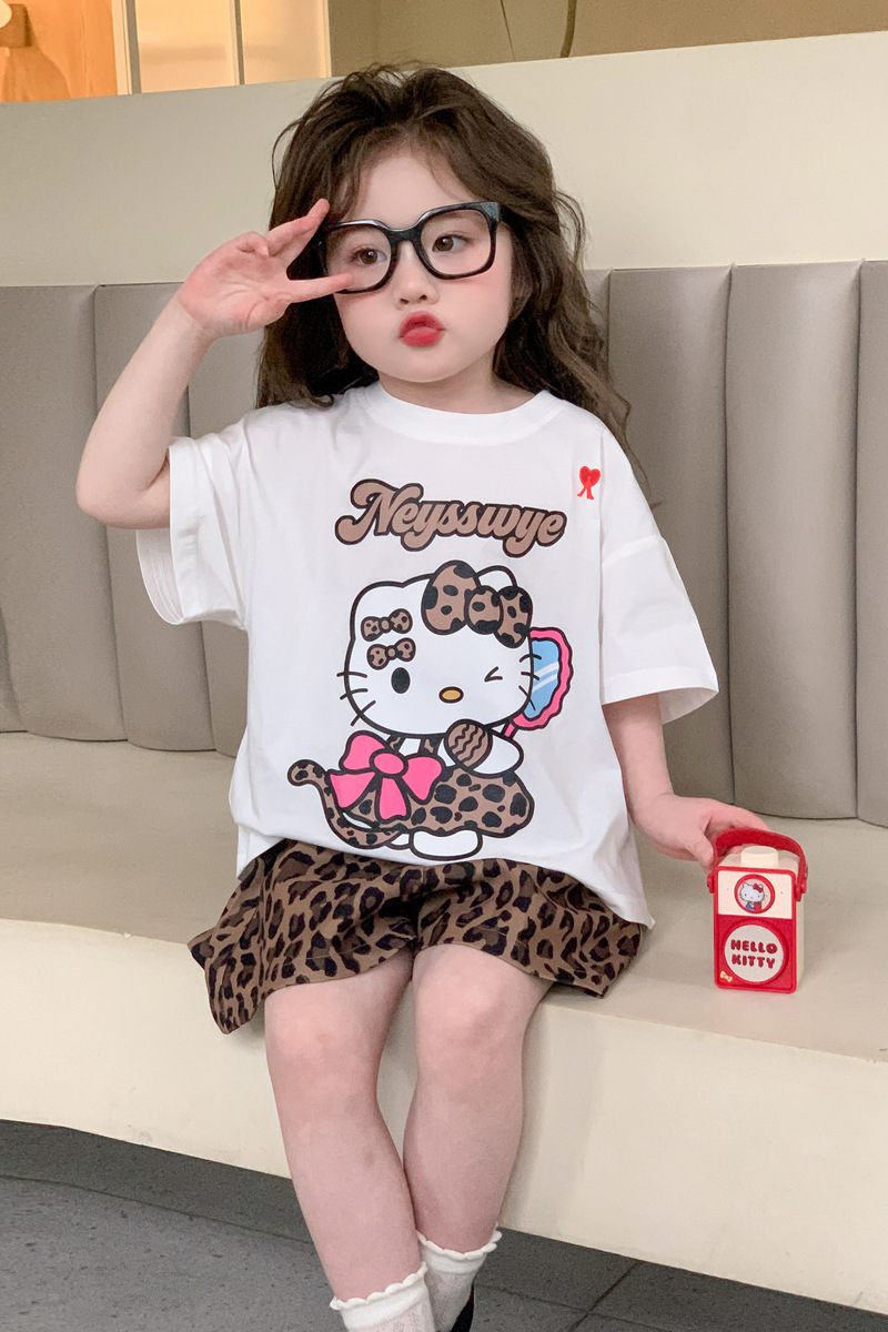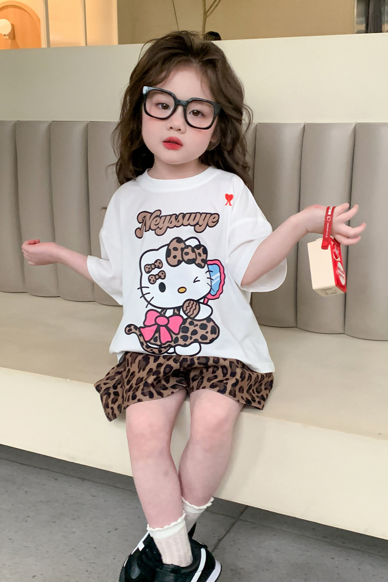 2025夏季新款女中小童洋气百搭豹纹短裤kt猫印花短袖套装
