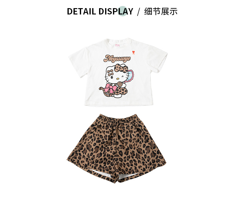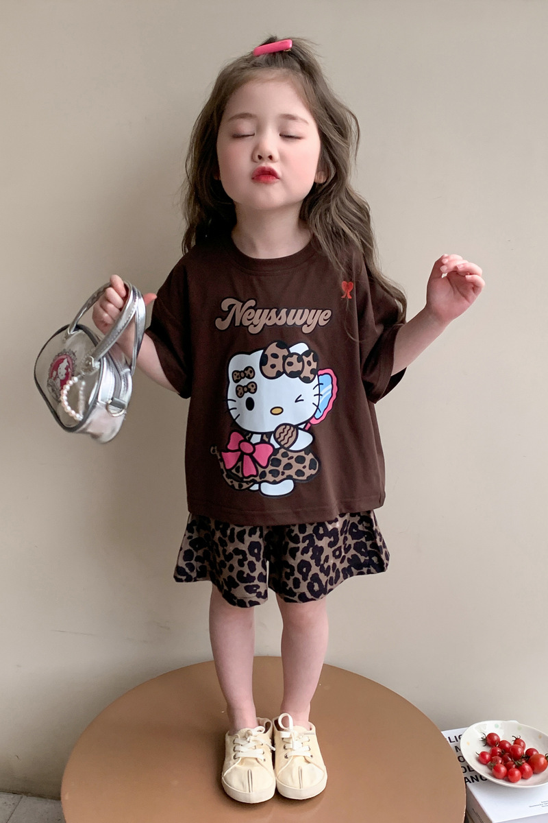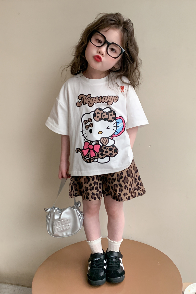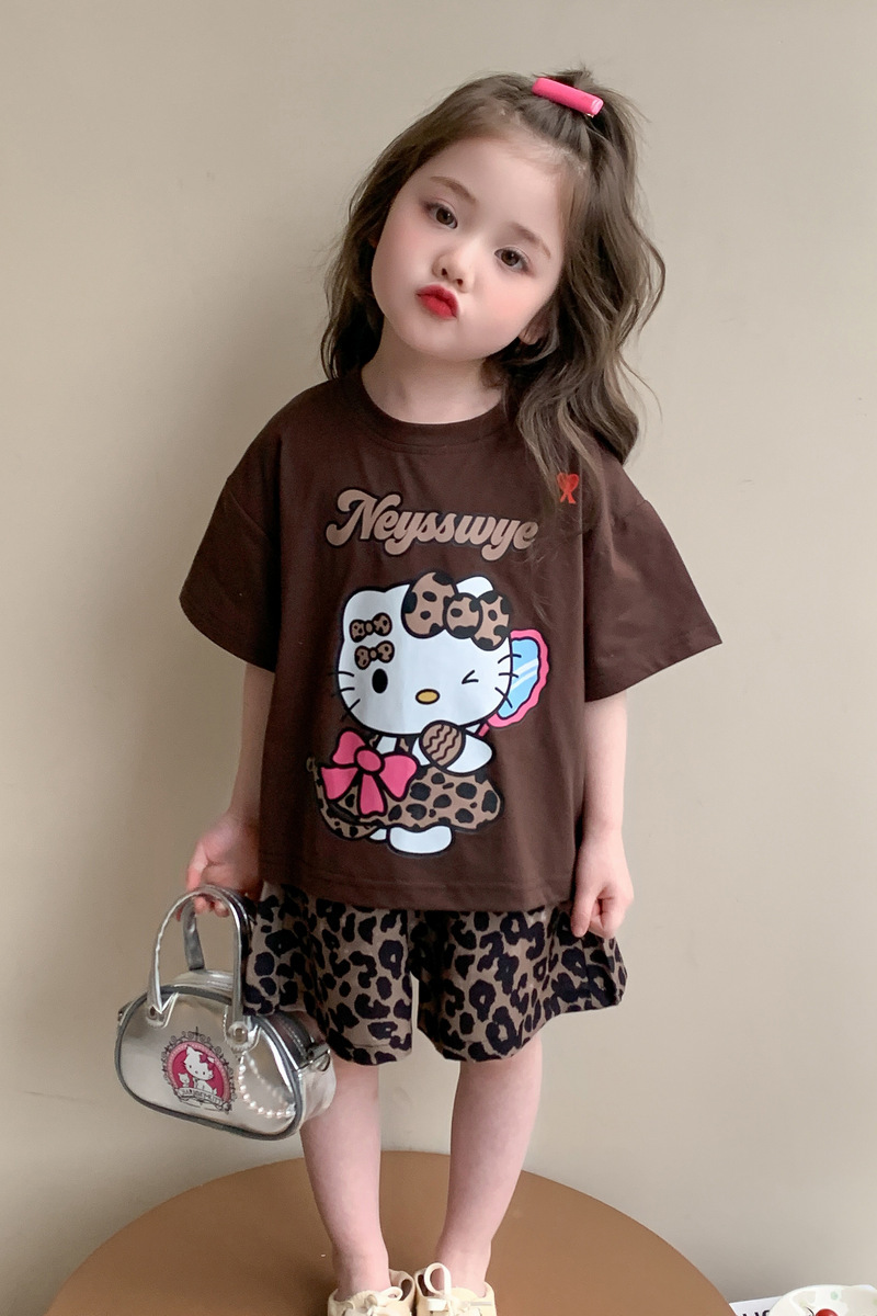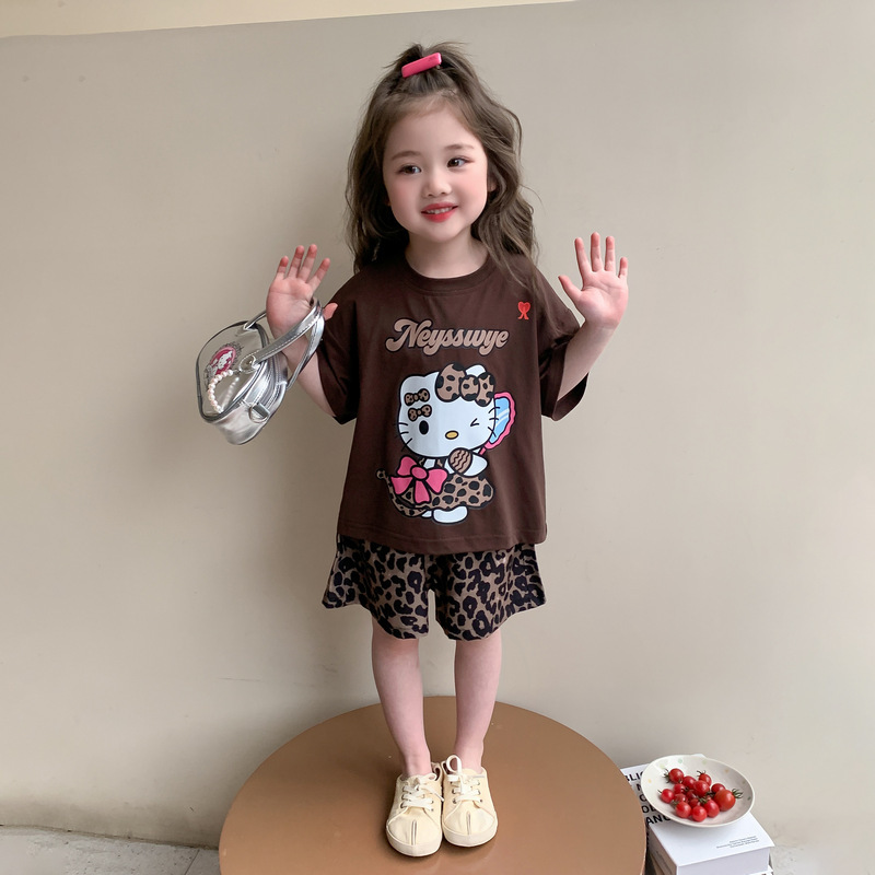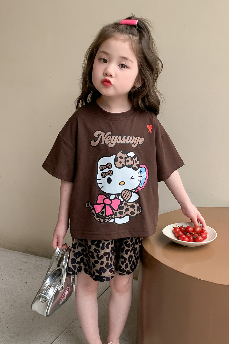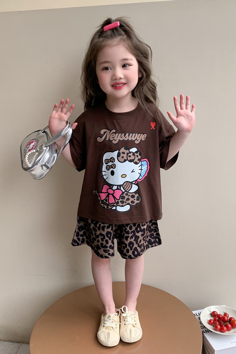 2025夏季新款女中小童洋气百搭豹纹短裤kt猫印花短袖套装