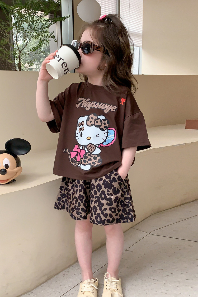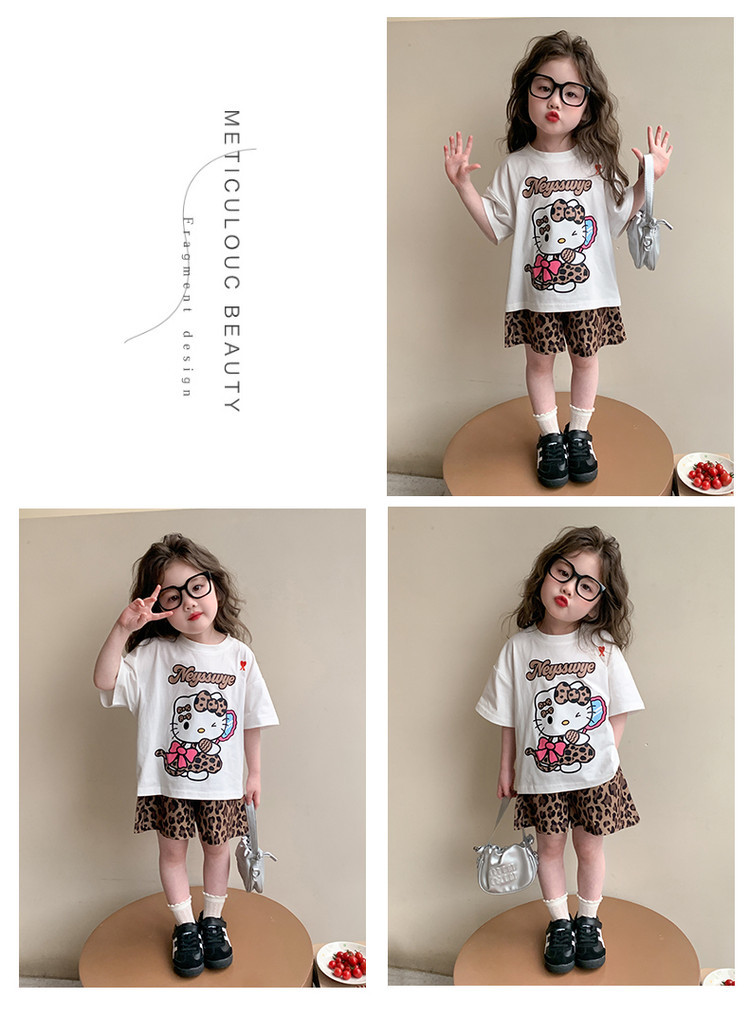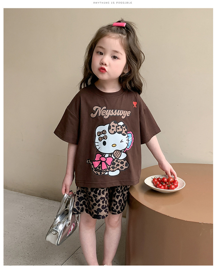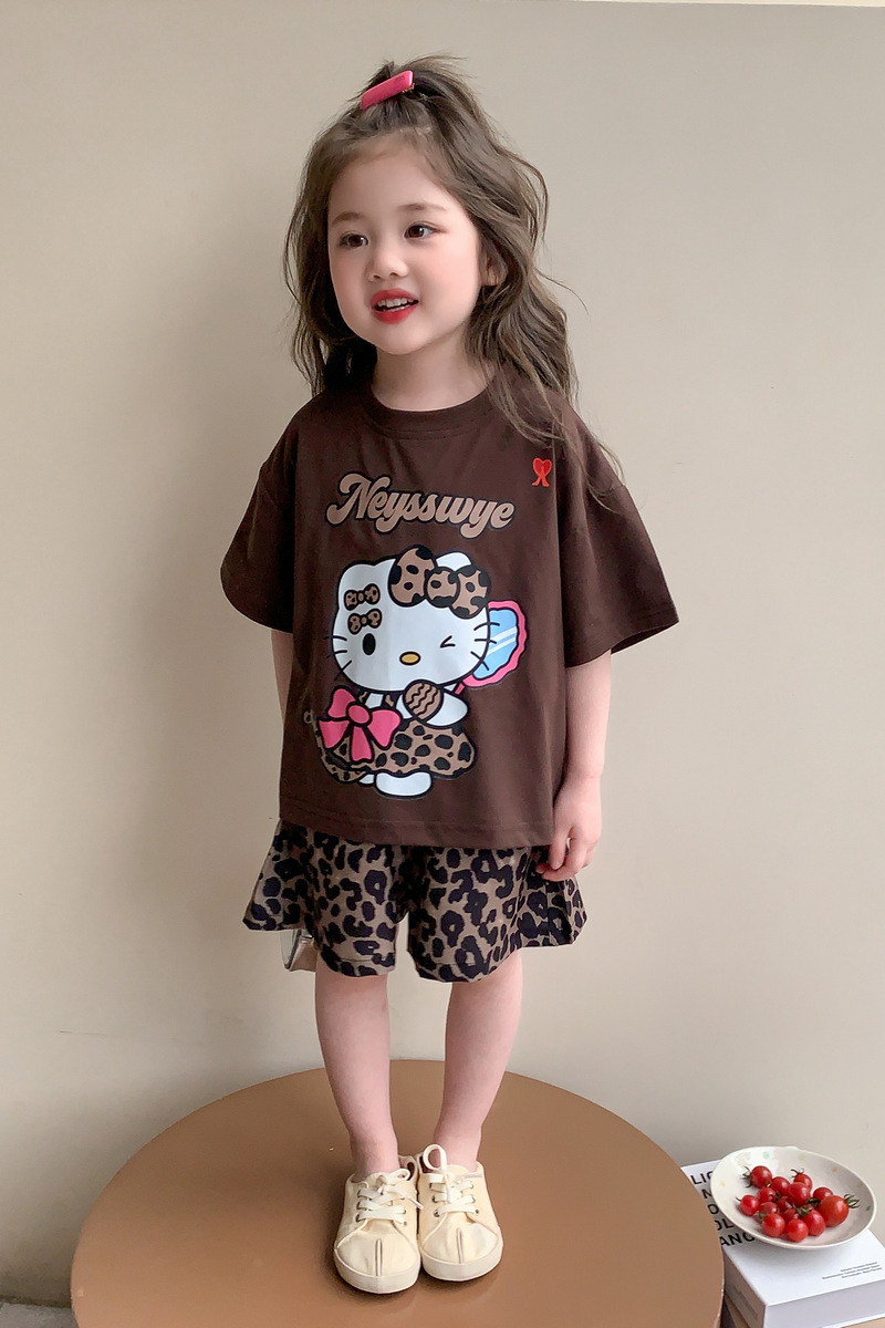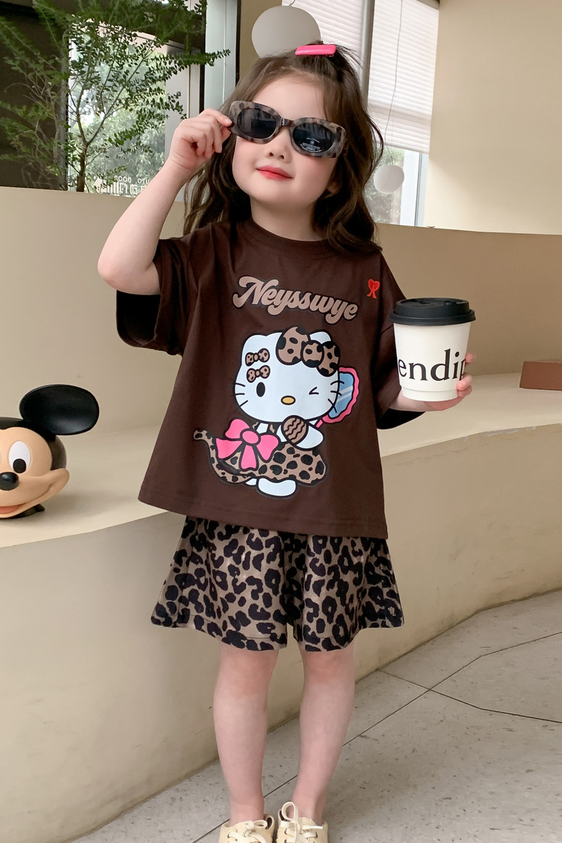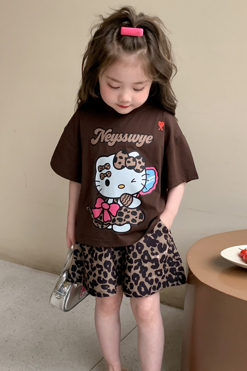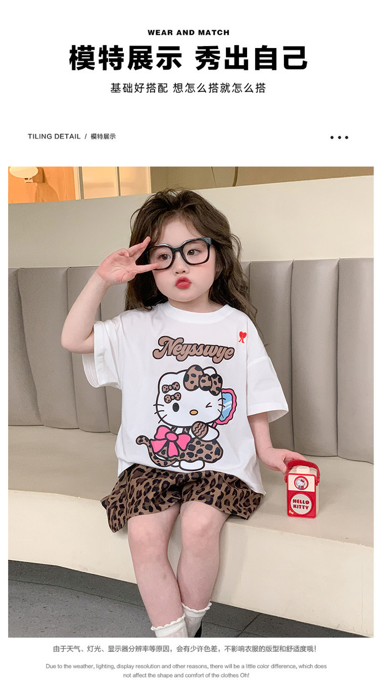 2025夏季新款女中小童洋气百搭豹纹短裤kt猫印花短袖套装