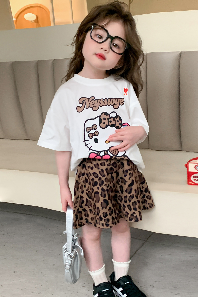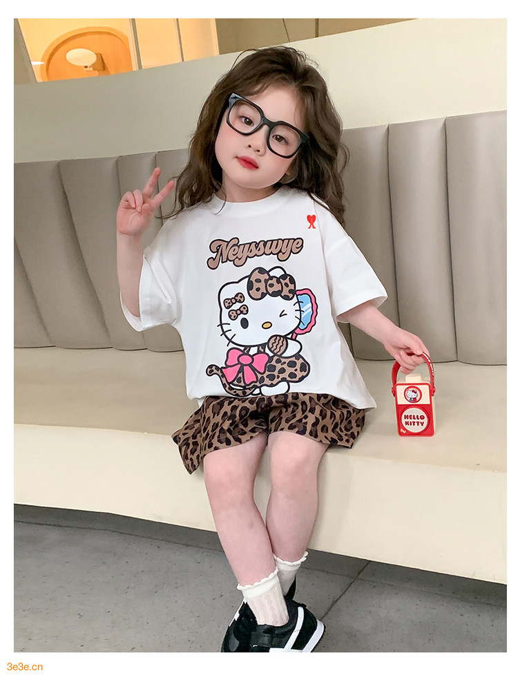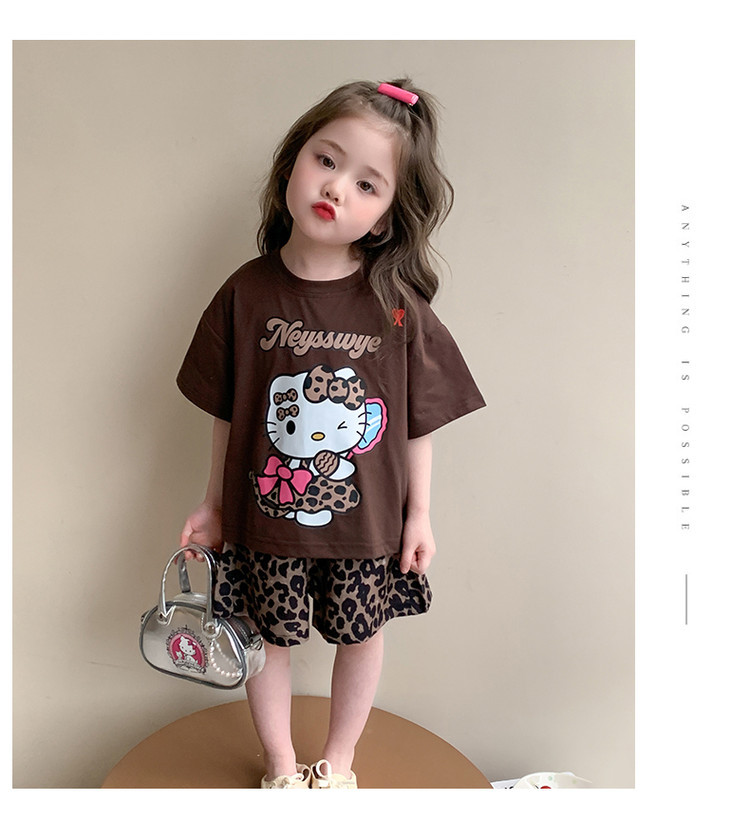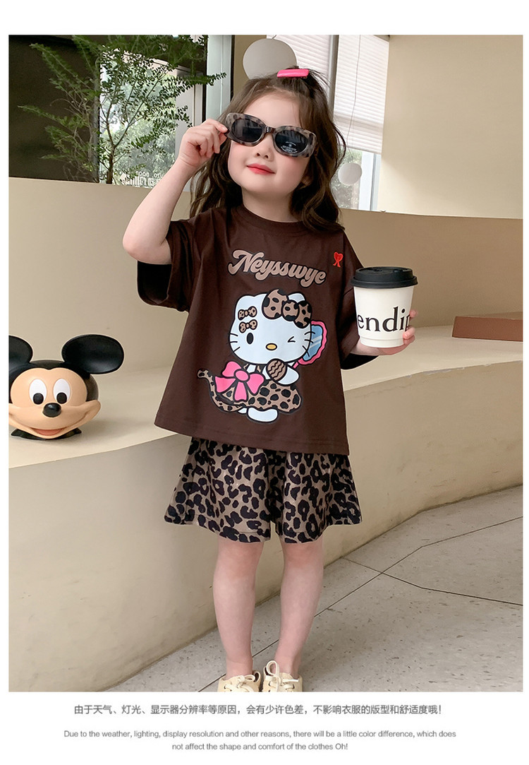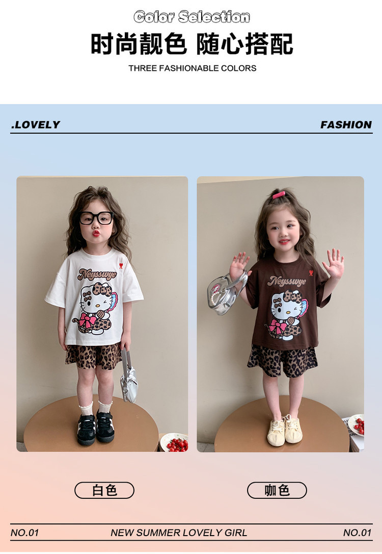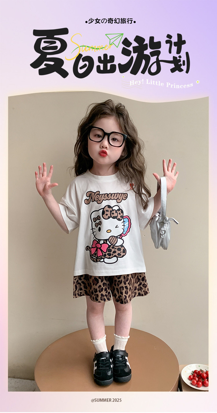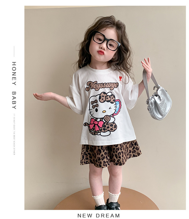2025夏季新款女中小童洋气百搭豹纹短裤kt猫印花短袖套装