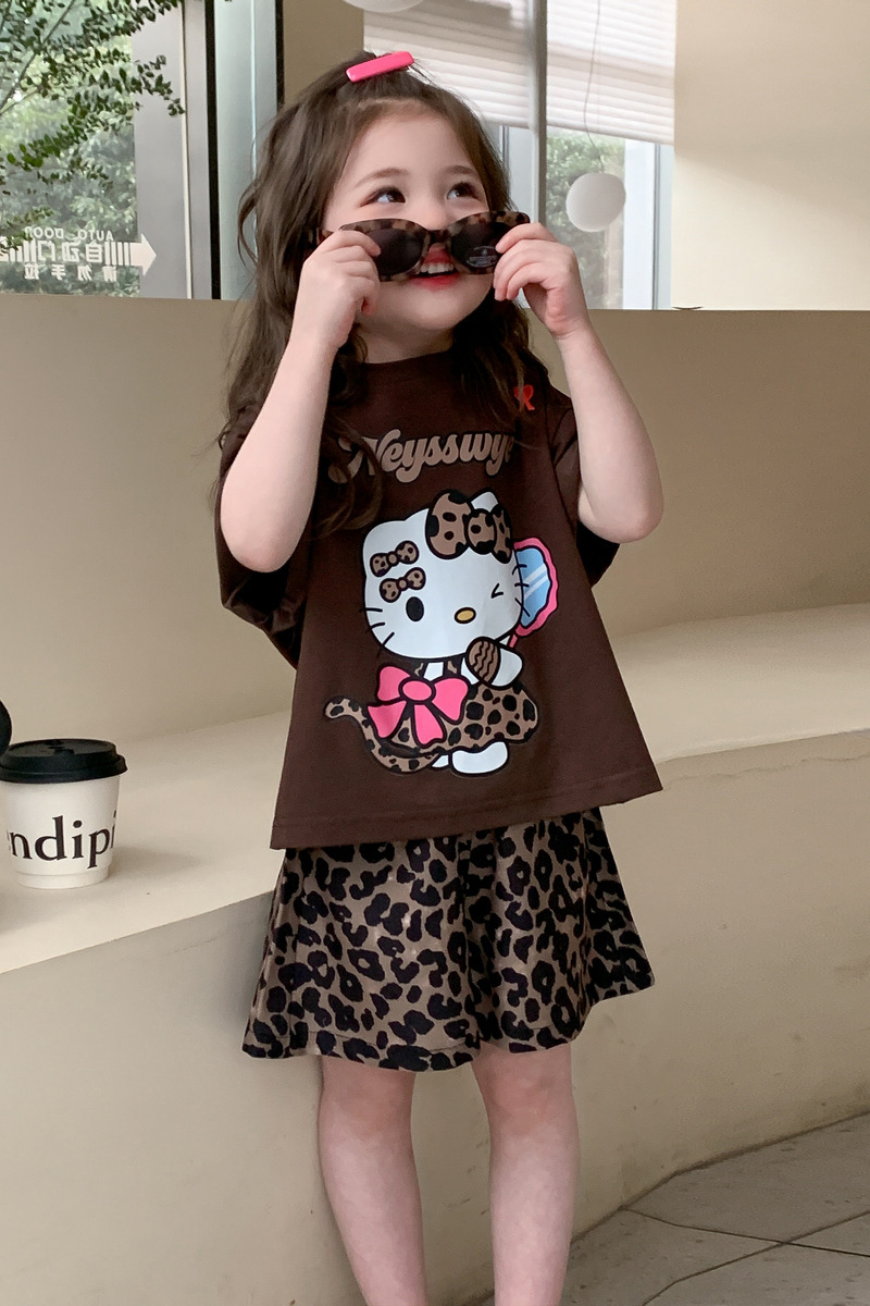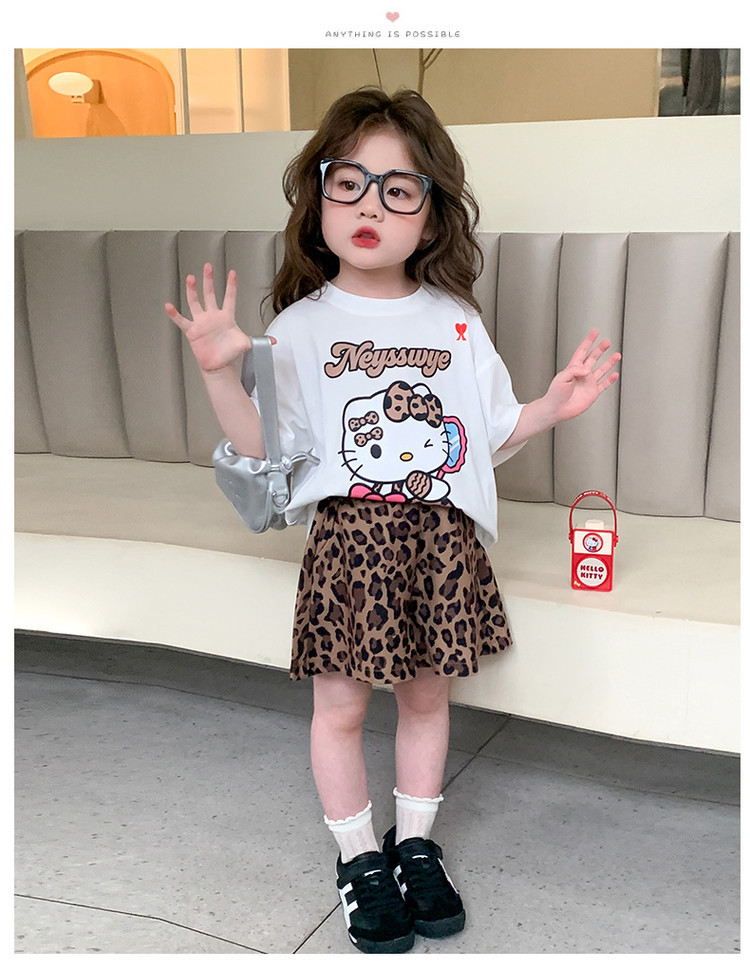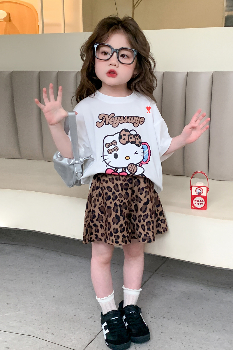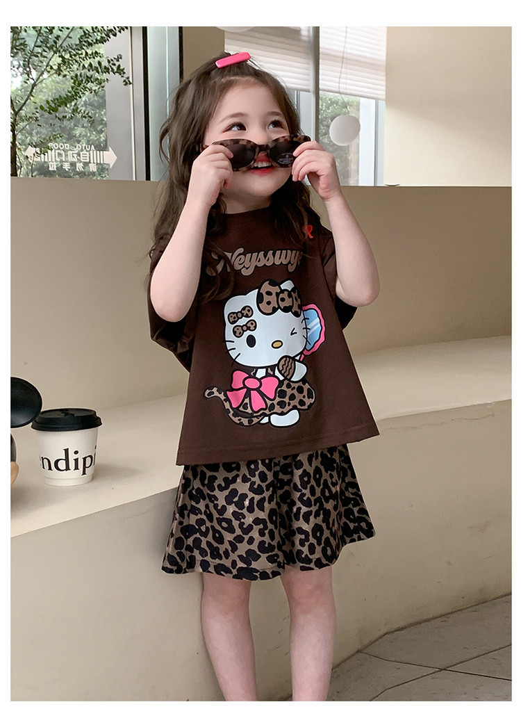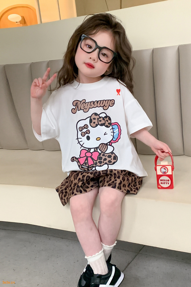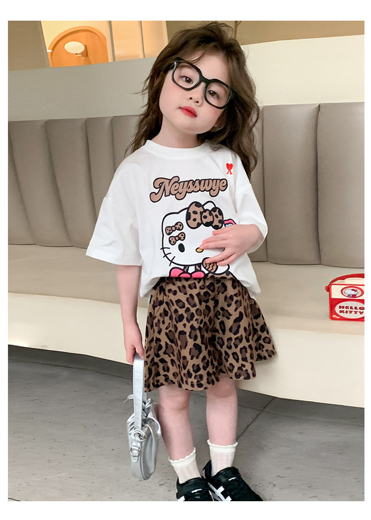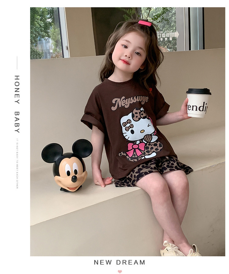2025夏季新款女中小童洋气百搭豹纹短裤kt猫印花短袖套装