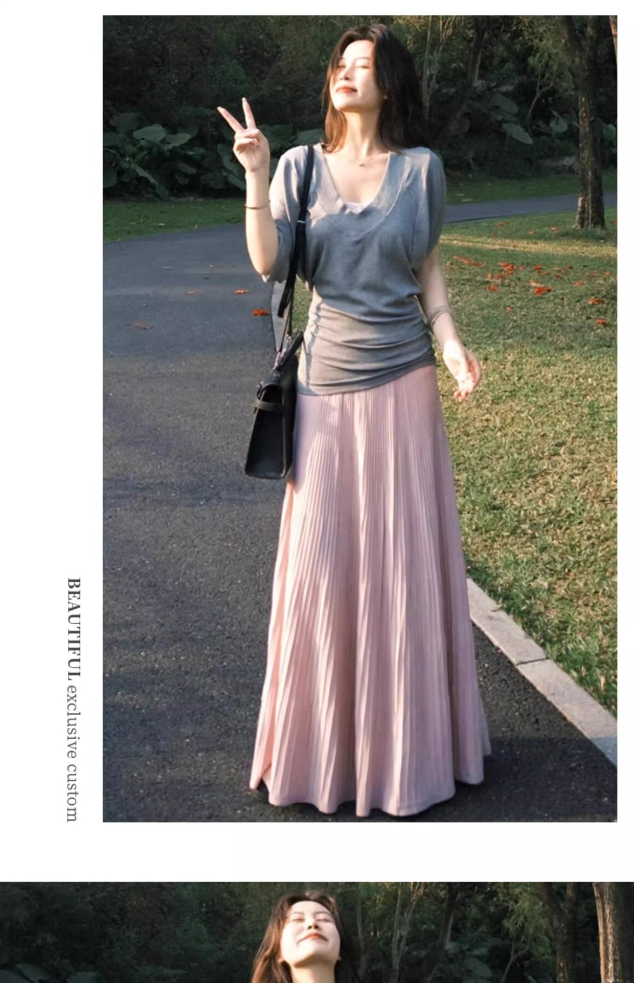 한국 스타일 보라색 주름 치마 여자 여름 2025 새로운 높은 허리 A 라인 엉덩이 커버 우산 스커트 작은 접힌 스커트스토어 가기