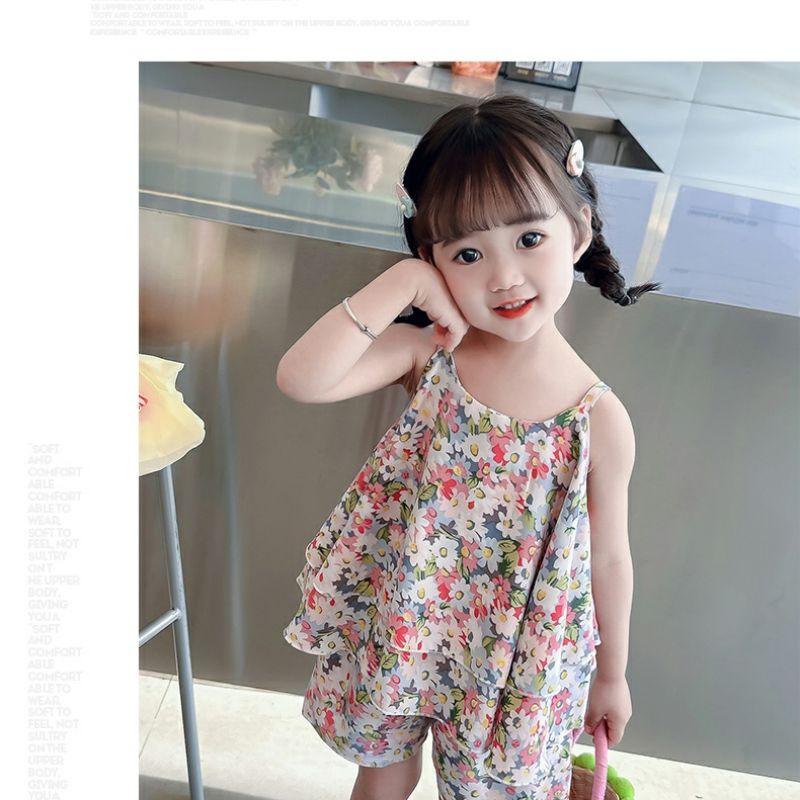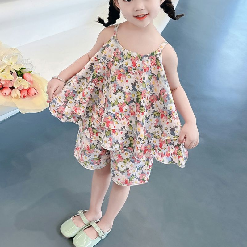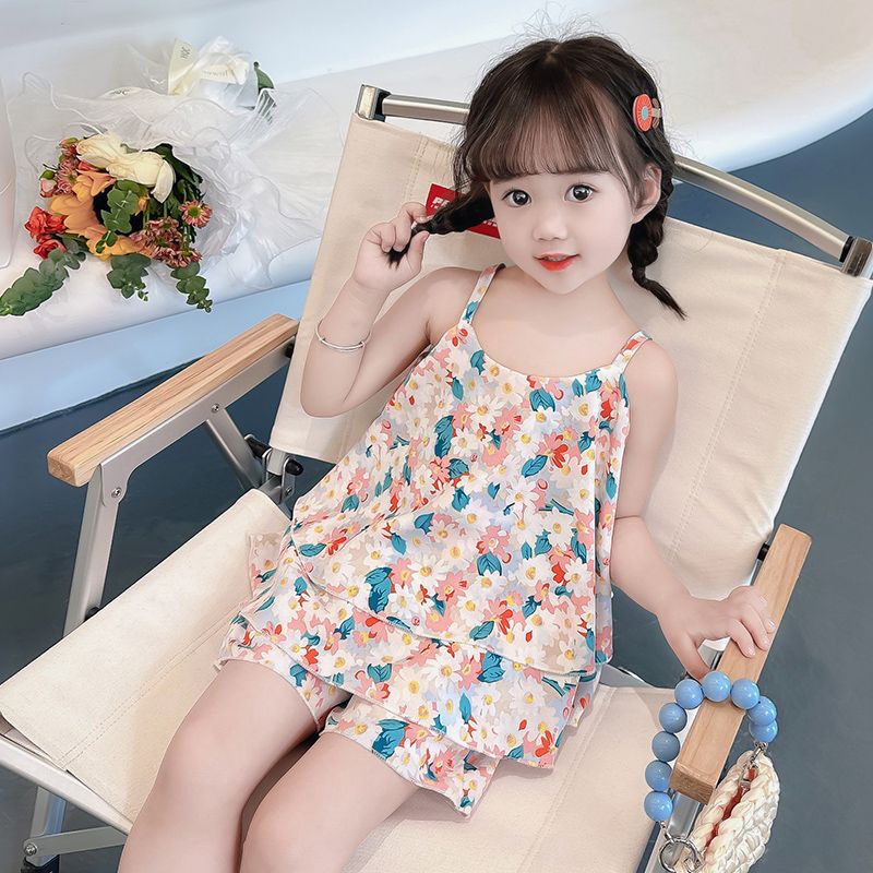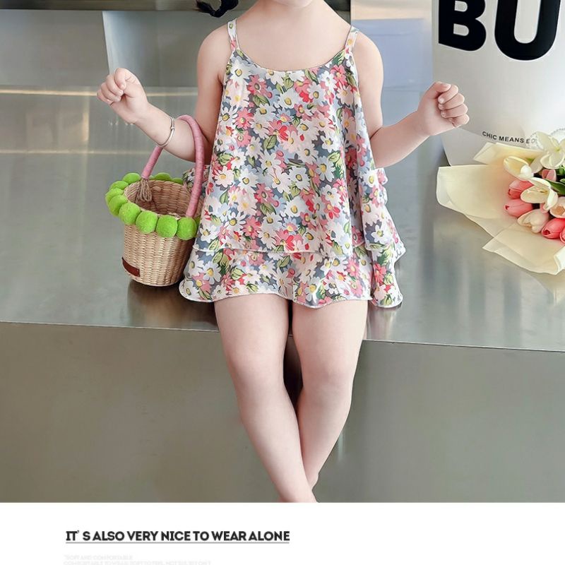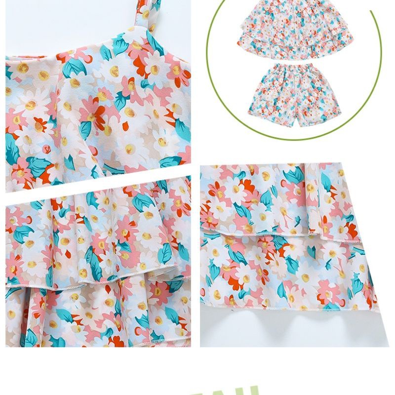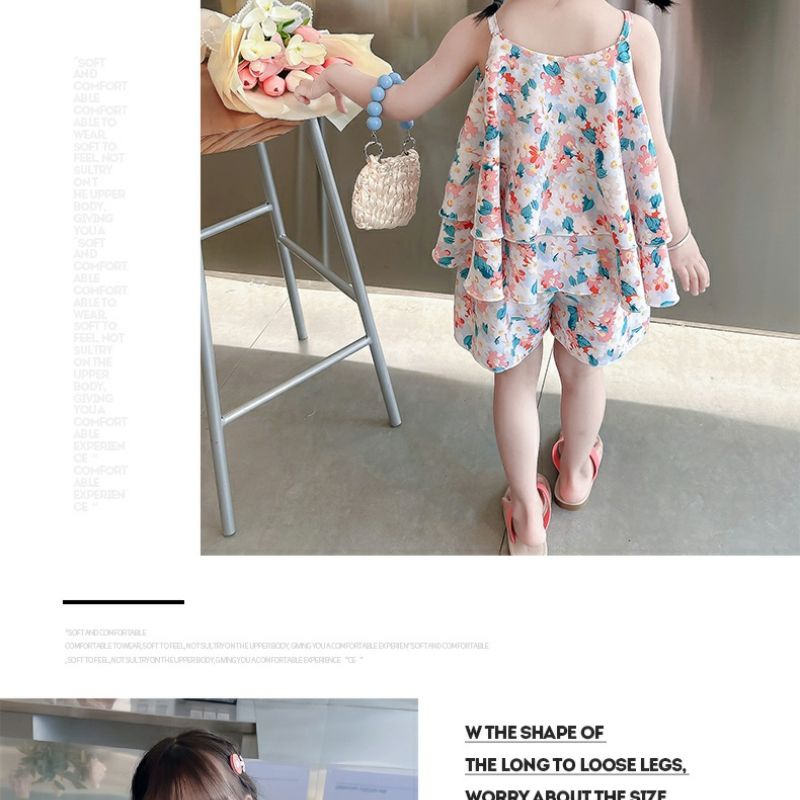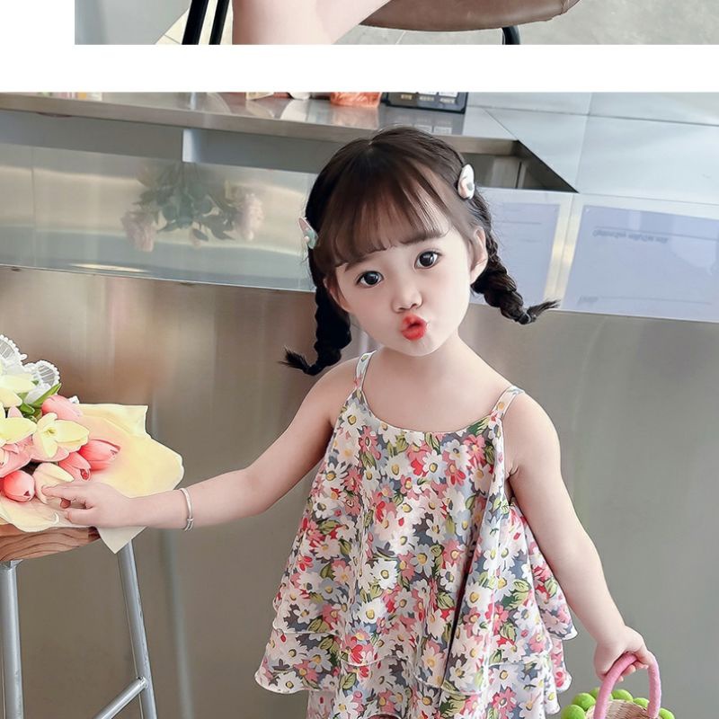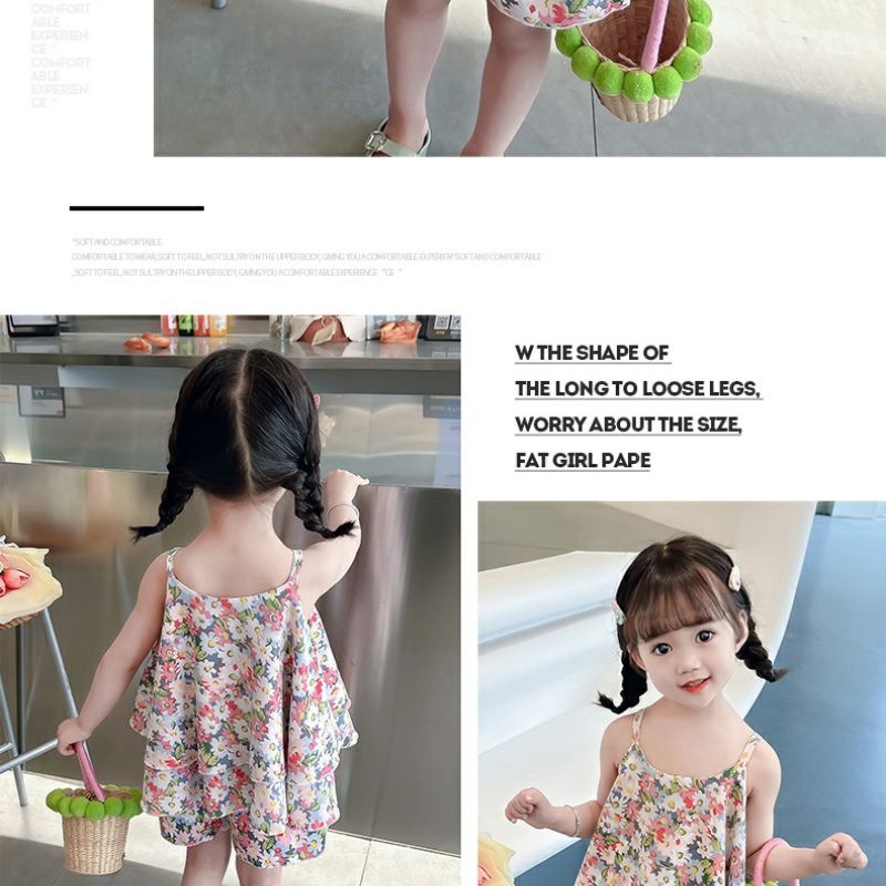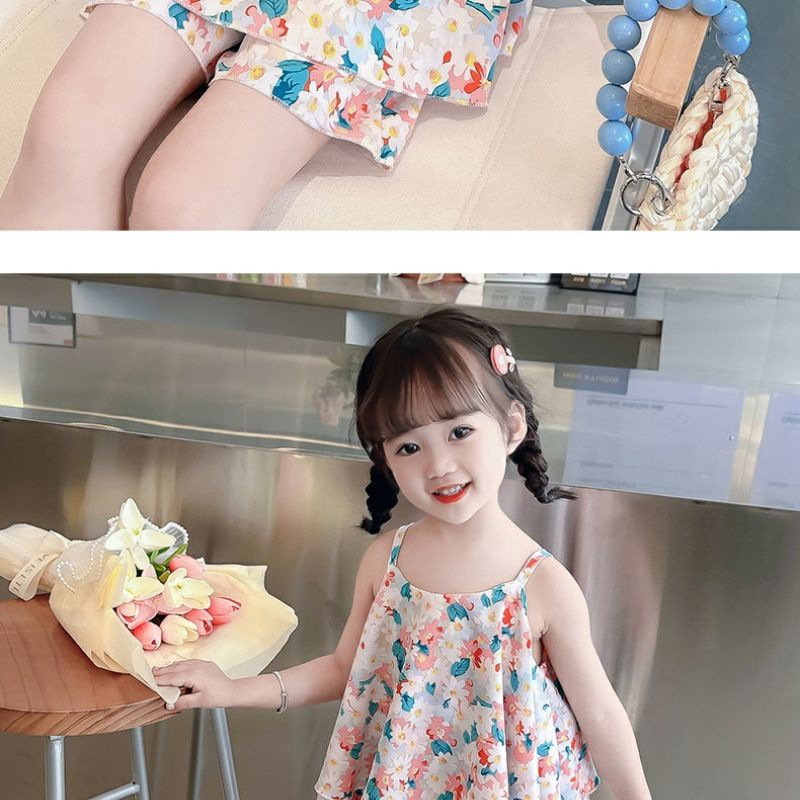 여름 여아 정장, 아기 스타일, 어린이 개성, 트렌디한 한국식 해변 꽃 조끼, 케이크 인형 셔츠 반바지스토어 가기