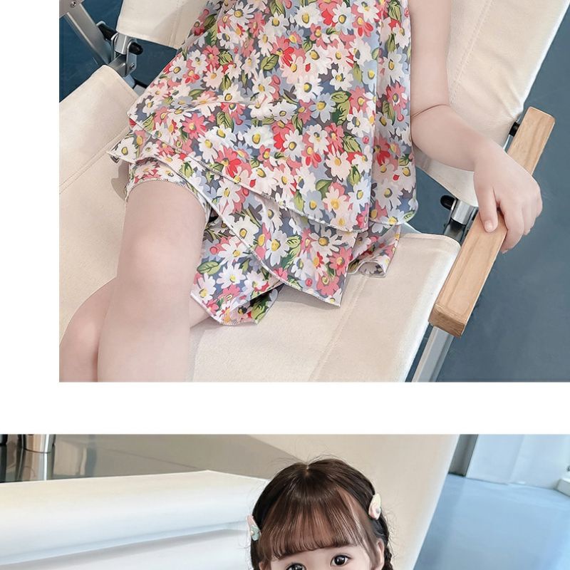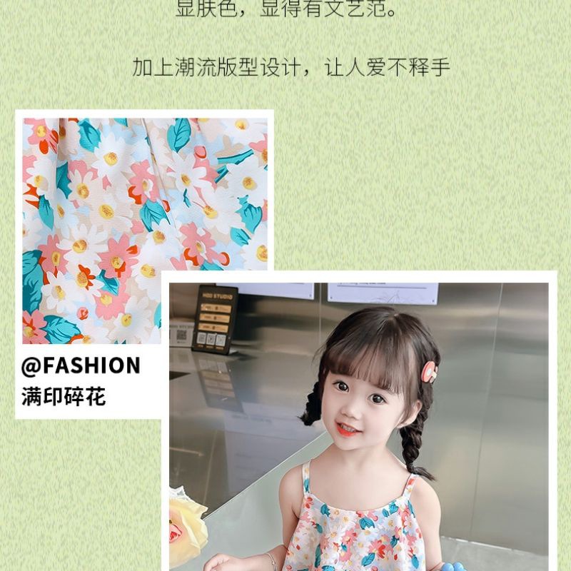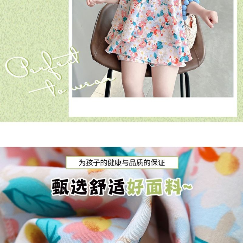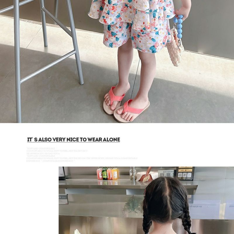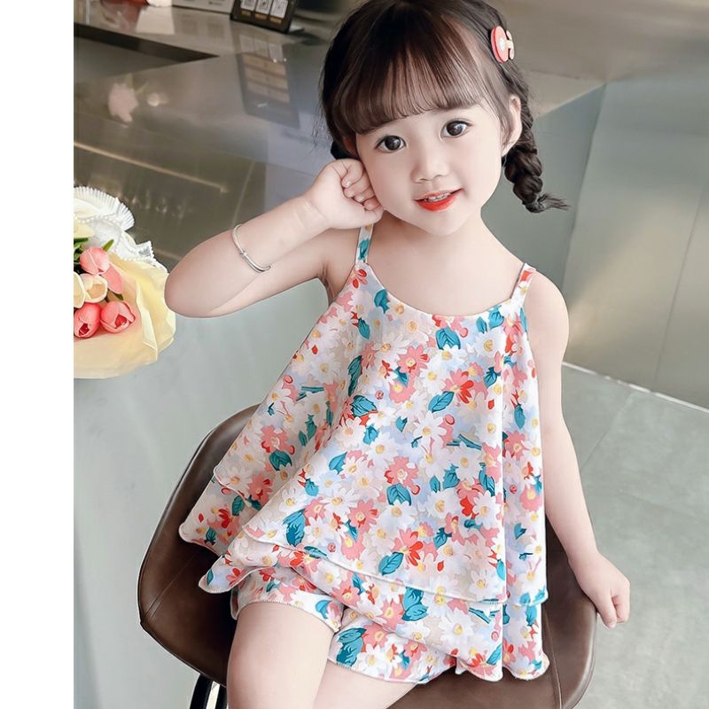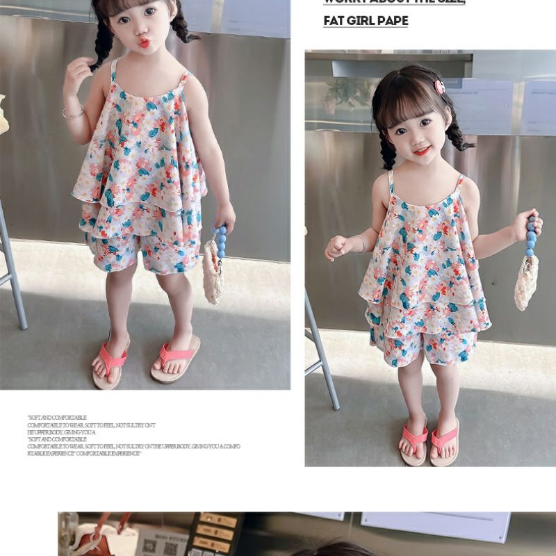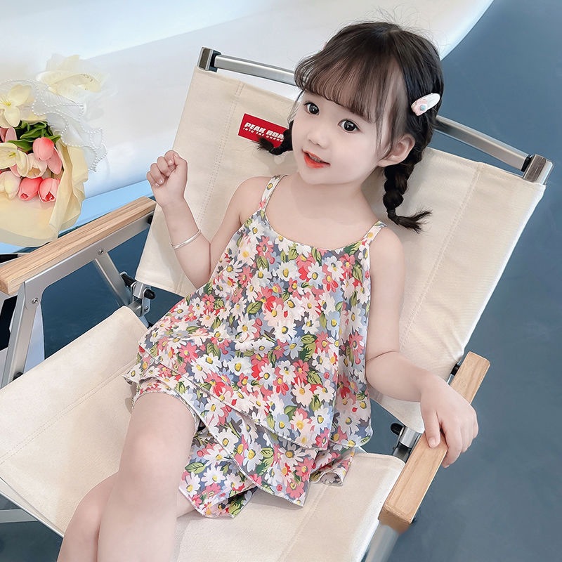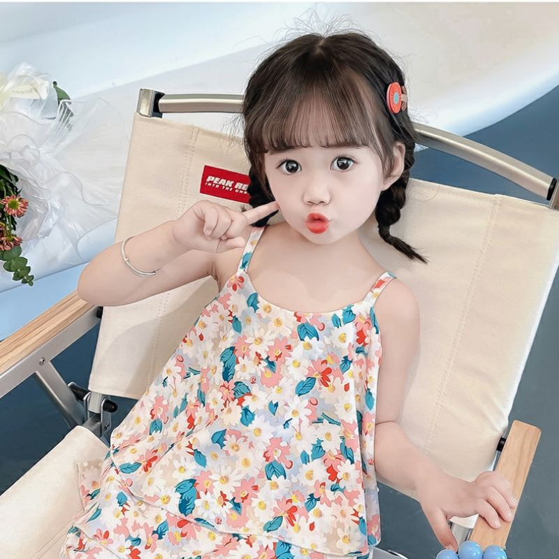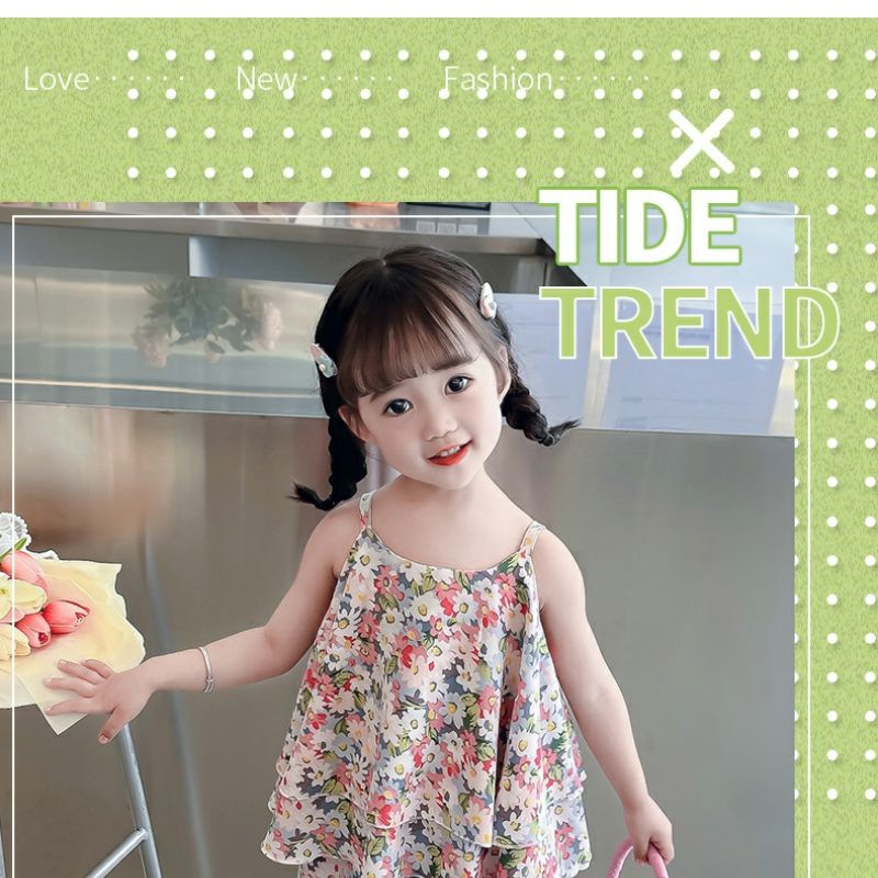 여름 여아 정장, 아기 스타일, 어린이 개성, 트렌디한 한국식 해변 꽃 조끼, 케이크 인형 셔츠 반바지스토어 가기