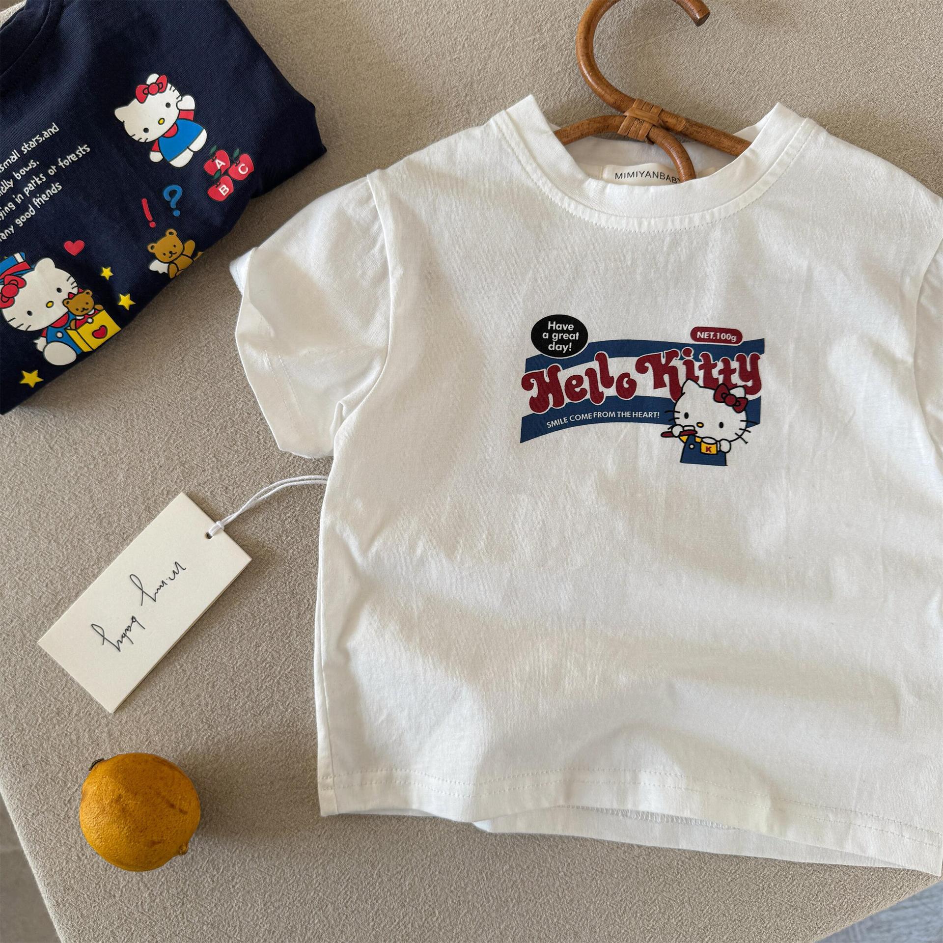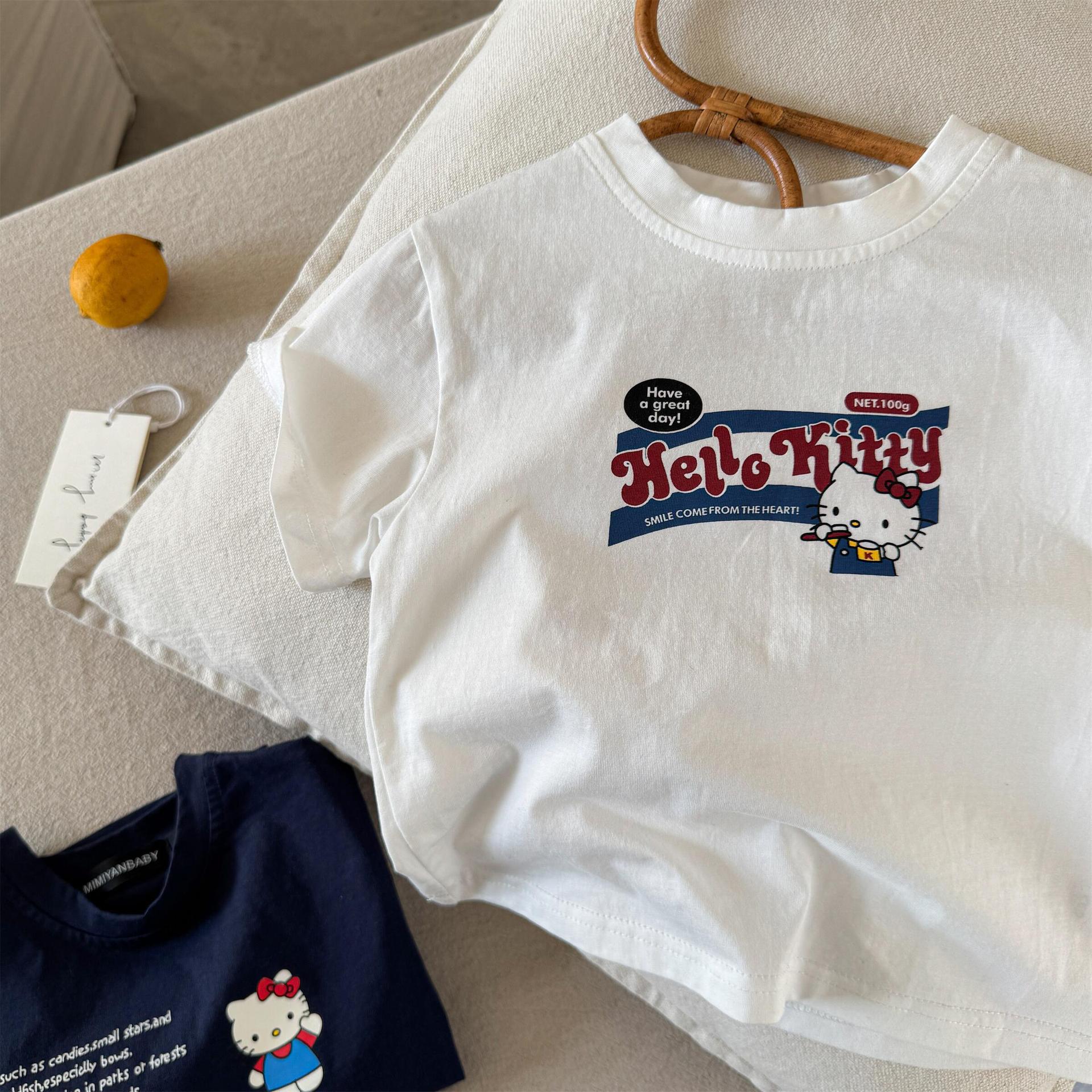 여자 반팔 티셔츠 면 여름 2025 새로운 한국 스타일 만화 KT 고양이 귀여운 탑 아기 느슨한 둥근 목