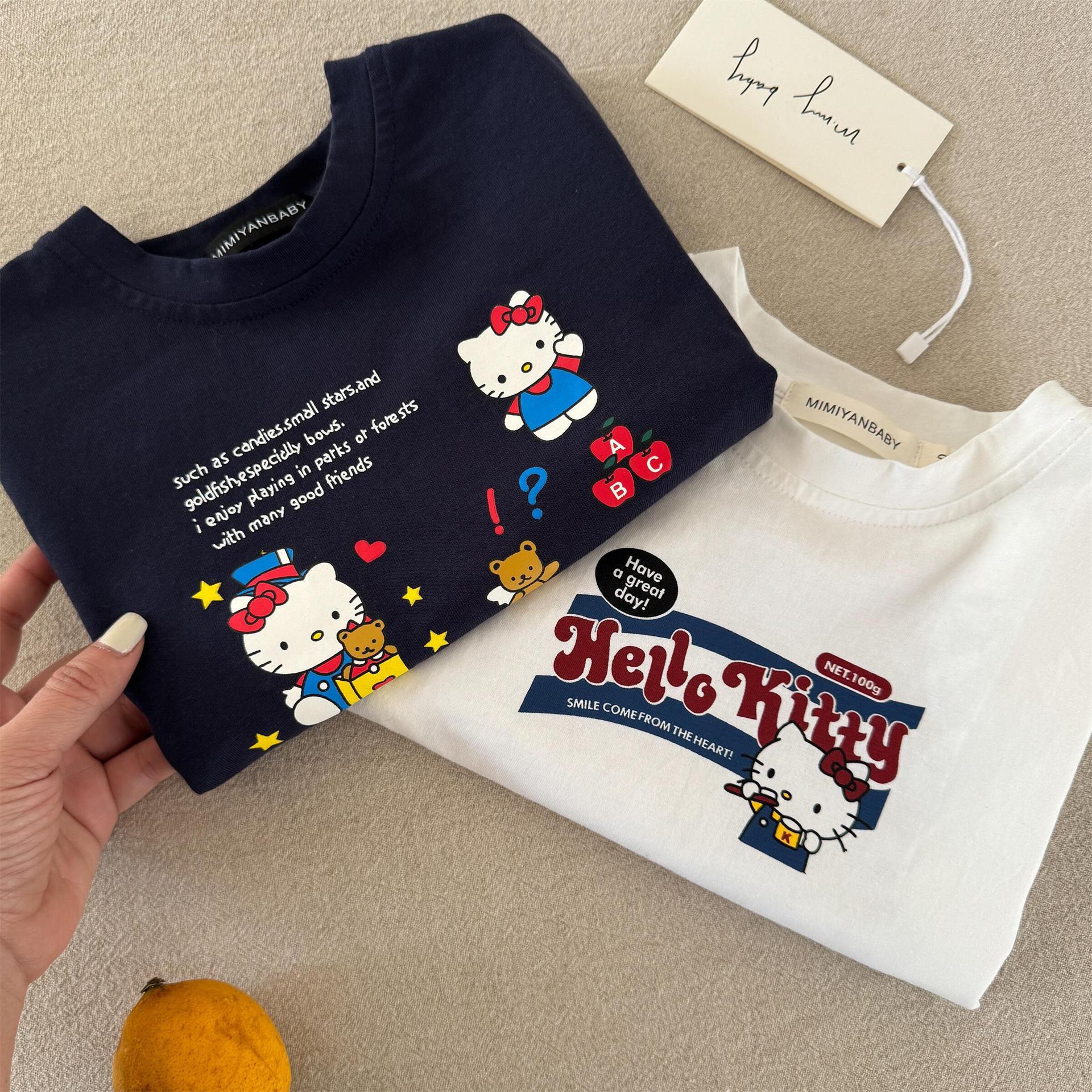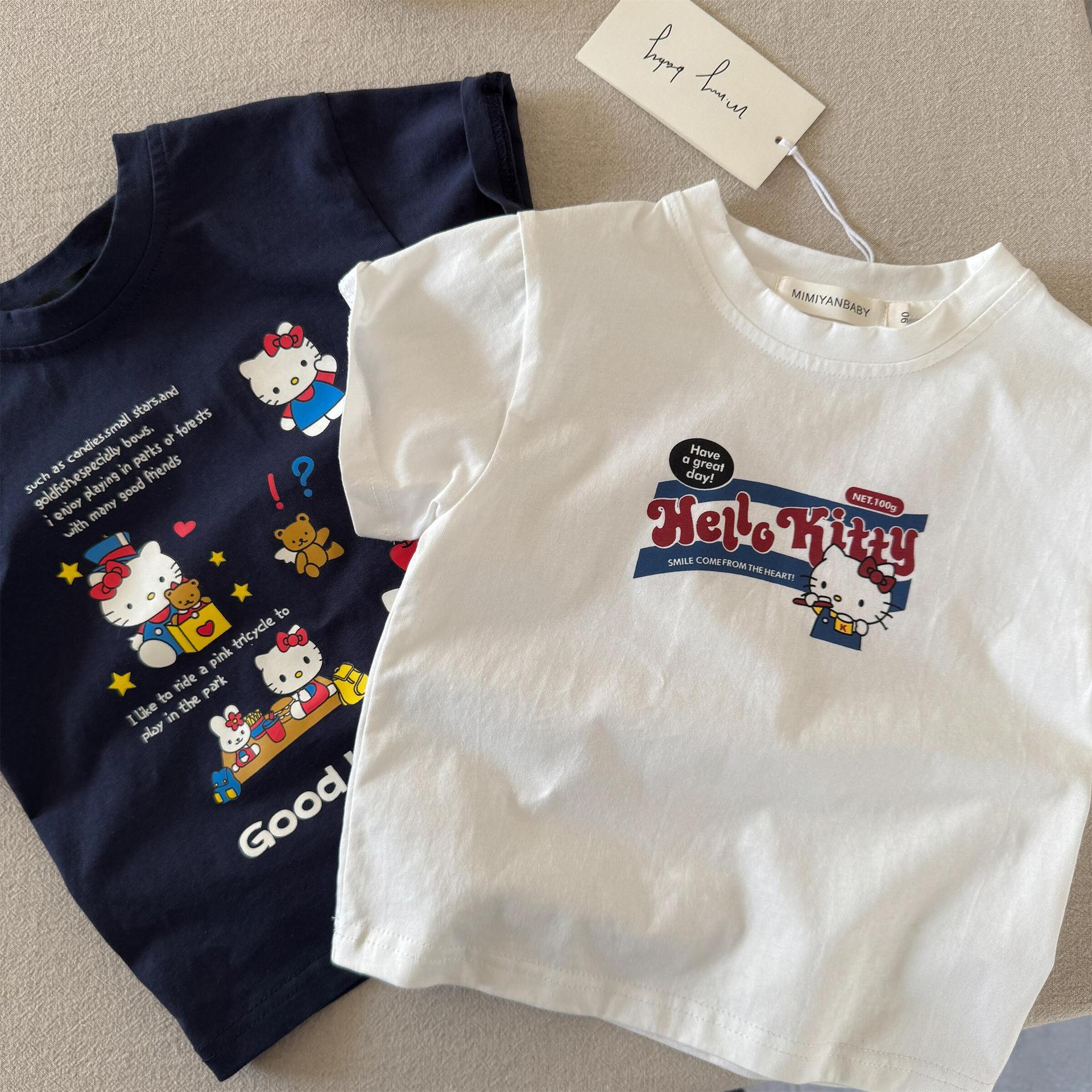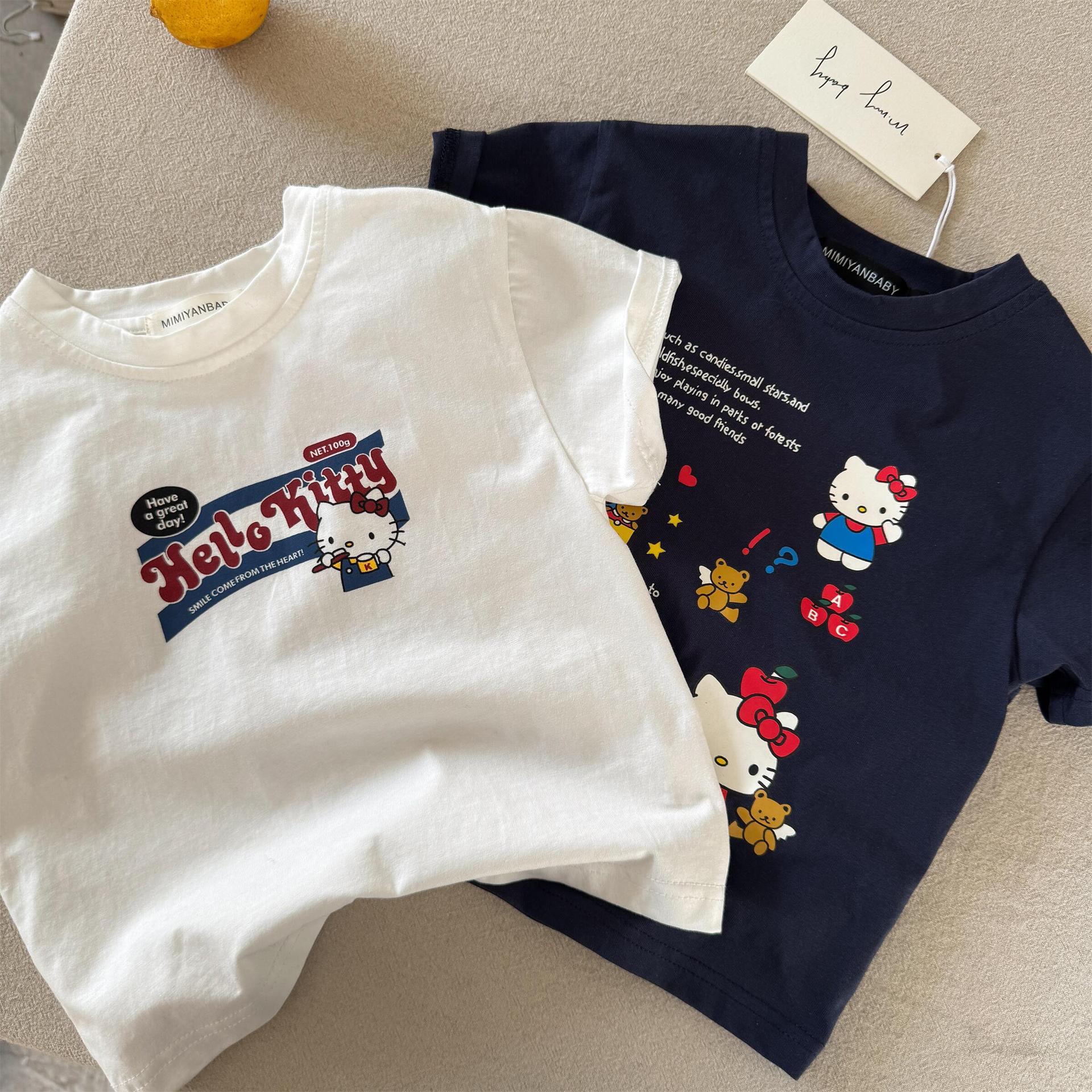 여자 반팔 티셔츠 면 여름 2025 새로운 한국 스타일 만화 KT 고양이 귀여운 탑 아기 느슨한 둥근 목스토어 가기