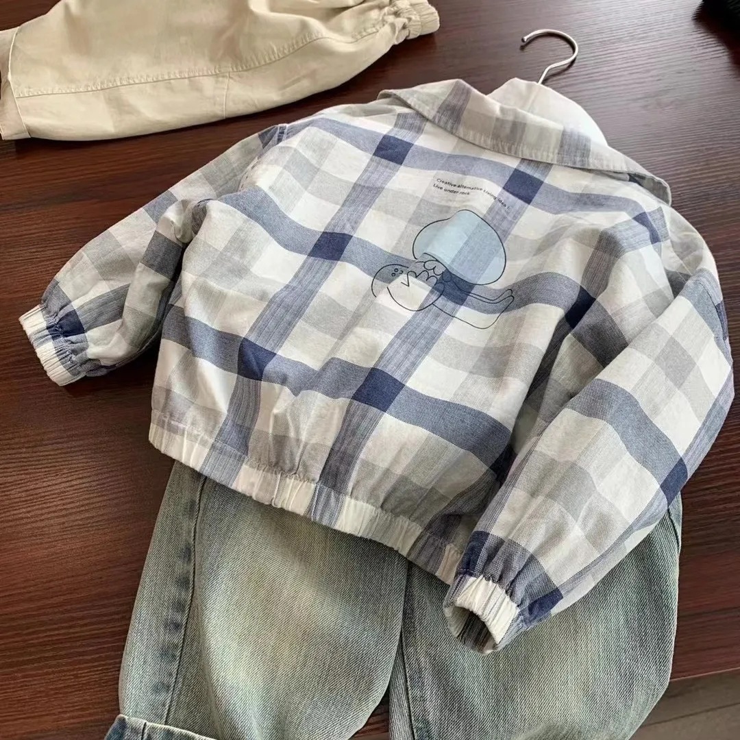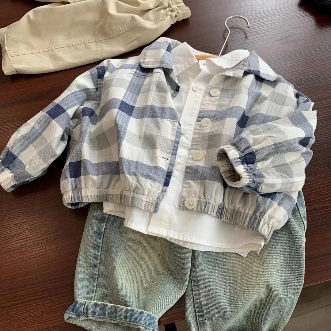 매우 부드럽고 편안합니다 ~ 봄 신작 아동 체크 무늬 재킷 한국 스타일 루즈 프린트 블루 체크 무늬 캐주얼 재킷 탑스토어 가기