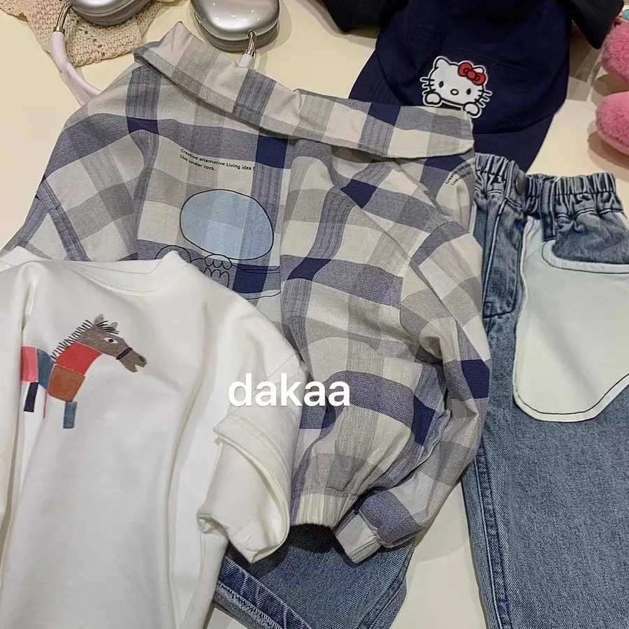 매우 부드럽고 편안합니다 ~ 봄 신작 아동 체크 무늬 재킷 한국 스타일 루즈 프린트 블루 체크 무늬 캐주얼 재킷 탑