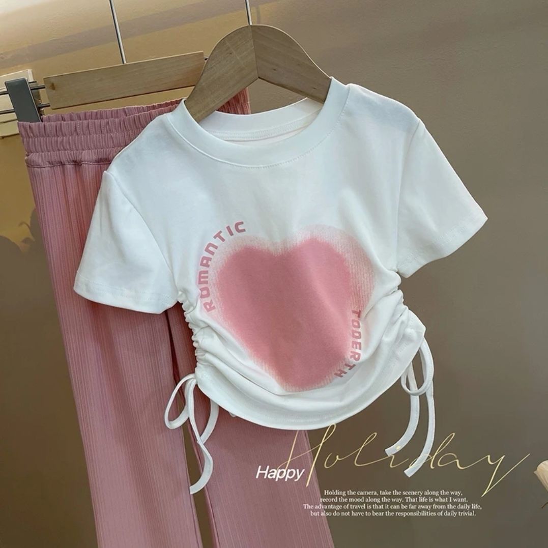 여성 아기의 한국식 캐주얼 세트 어린이 여름 새로운 세련된 러브 레터 탑 유행 바지 투피스 세트