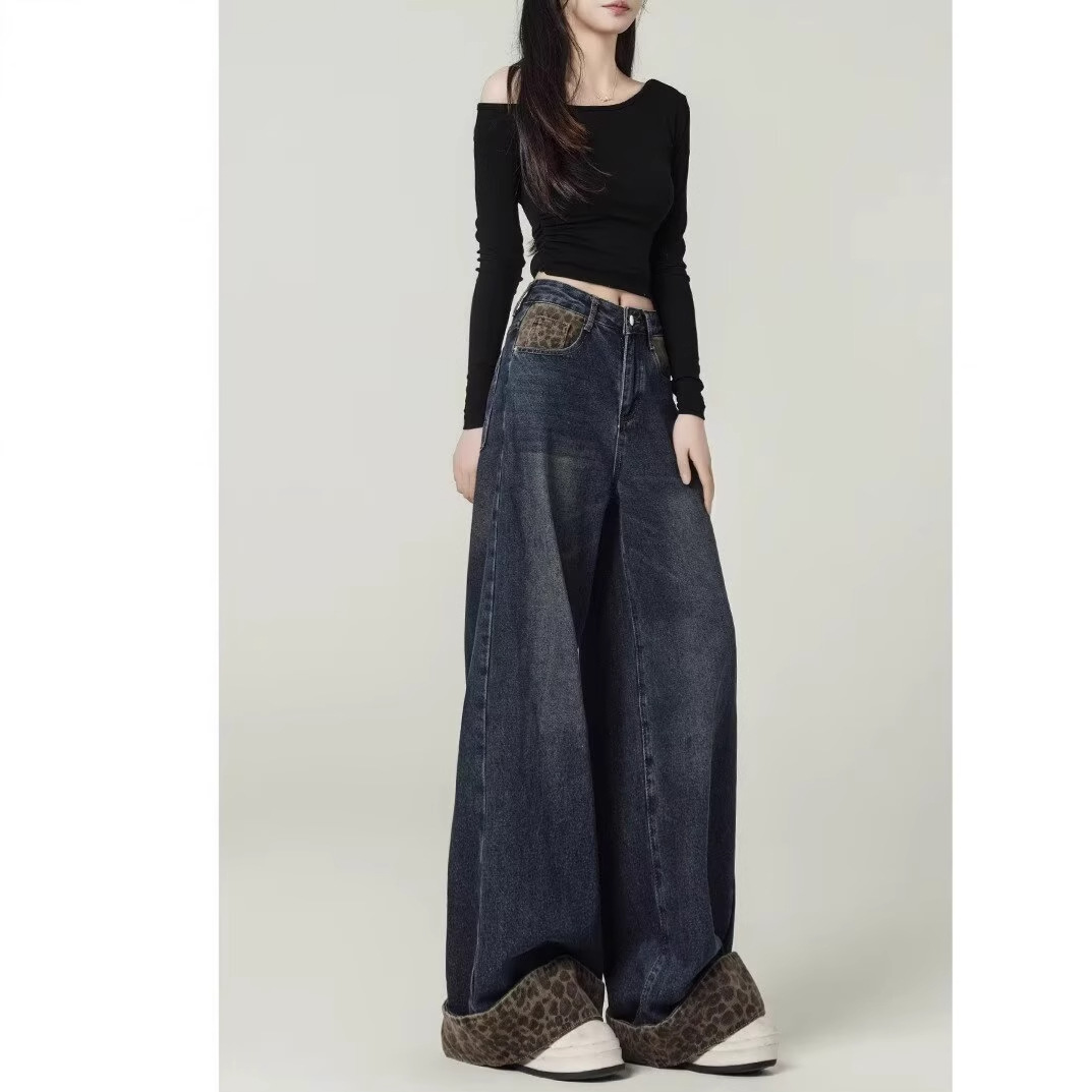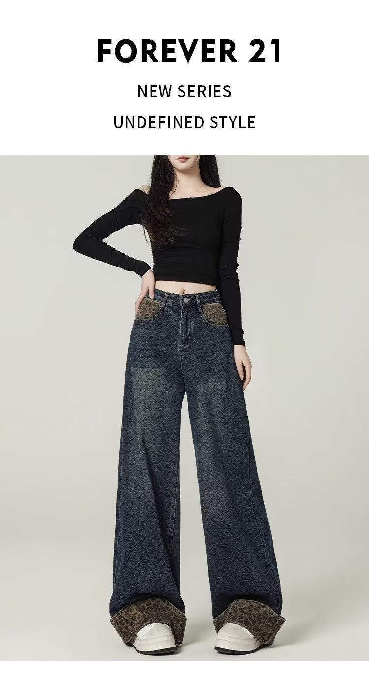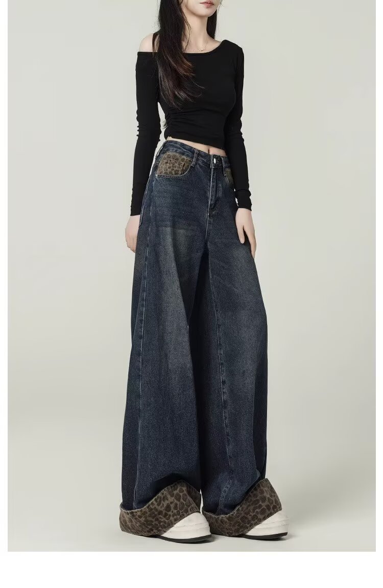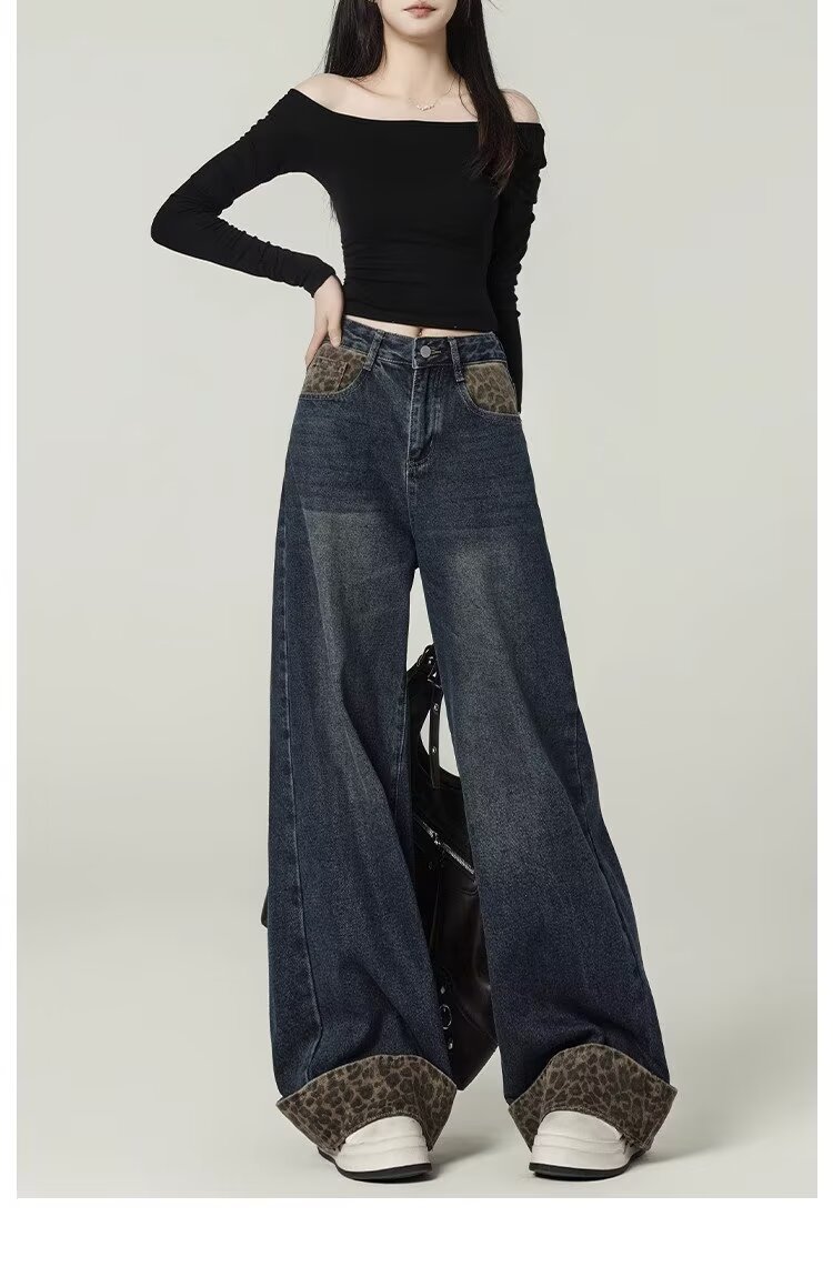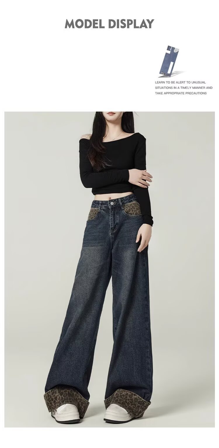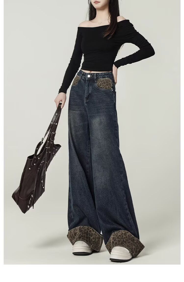 눈길을 끄는 레트로 스플라이스 레오파드 프린트 컬 진 여성용 가을 겨울 하이 웨이스트 슬림 루즈 와이드 레그 팬츠