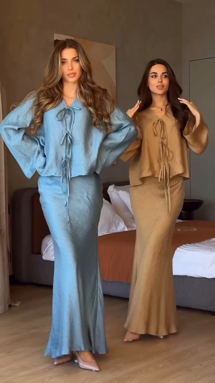 2025년 신상 여성 패션, 명품 스타일의 레이스업 탑과 슬림핏 힙허깅 스커트 투피스 세트
