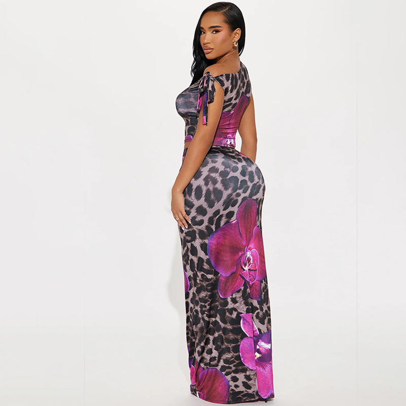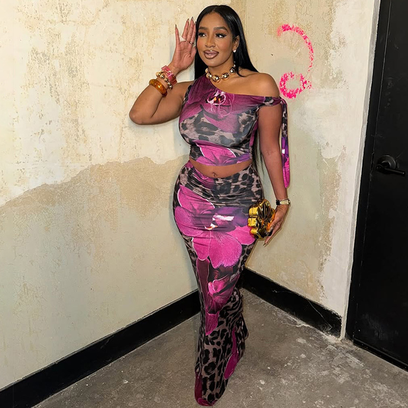 유럽과 미국의 국경 여성 2025 년 여름 새로운 슬림 핏 우아한 인쇄 슬란 트 칼라 탑 힙합 스커트 투피스 세트