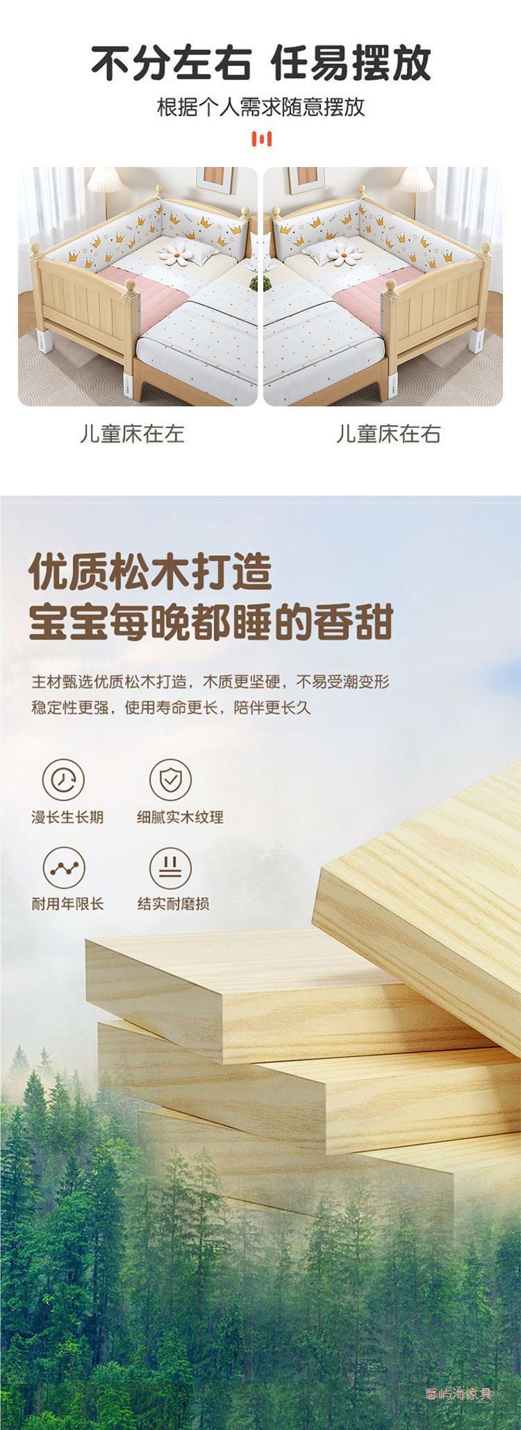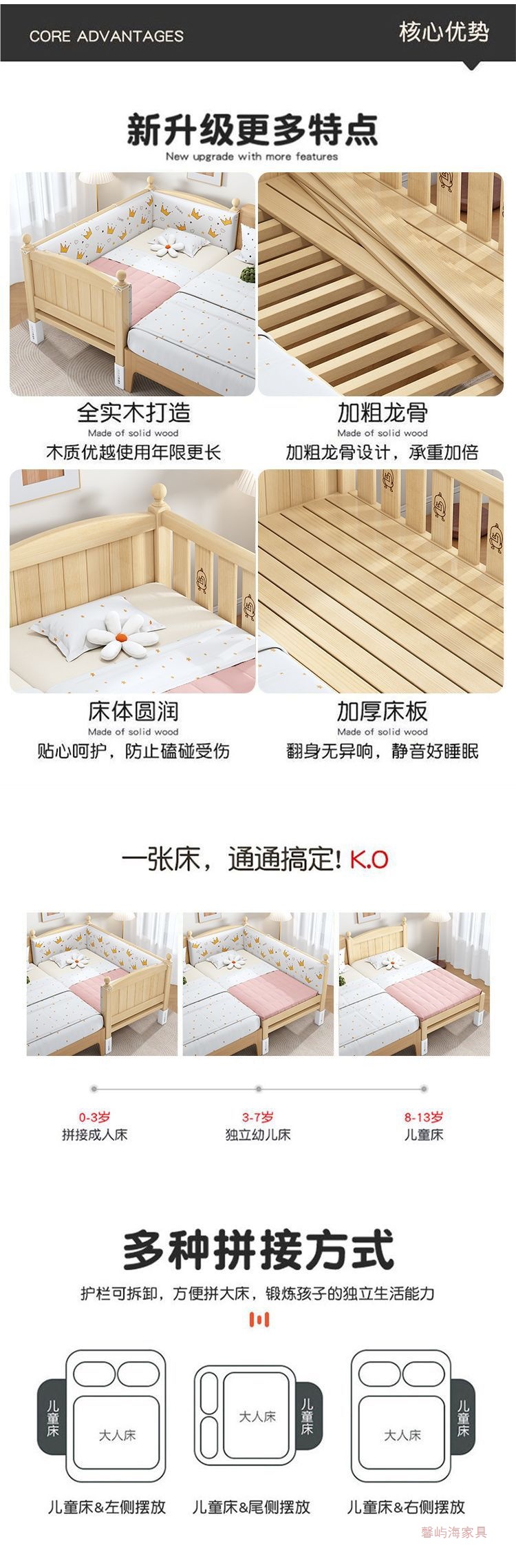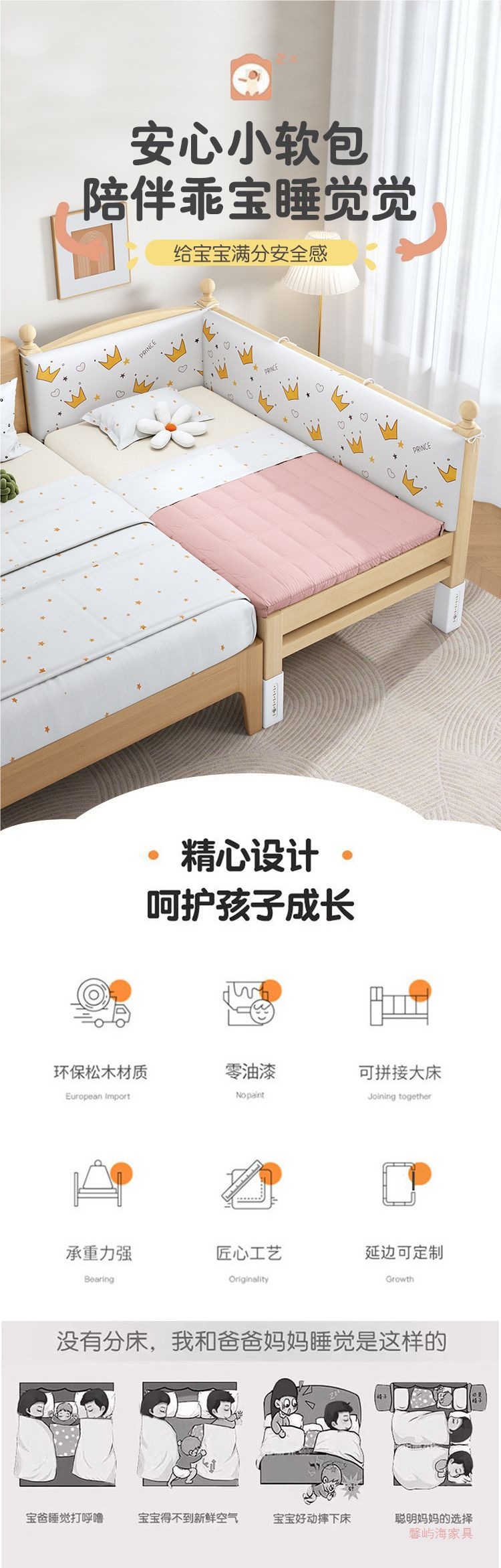 단단한 나무 접합 침대 넓은 큰 침대 옆 작은 침대 아기 소년과 소녀 어린이 침대 조절 가능한 유아용 침대스토어 가기