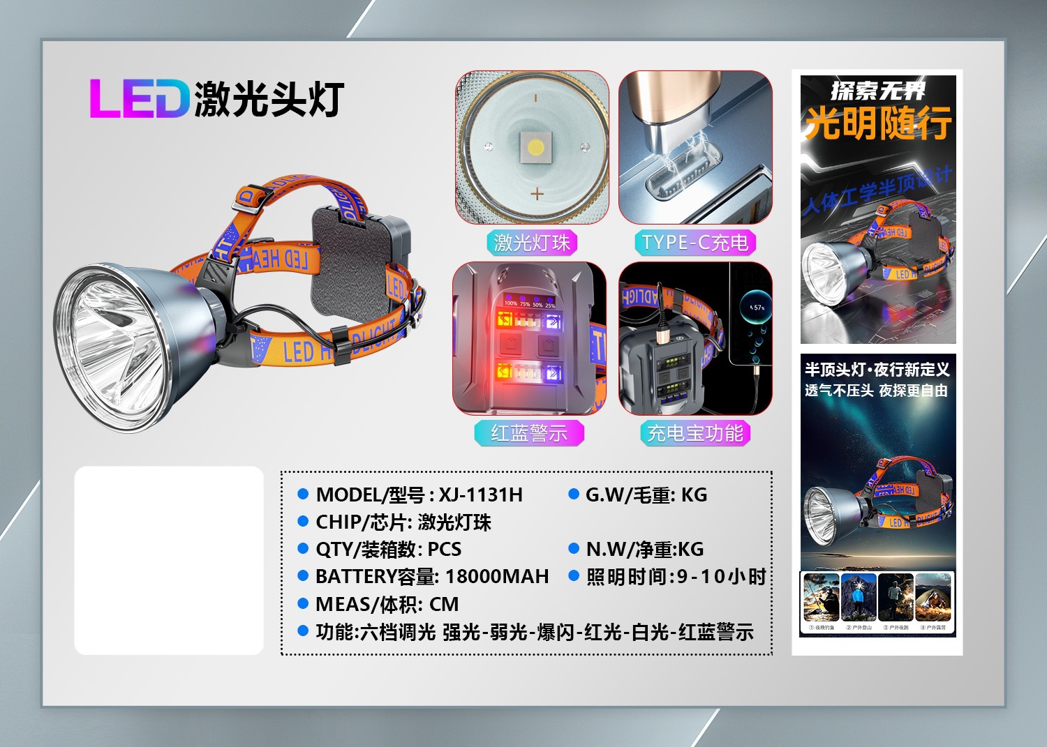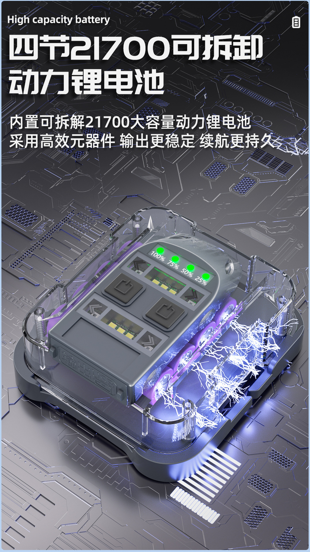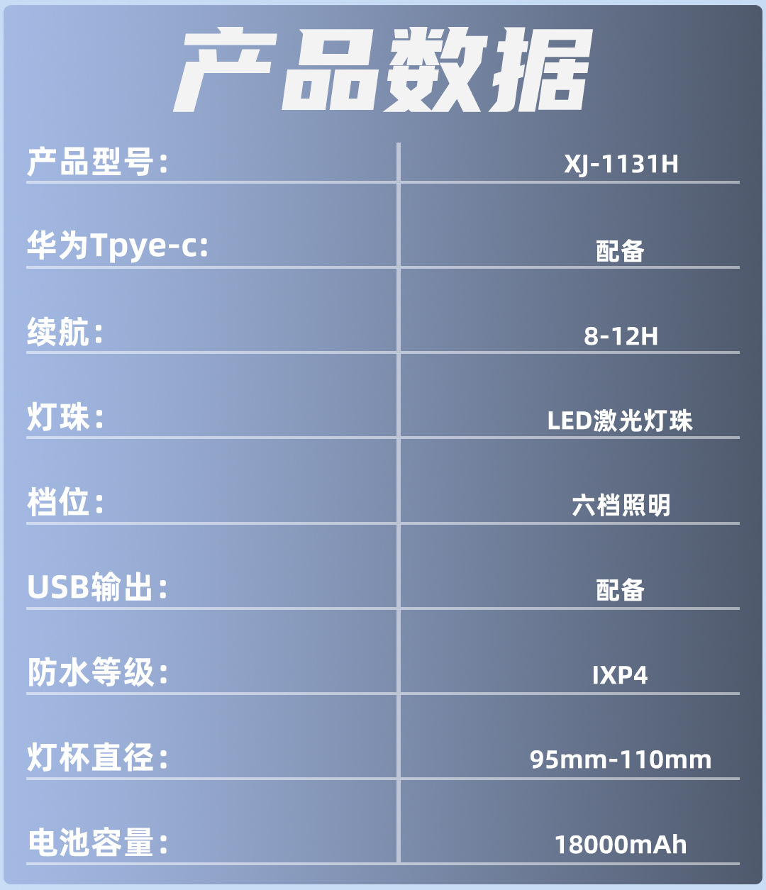 • XJ-1131H 밝기 감소 없음, 21700 리튬 배터리 4개, 18000mAh, 9시간 동안 정전류 방전