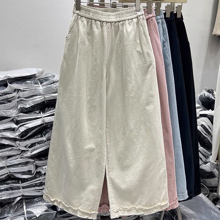 1.00 kg-150.00 kg 플러스 사이즈 레이스 스트레이트 와이드 레그 팬츠 여성용 지방 느슨한 슬리밍 올 매치 캐주얼 크롭 팬츠